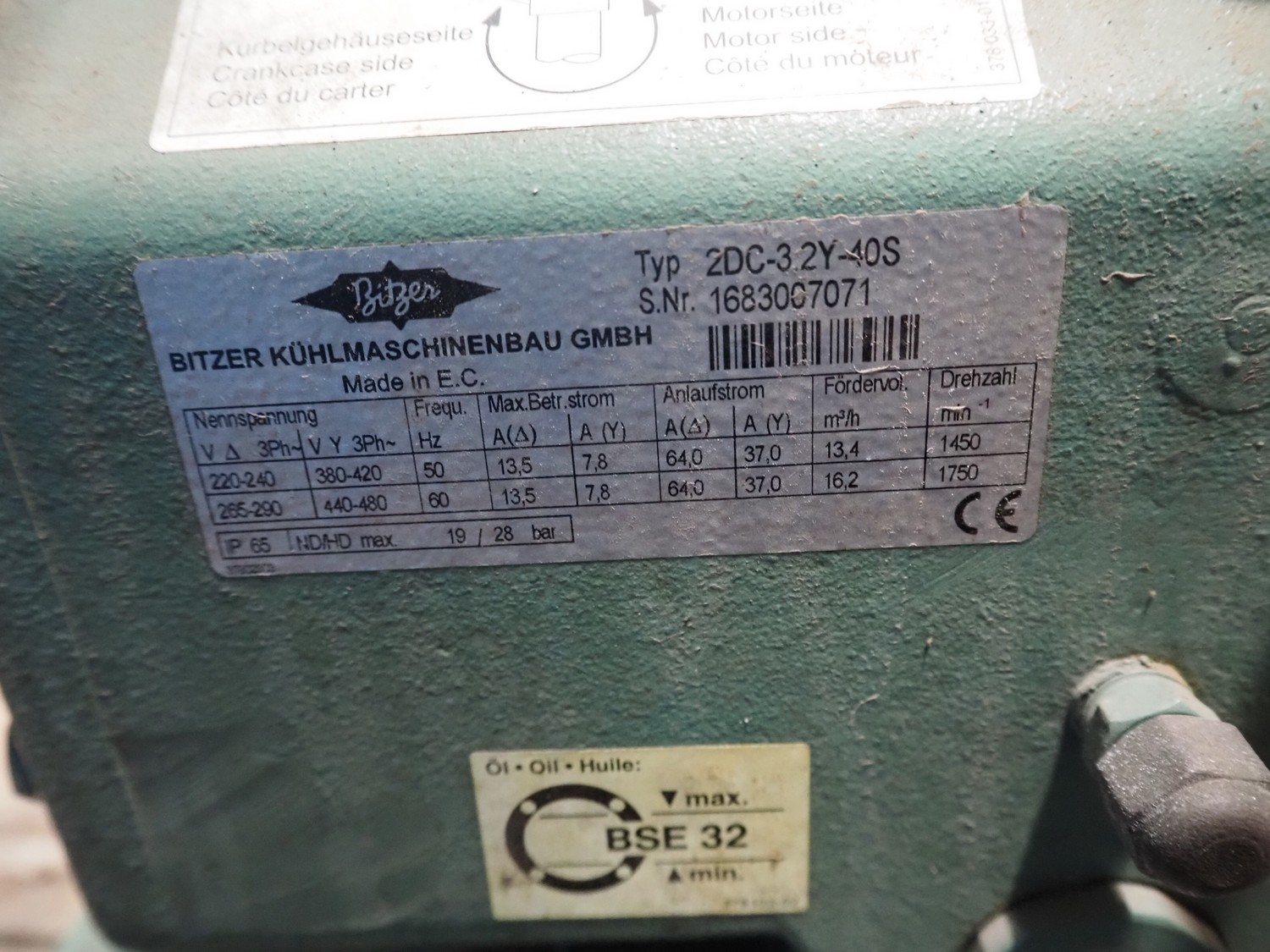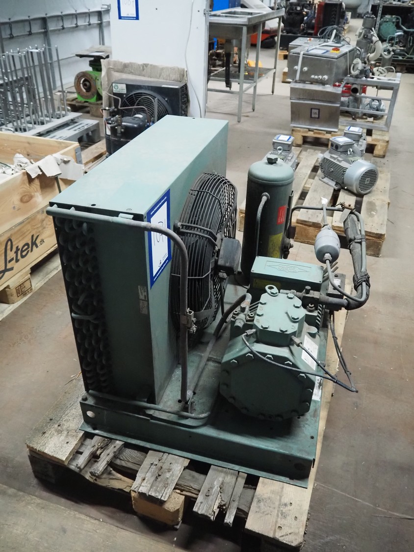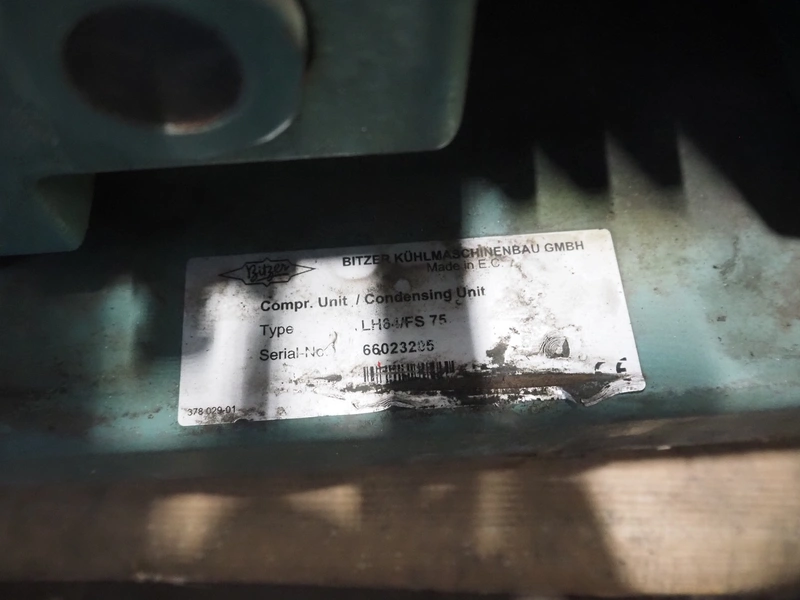 Bitzer Kühlmaschinenbau GmbH condensing unit with cooling compressor, type: LH64/FS 75, serial number: 66023205, type cooling compressor: 2DC-3.2Y-40S, serial number: 1683007071, capacity: 13.4/16.2 m³ per hour, dimensions: 750 mm x 700 mm x 560 mm.