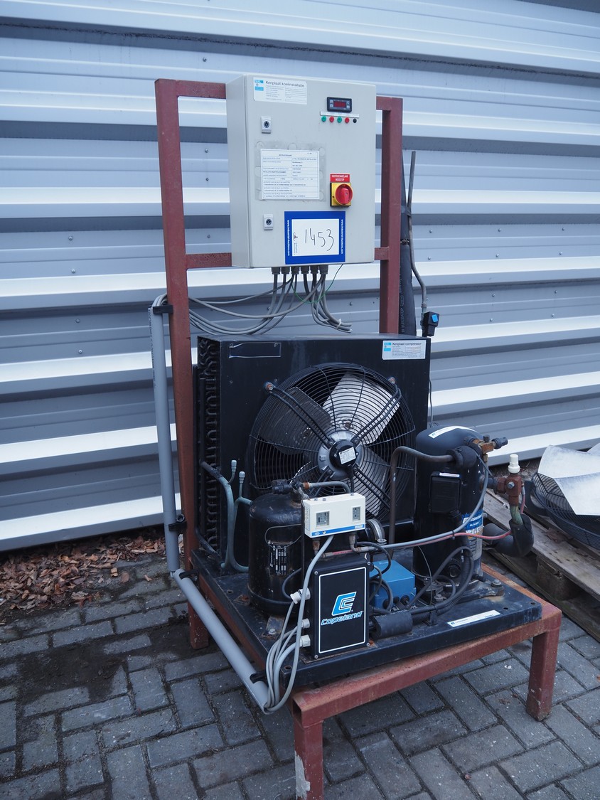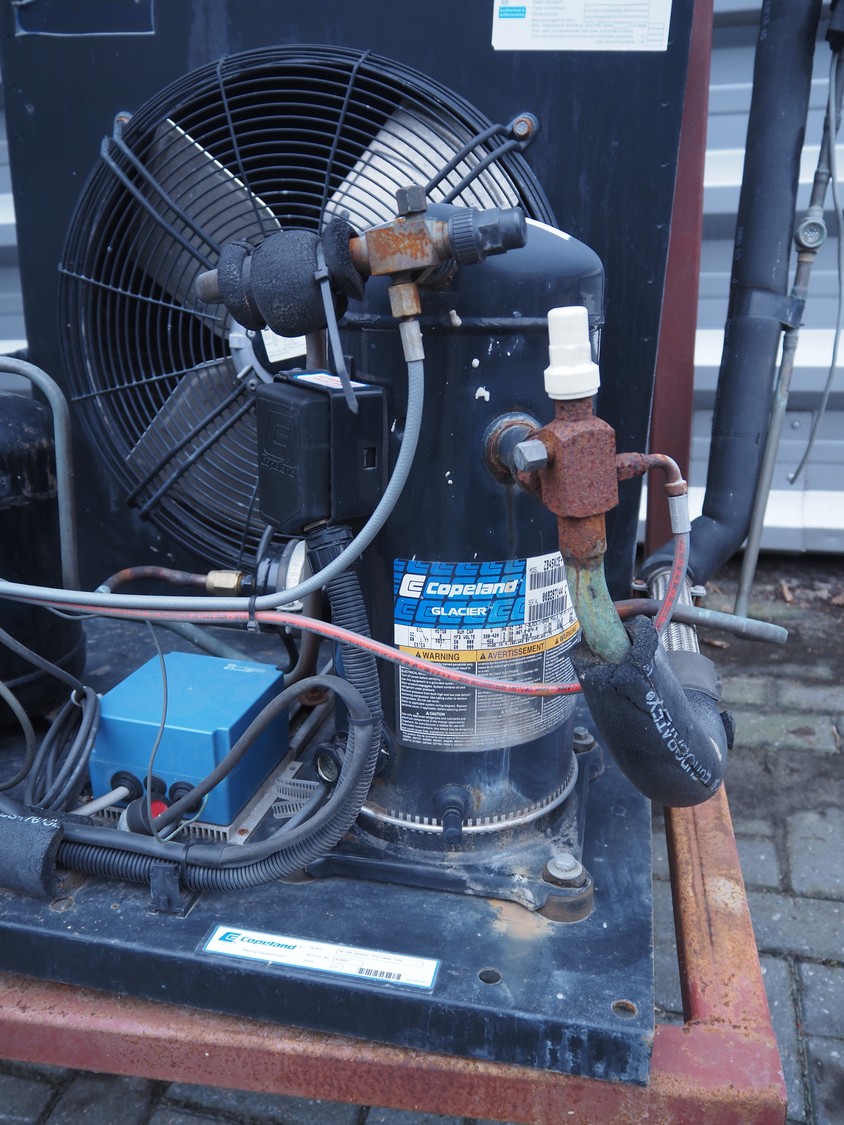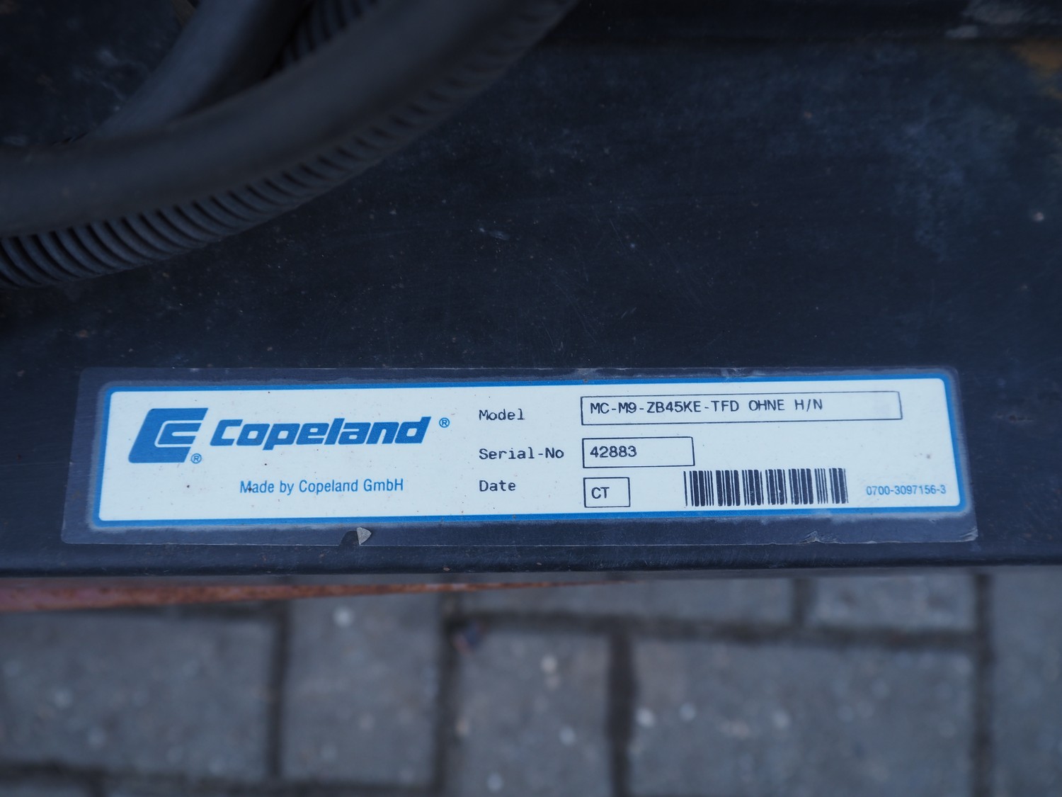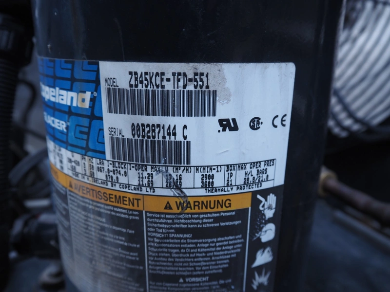 Copeland GmbH condensing and cooling unit, model: MC-M9-ZB45KE-TFD OHNE H/N, serial number: 42883, refrigerant: R 404a, 8 kg, dimensions: 1000 mm x 850 mm x 1770 mm.