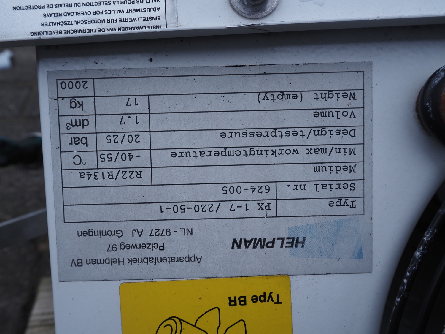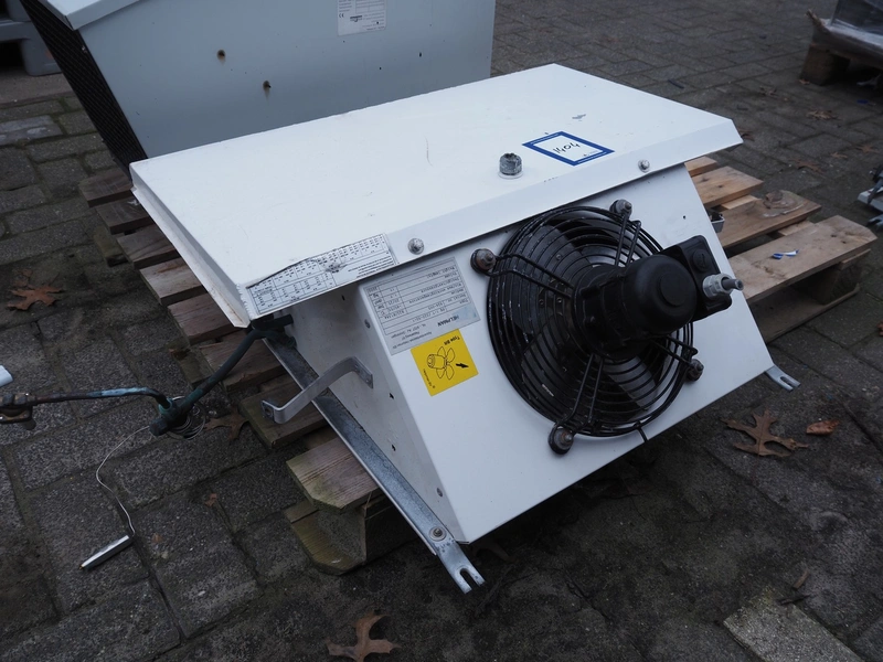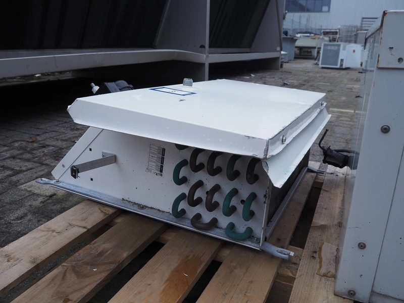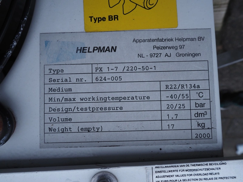 Helpman evaporator, type: PX 1-7, serial number: 624-005, year of construction: 2000, 220 V, 1 Ph, 50 Hz, refrigerant: R22 / R134a, dimensions: 750 mm x 670 mm x 270 mm.