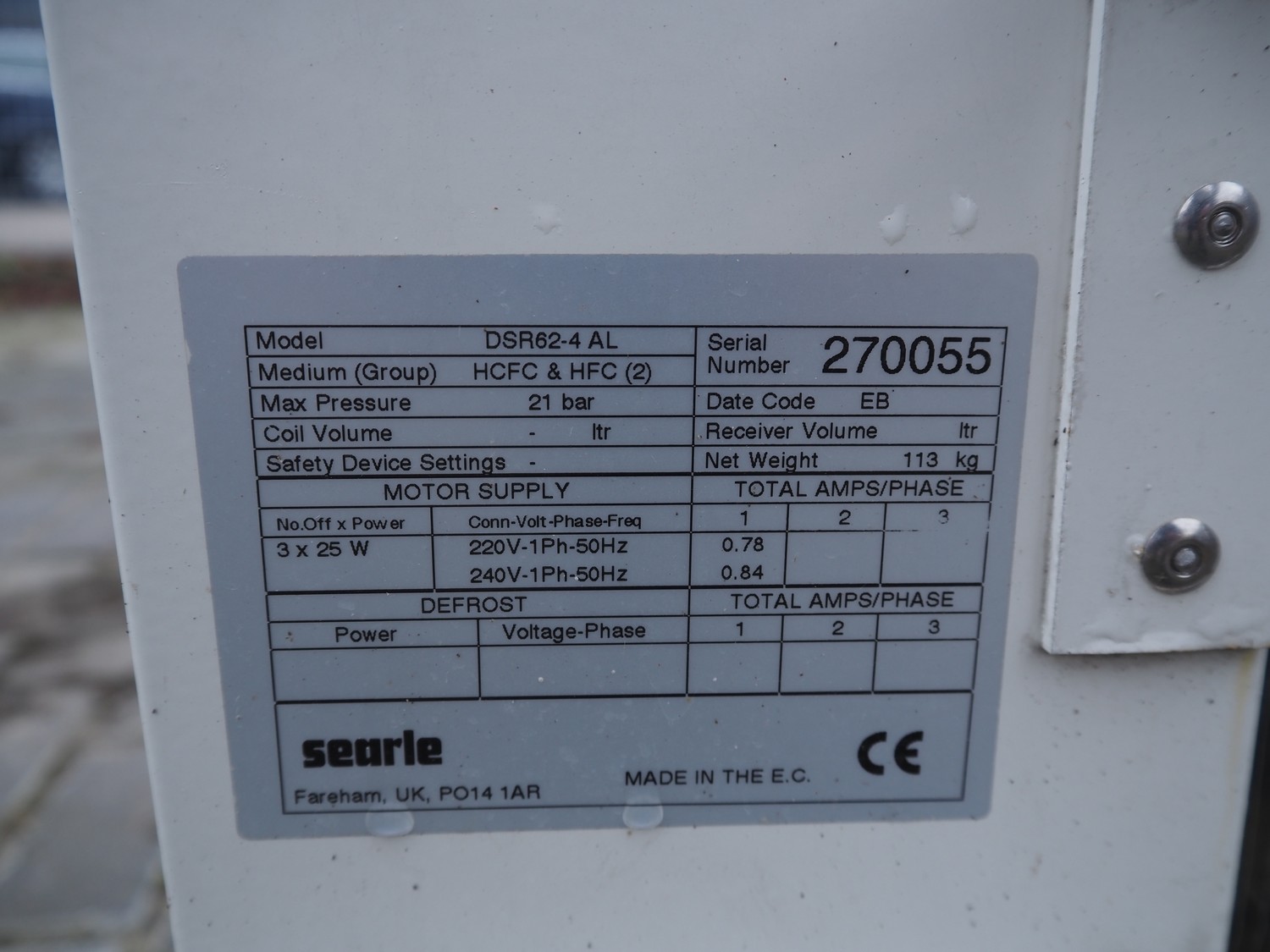 Searle evaporator, model: DSR62-4 AL, serial number: 270055, 220-240 V, 1 Ph, 50 Hz, 0.78-0.84 A, dimensions: 1820 mm x 930 mm x 400 mm.