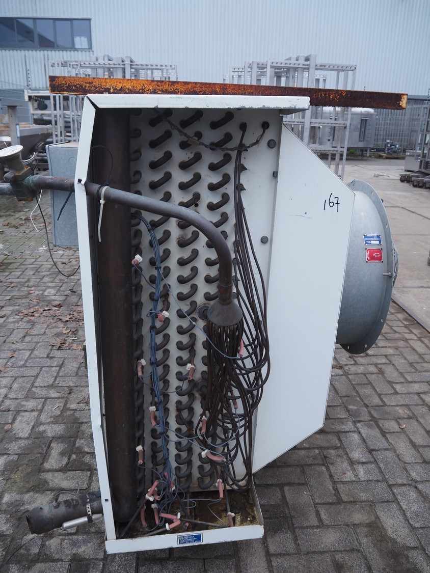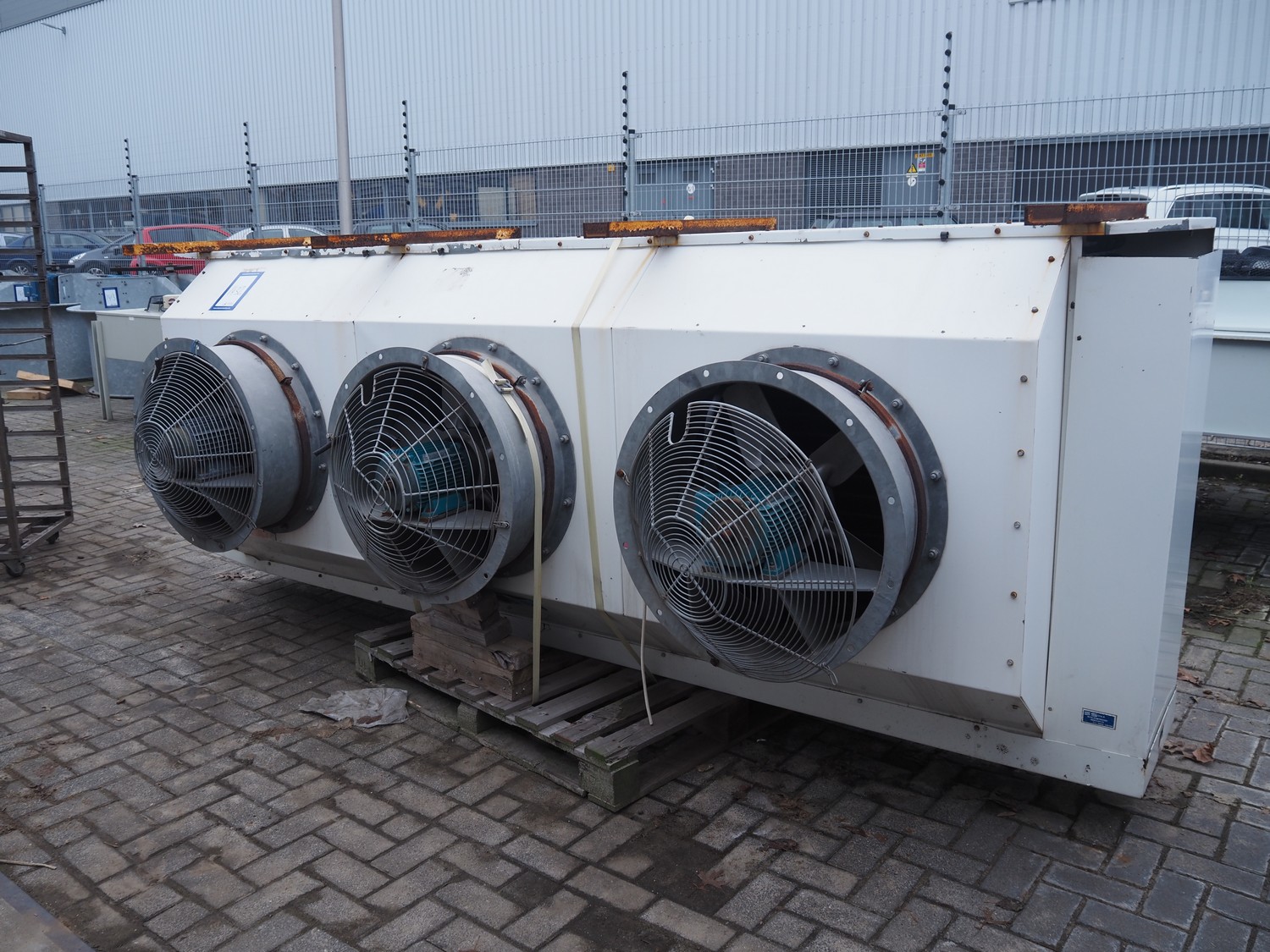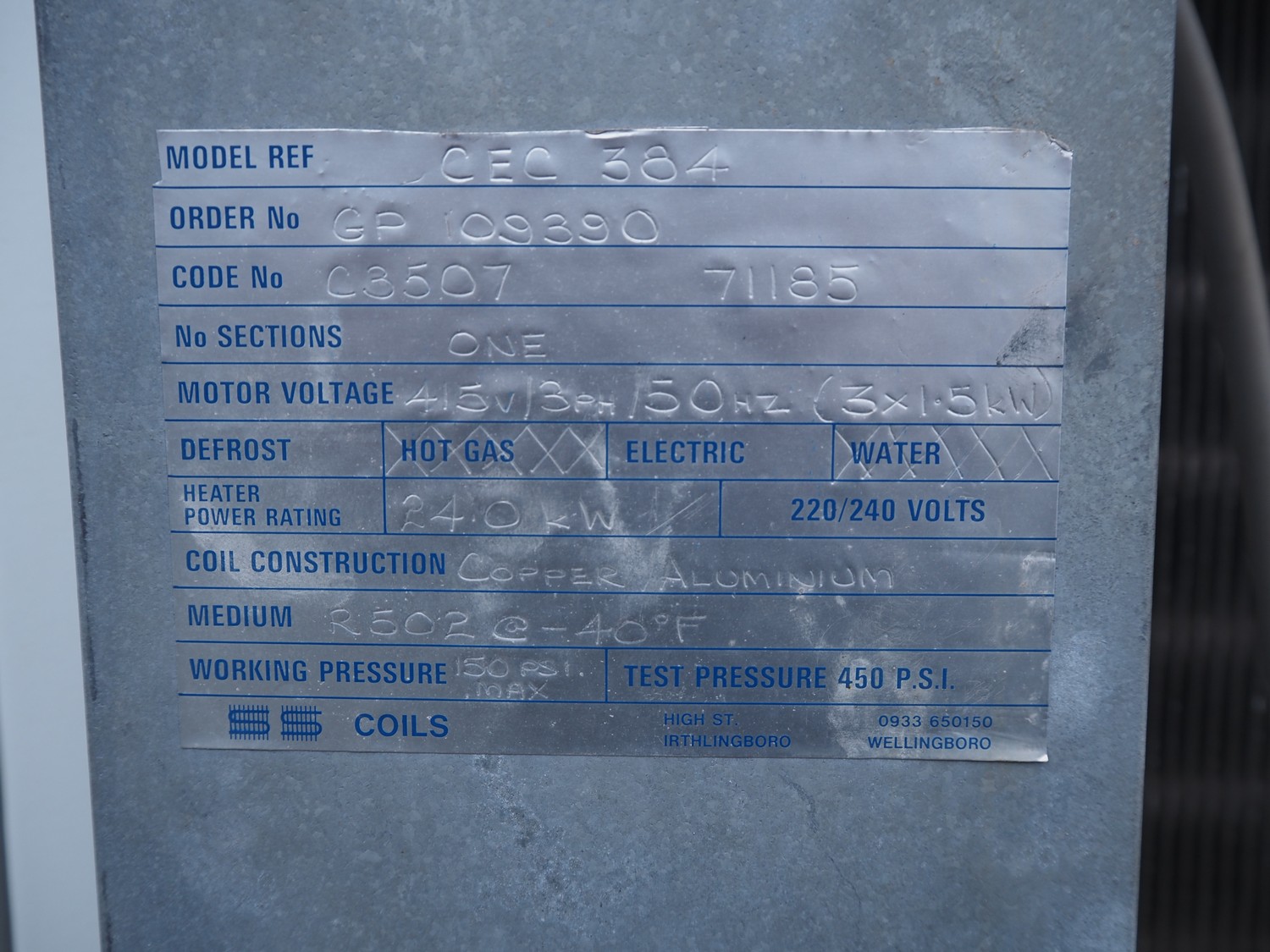 HC Coils evaporator, model: CEC 384, number: C3507 71185, 415 V, 3 Ph, 50 Hz, 24 kW, maximum work pressure: 150 P.S.I., 3 fans, dimensions: 3550 mm x 1370 mm x 1300 mm.