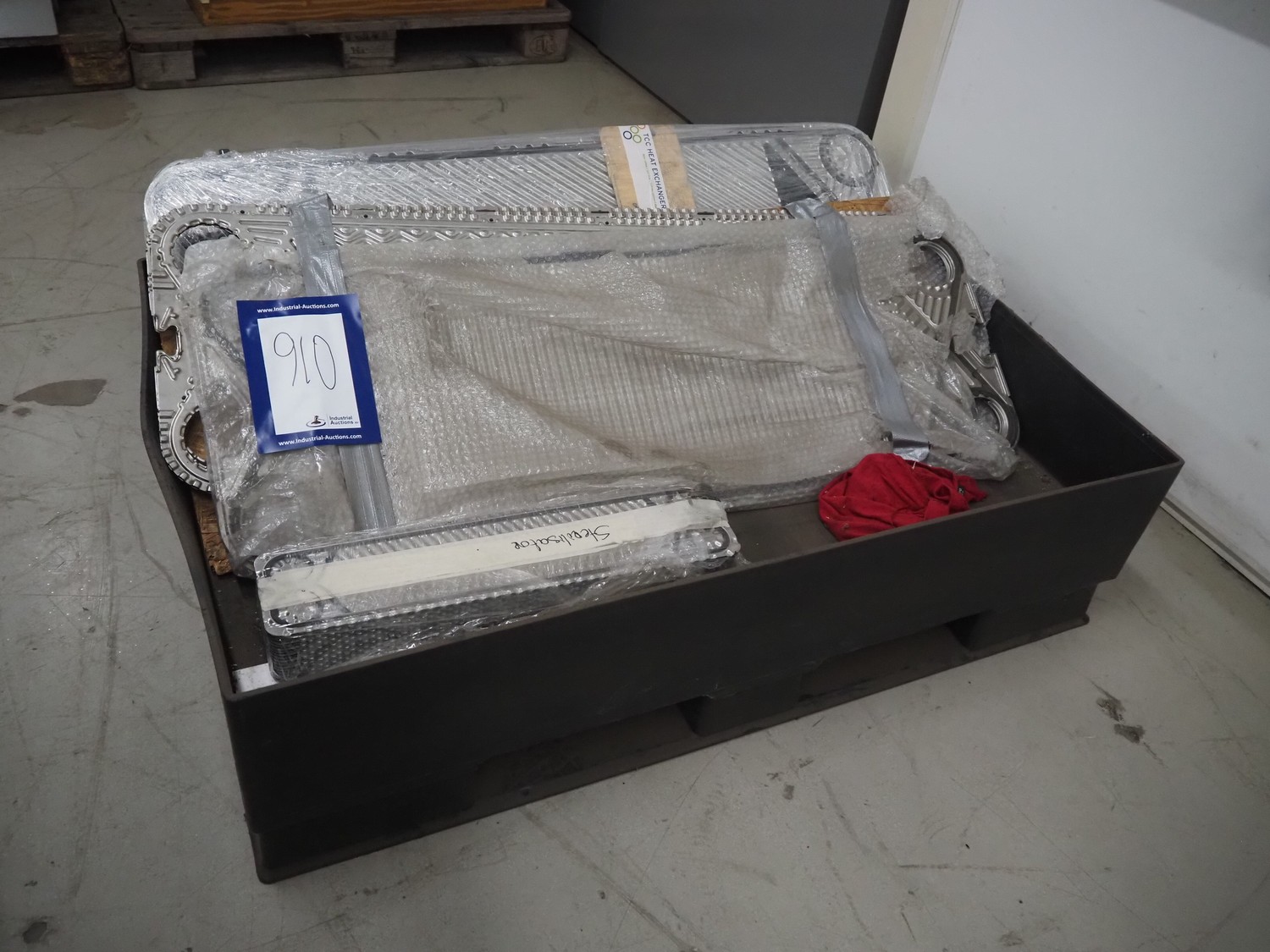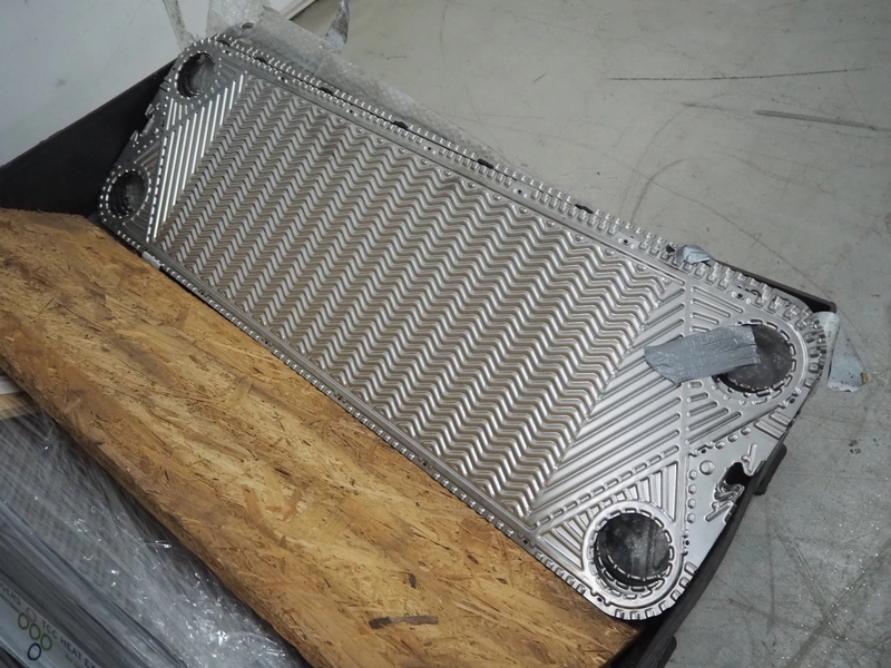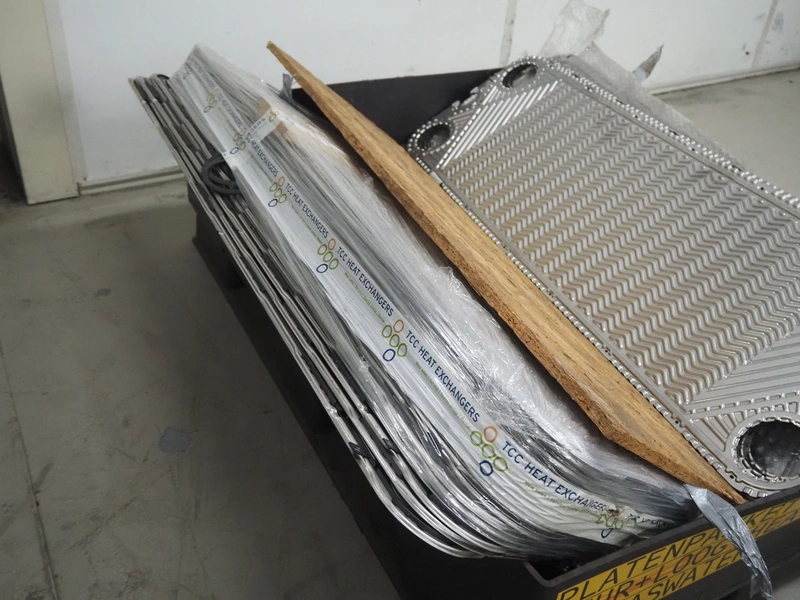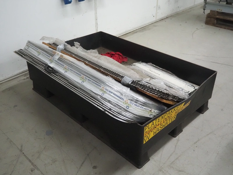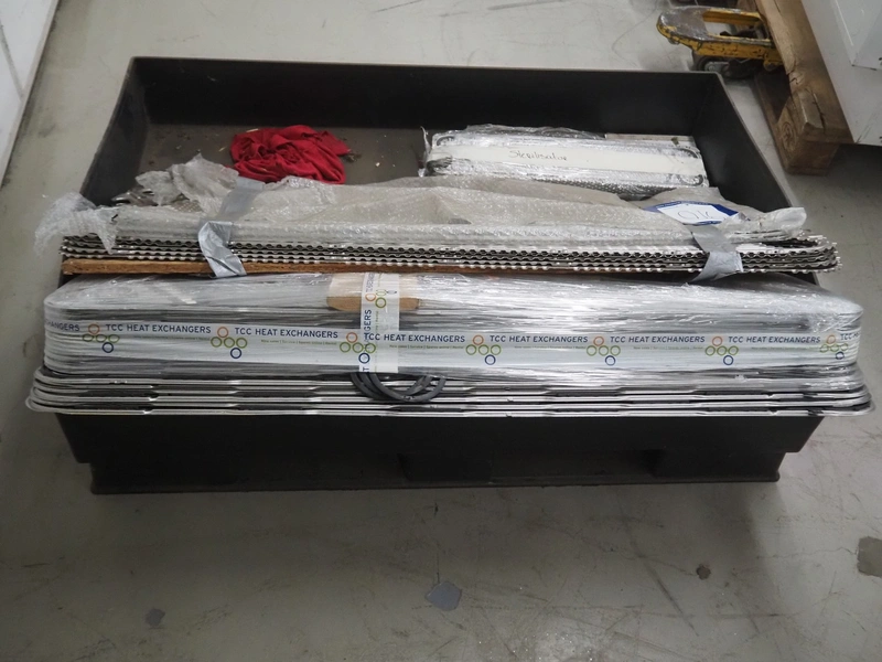 Pallet with plates for heat exchanger, dimensions 1 plate: 1150 mm x 400 mm, total dimensions: 1200 mm x 800 mm x 600 mm.