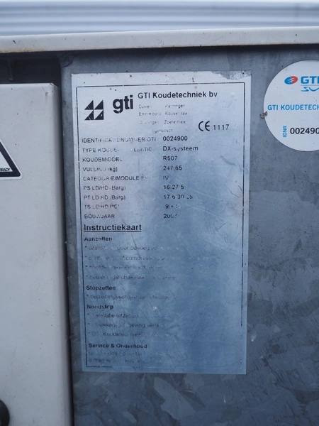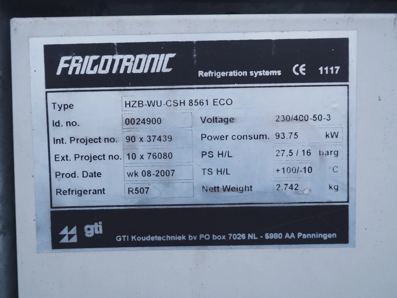 Frigotronic chiller, type: HZB-WU-CSH 8561 ECO, number: 0024900, year of construction: 08/2007, 230/400 V, 3 Ph, 50 Hz, 93.75 kW, weight: 2.742 kg, refrigerant: R507/247.65 kg, dimensions: 2500 mm x 1500 mm x 1550 mm.