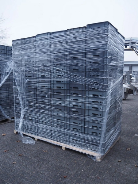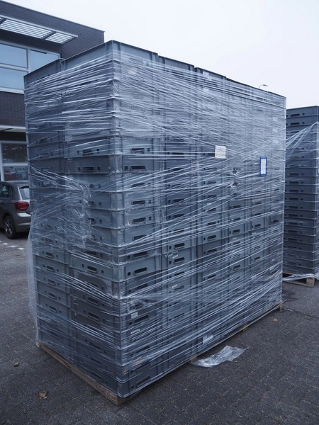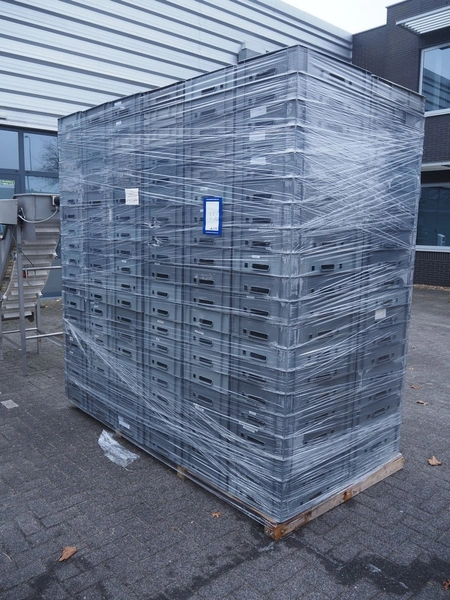Pallet with 240 plastic crates, dimensions each crate: 600 mm x 400 mm x 110 mm, total dimensions: 2400 mm x 1200 mm x 2400 mm.