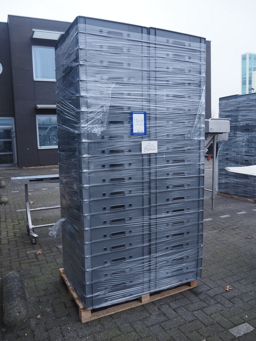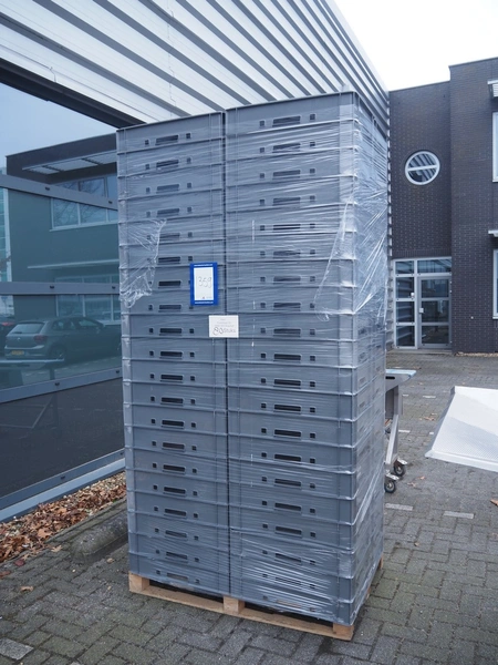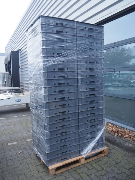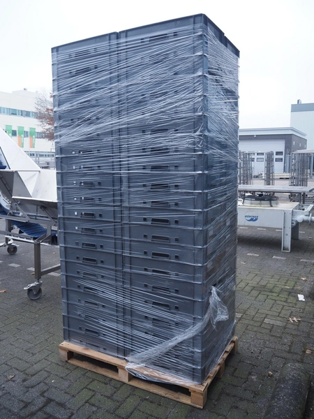 Pallet with 80 plastic crates, dimensions each crate: 600 mm x 400 mm x 110 mm, total dimensions: 1200 mm x 800 mm x 2400 mm.