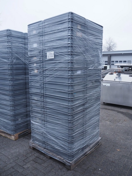 Pallet with 80 plastic crates, dimensions each crate: 600 mm x 400 mm x 110 mm, total dimensions: 1200 mm x 800 mm x 2400 mm.