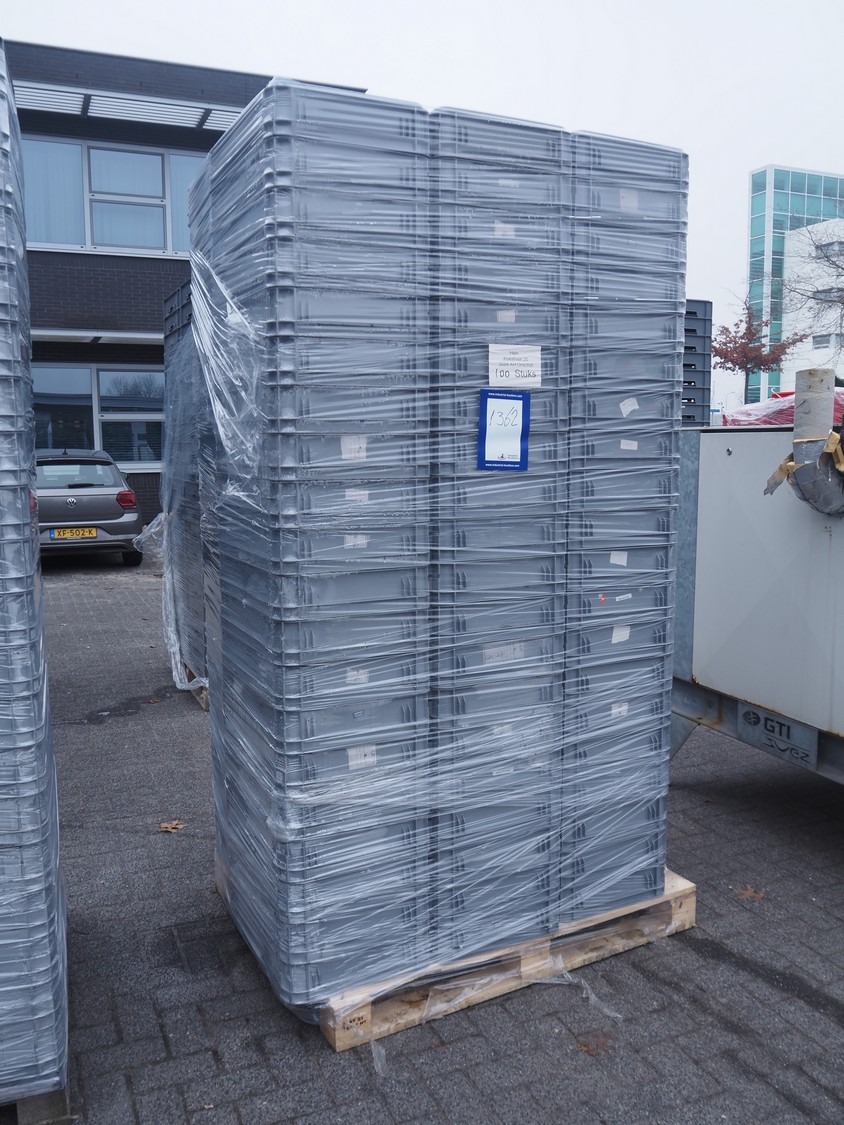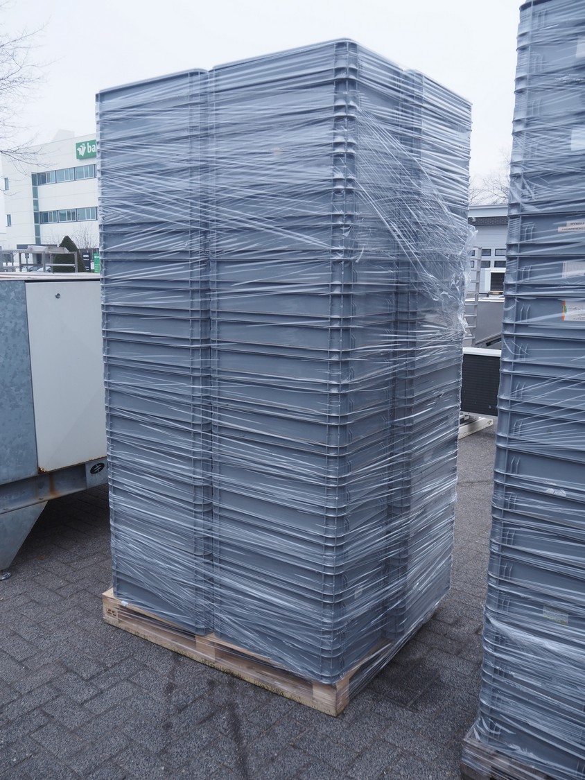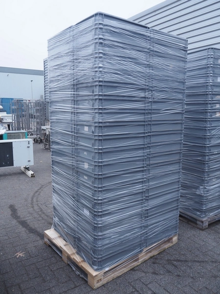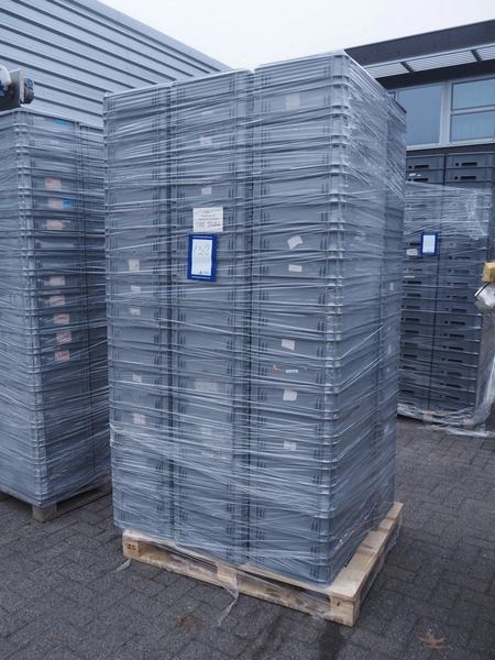 Pallet with 100 plastic crates, dimensions each crate: 600 mm x 400 mm x 110 mm, total dimensions: 1200 mm x 800 mm x 2400 mm.