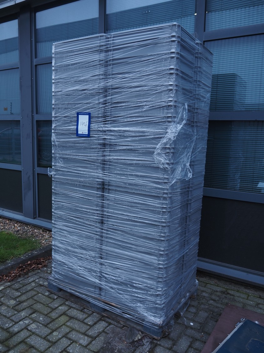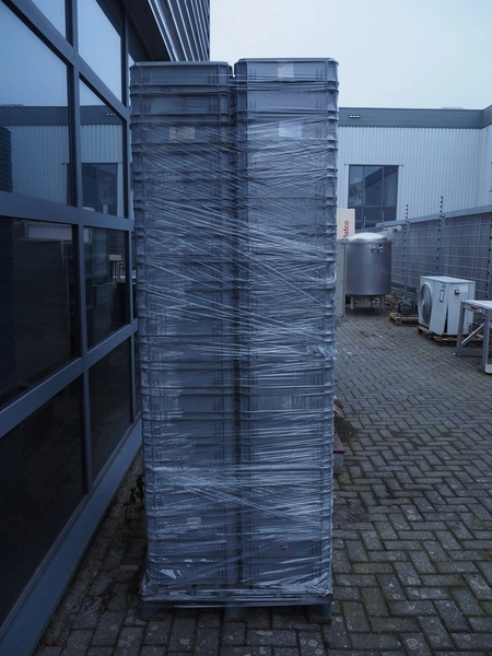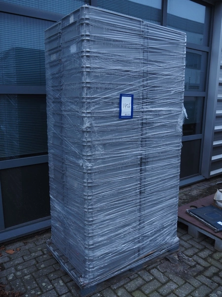 Pallet with 80 plastic crates, dimensions each crate: 600 mm x 400 mm x 110 mm, total dimensions: 1200 mm x 800 mm x 2400 mm.
