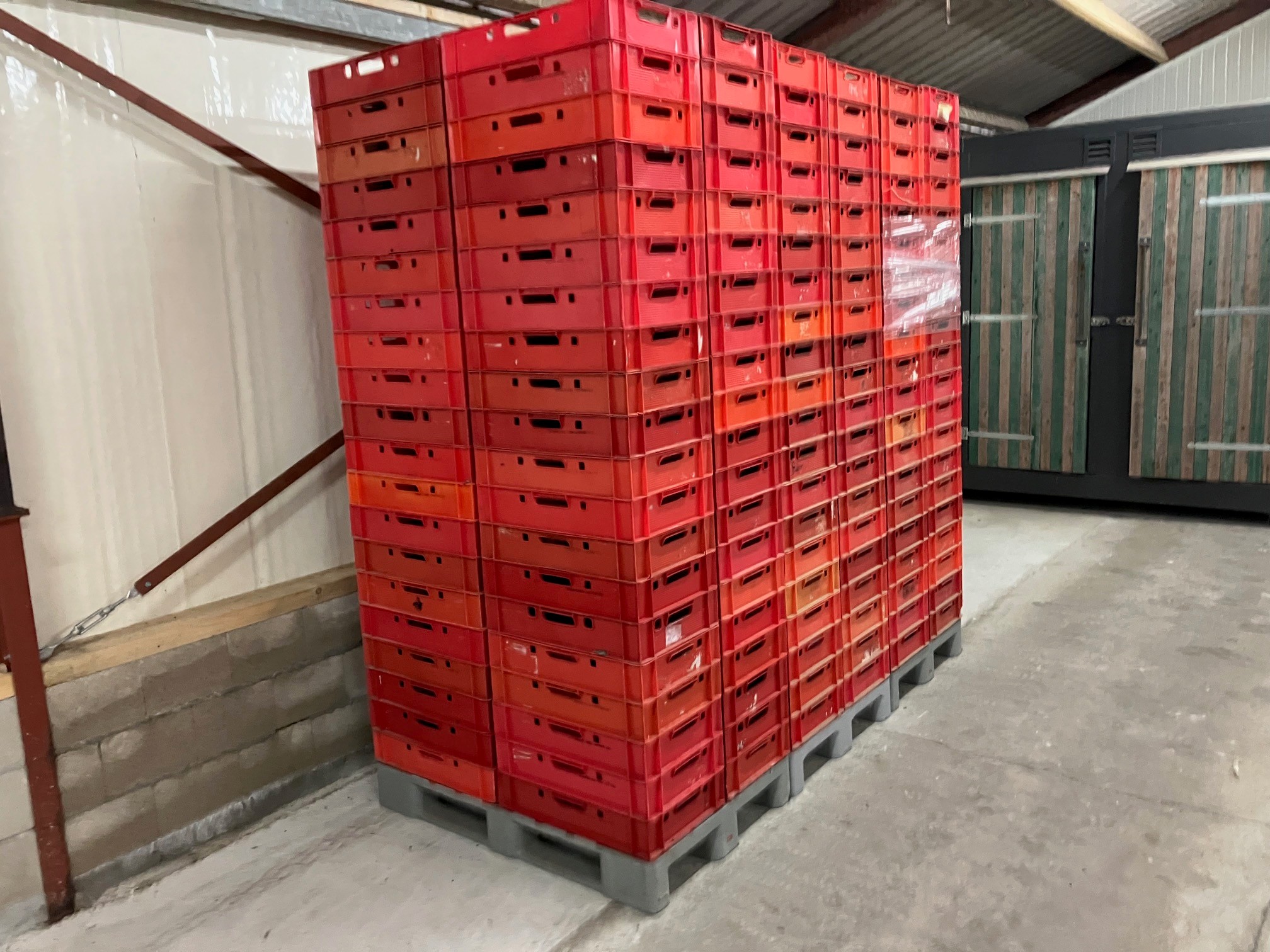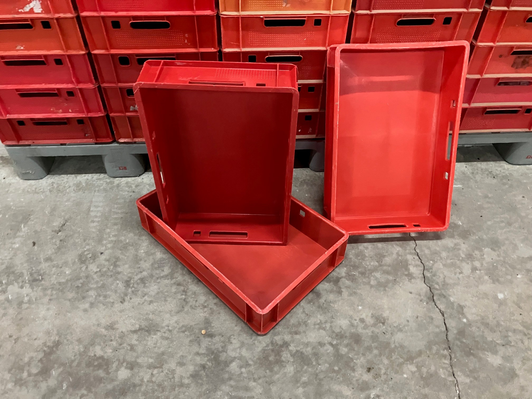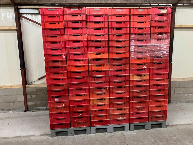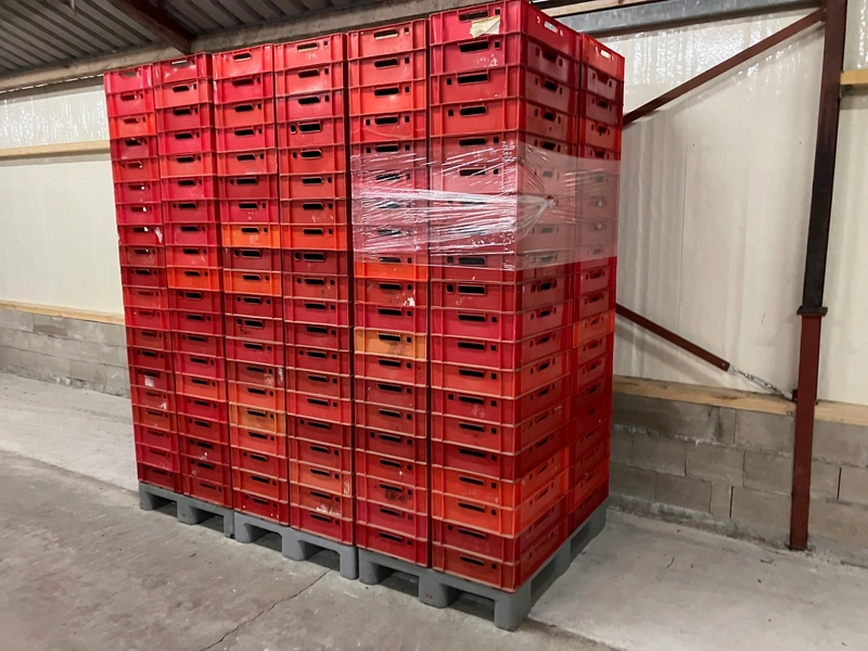 20 pallets with 80 plastic E1 crates each pallet, dimensions crates: (1600x) 600 mm x 400 mm x 100 mm.