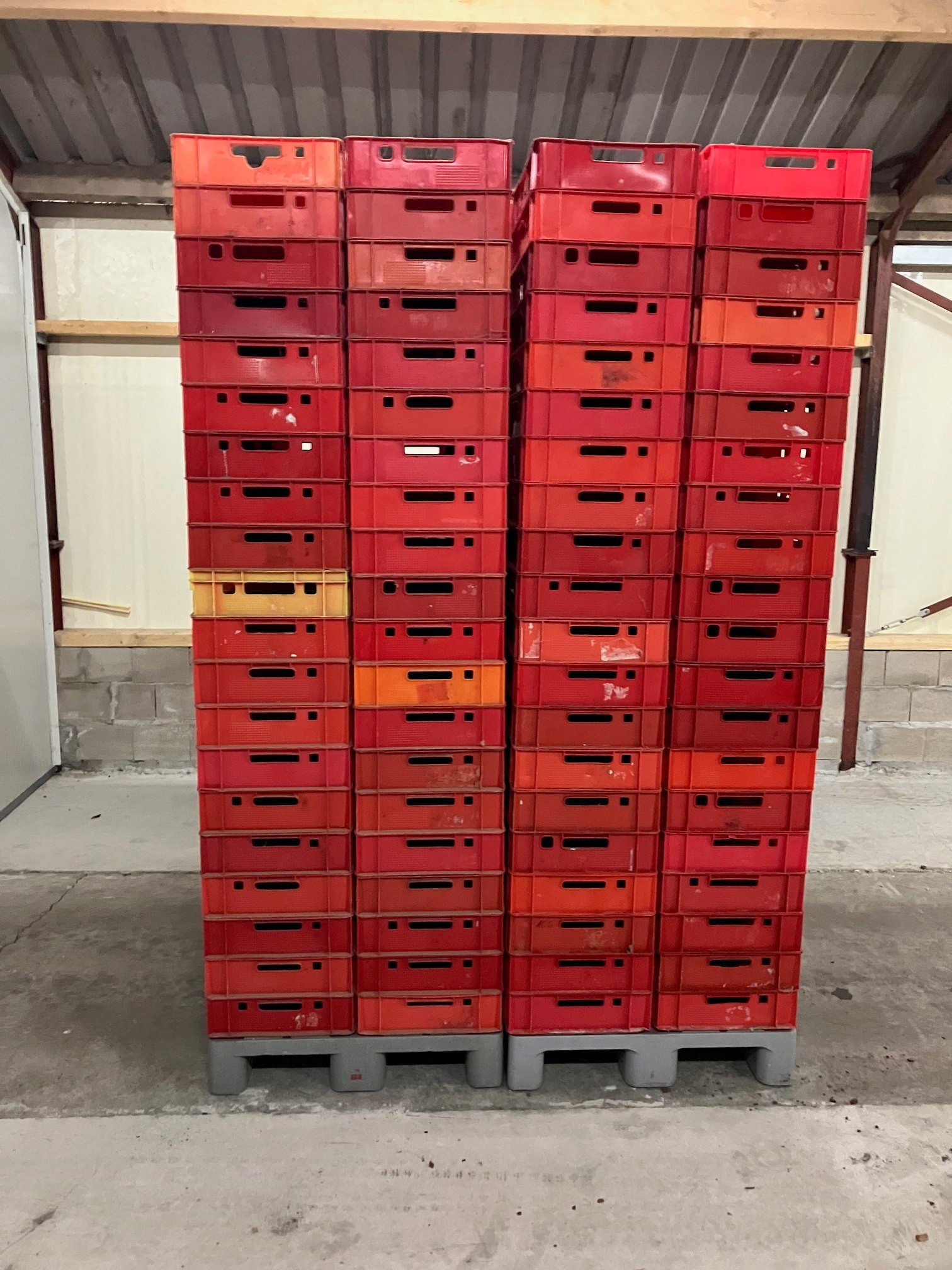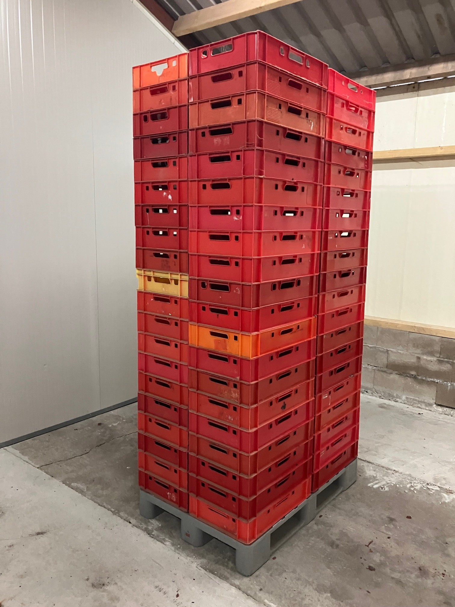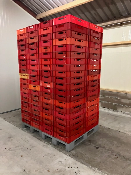 30 pallets with 80 plastic E1 crates each pallet, dimensions crates: (2400x) 600 mm x 400 mm x 100 mm.