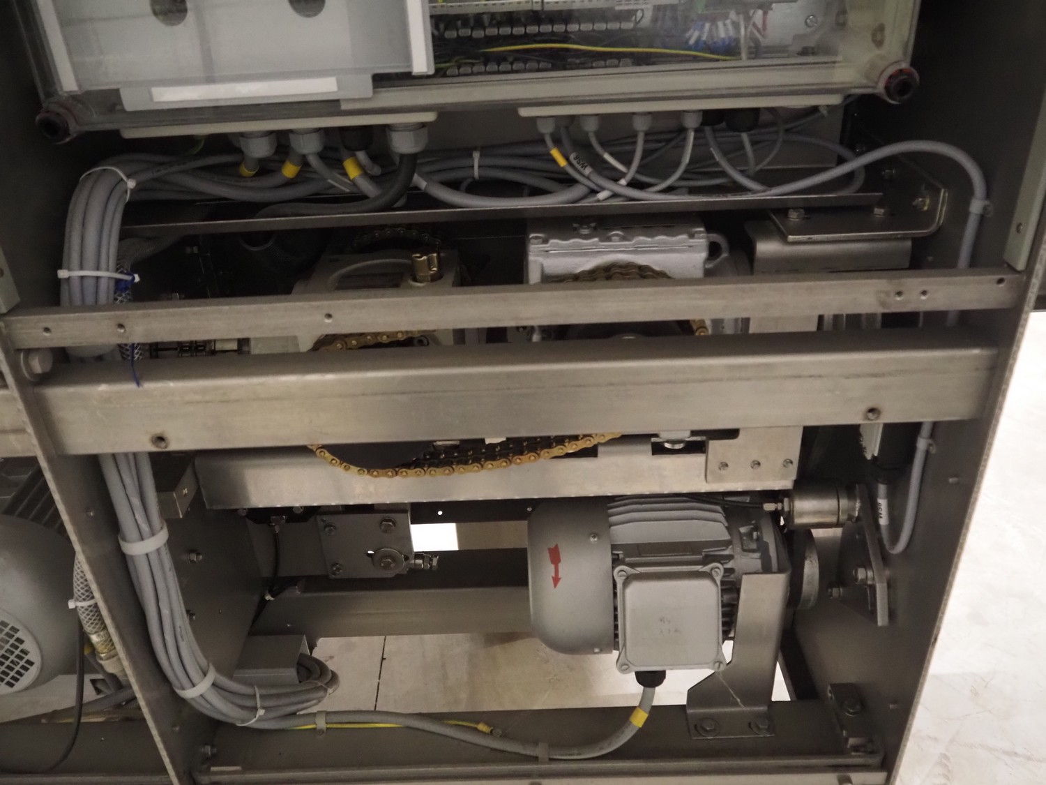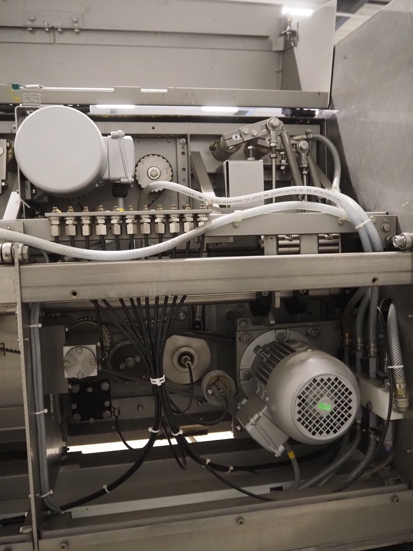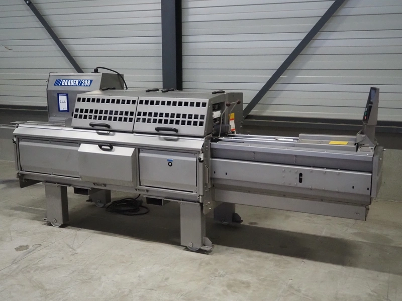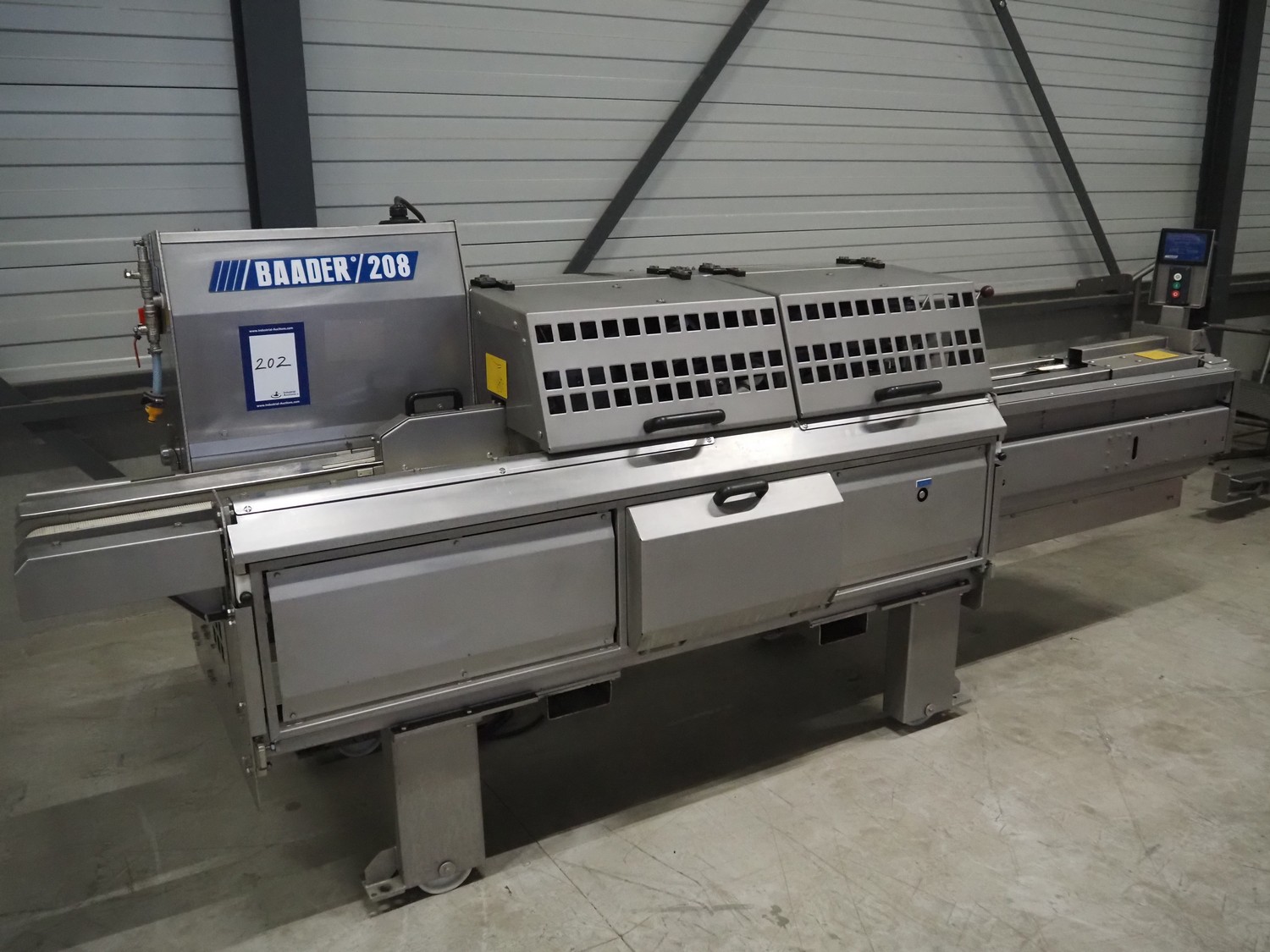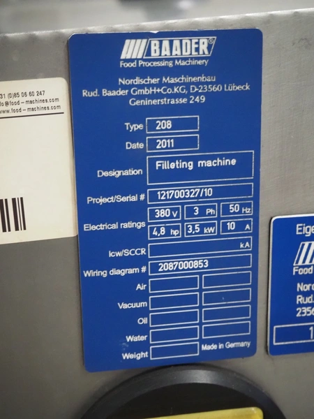 Baader filleting machine, type: 208, serial number: 121700327/10, year of construction: 2011, 380 V, 3 Ph, 50 Hz, 10 A, 3.5 kW, dimensions: 3800 mm x 1200 mm x 1500 mm.