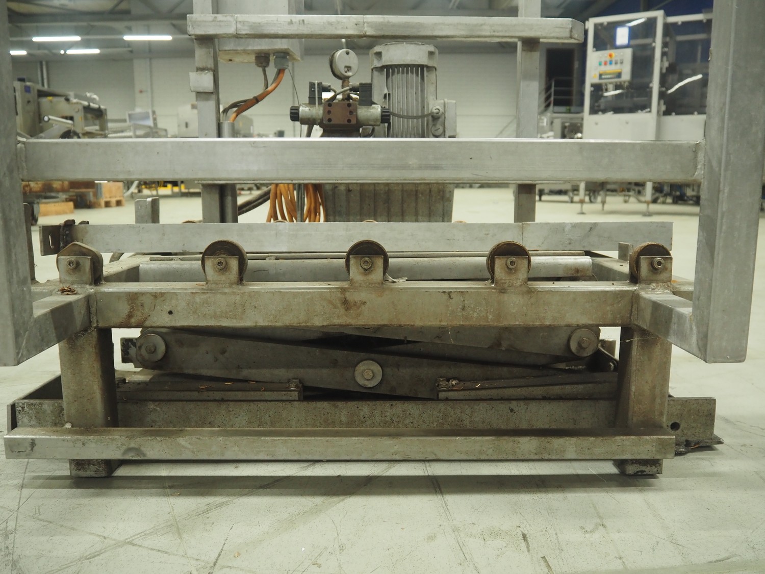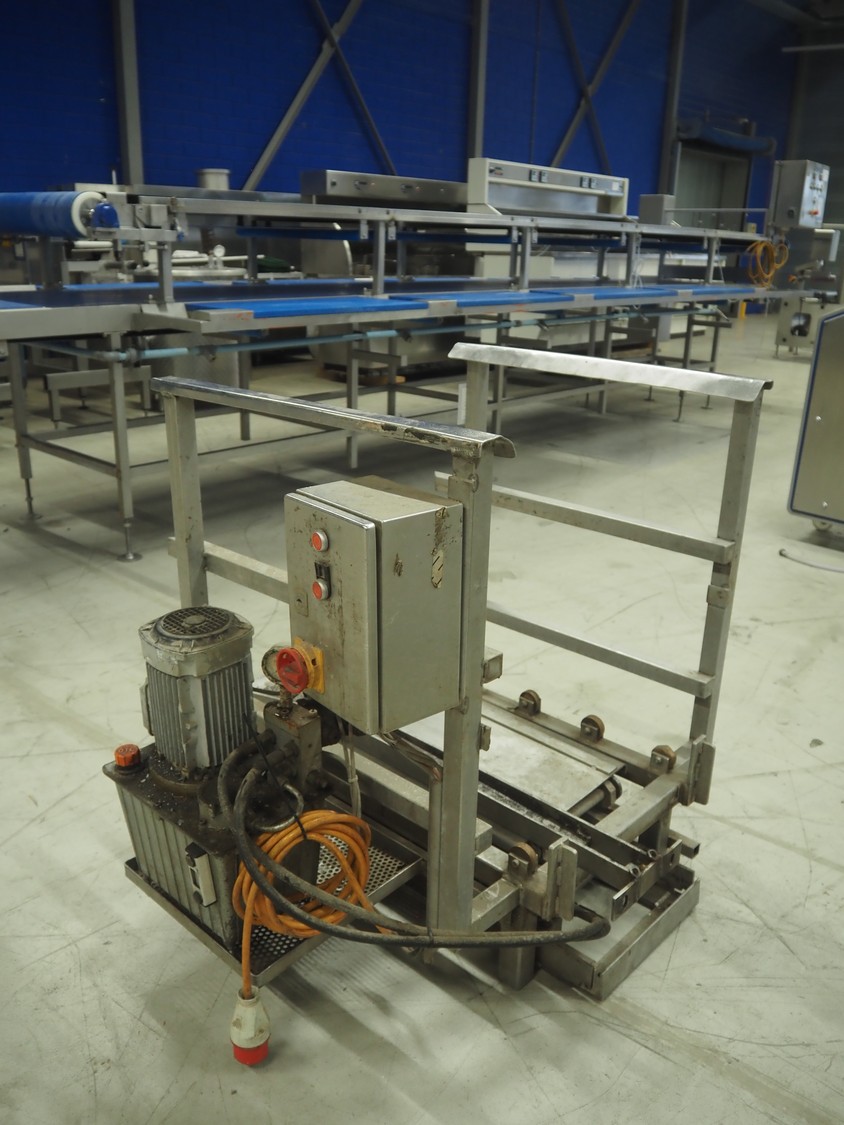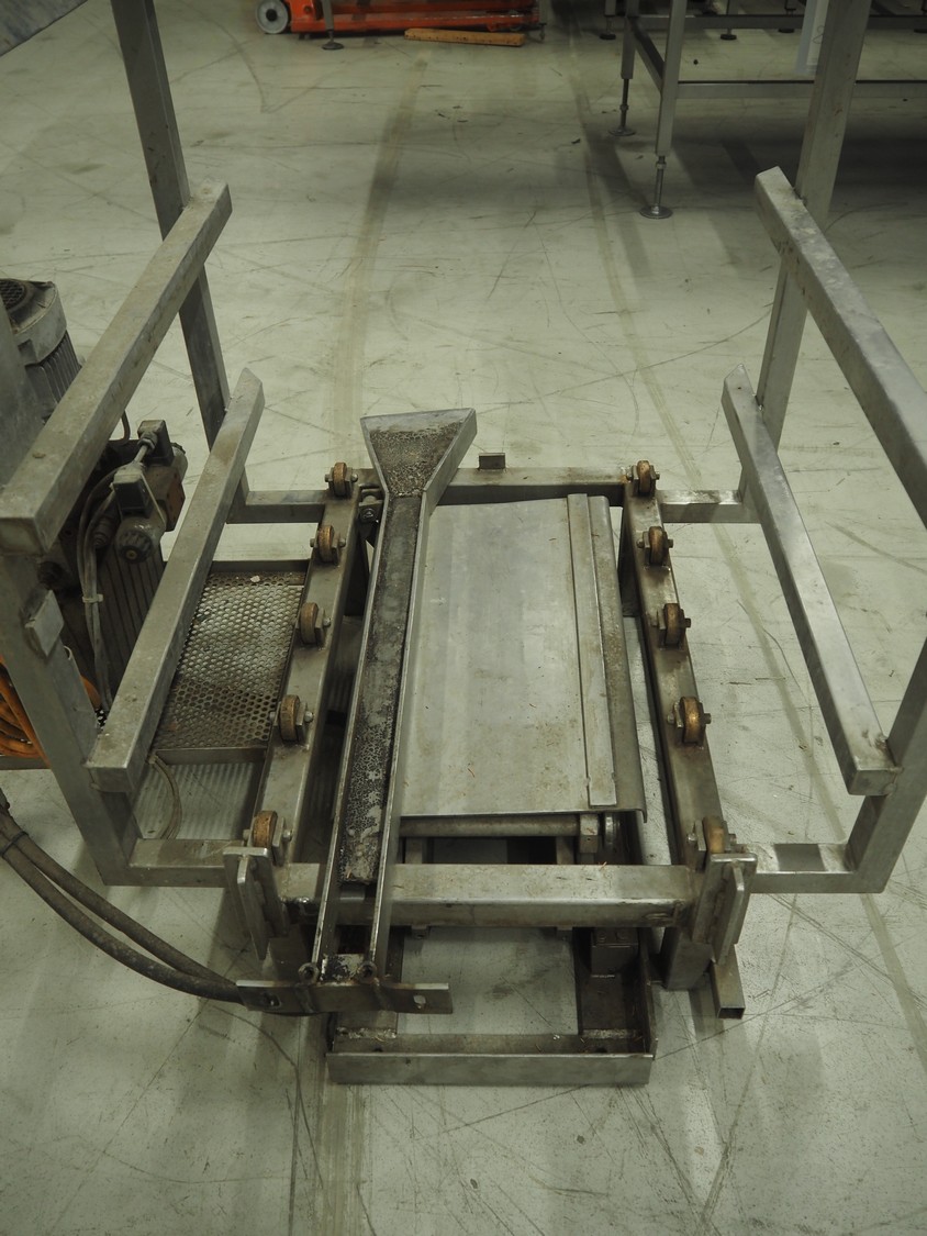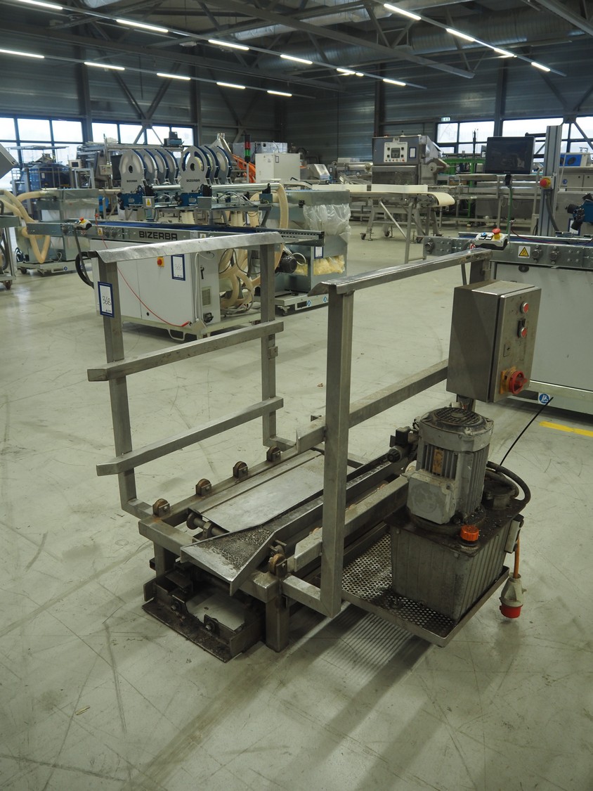 S/s (un)loading system for autoclave trolleys, dimensions platform: 700 mm x 800 mm, total dimensions: 840 mm x 1200 mm x 1050 mm.
