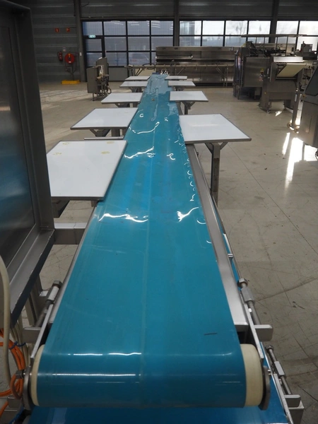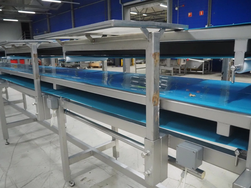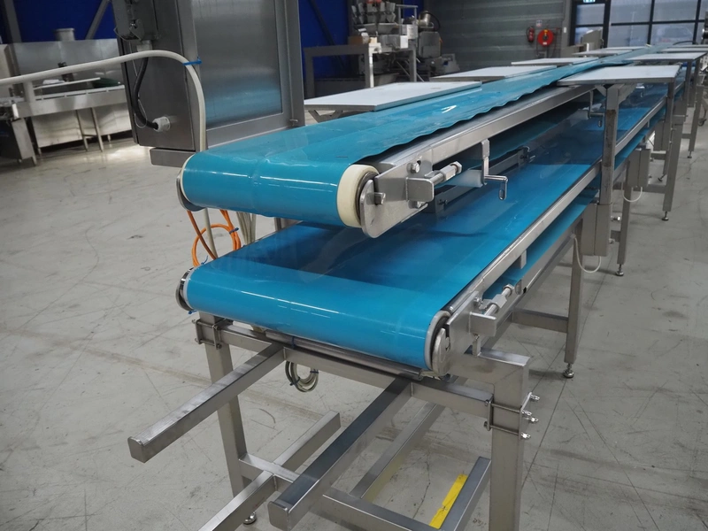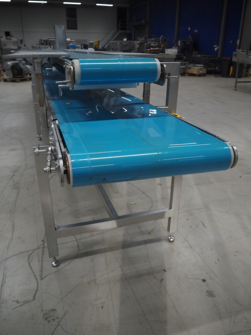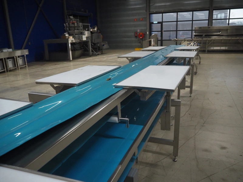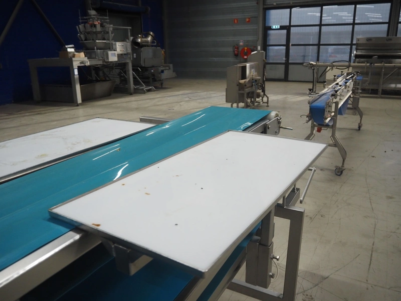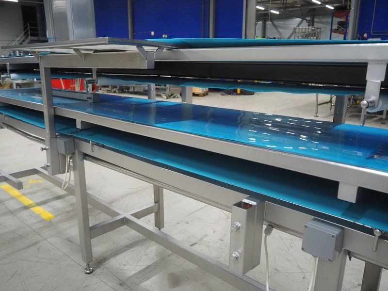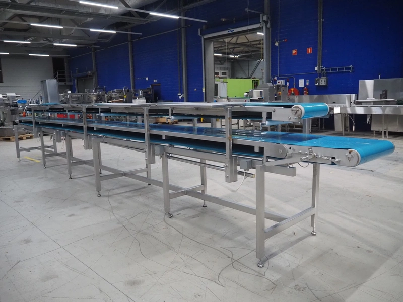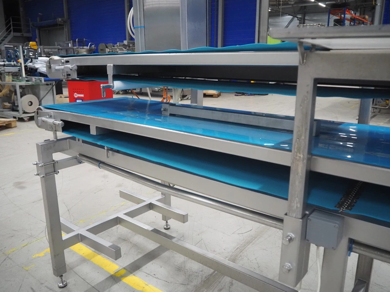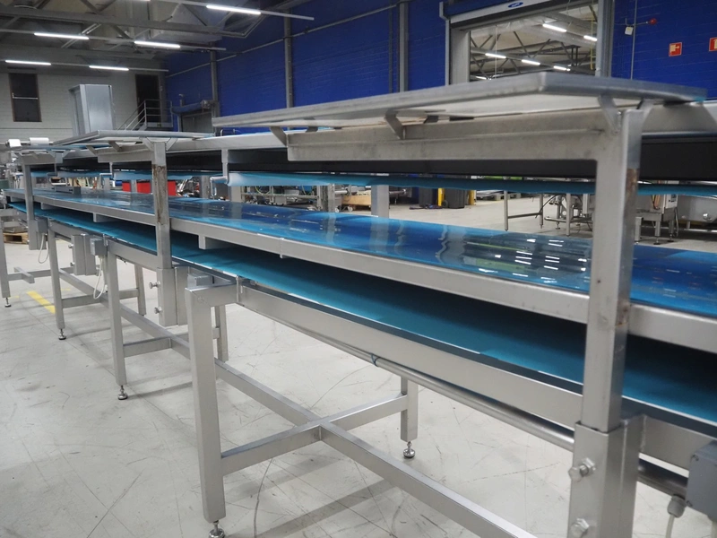 Sorting belt, s/s frame, plastic belts, belt width: 345 mm and 570 mm, total dimensions: 7800 mm x 1100 mm x 1820 mm.