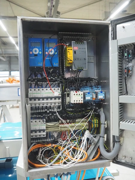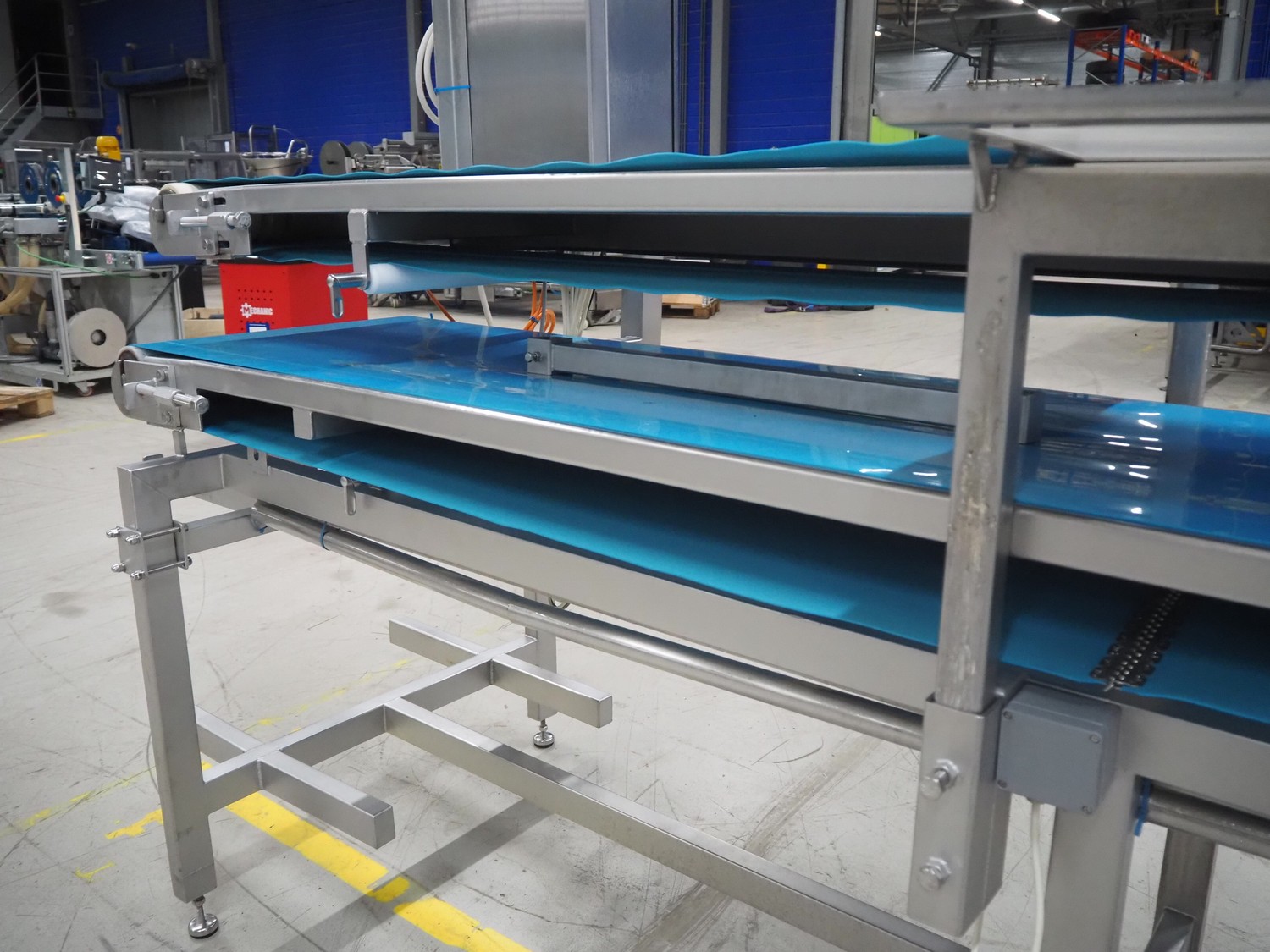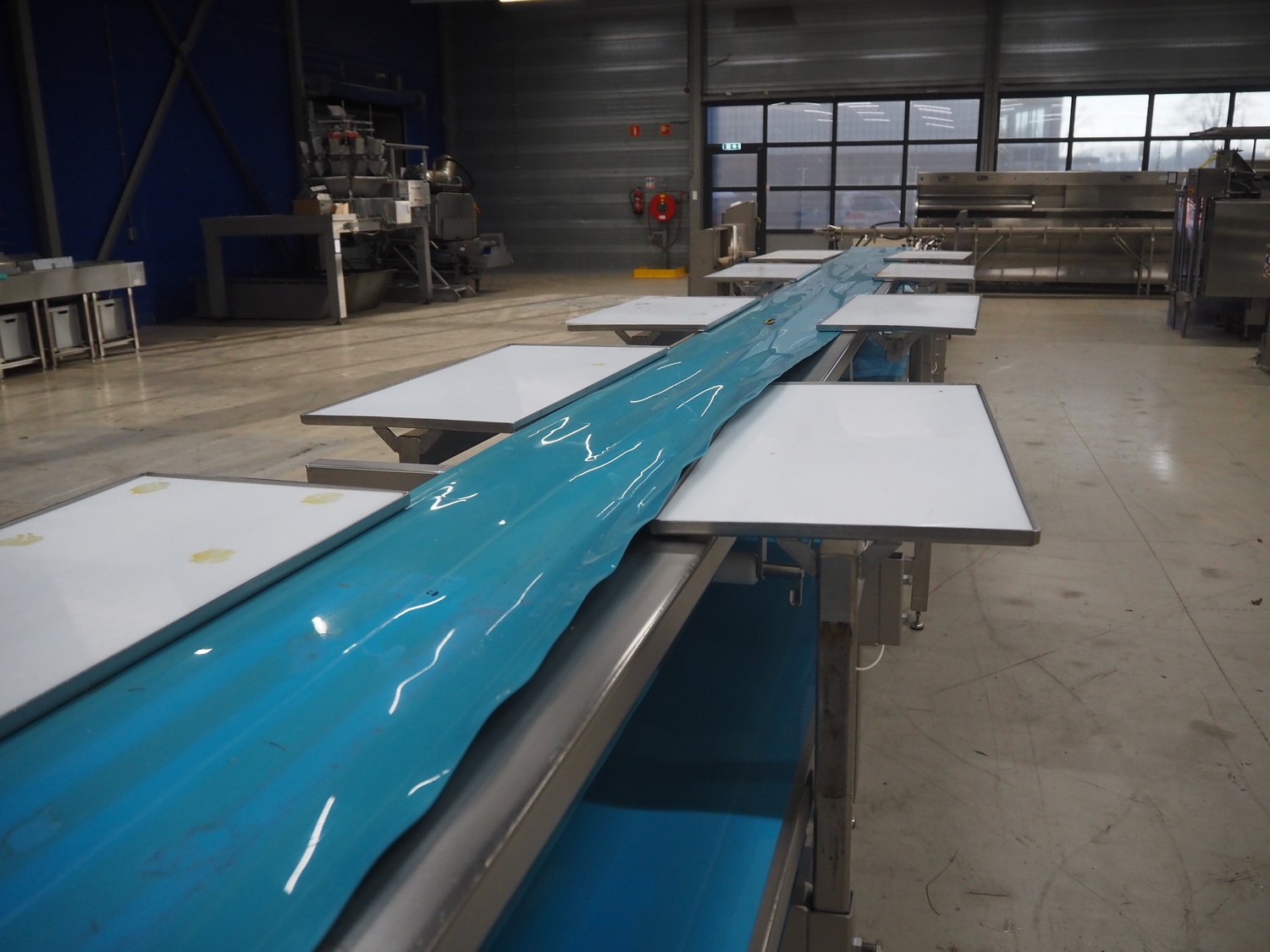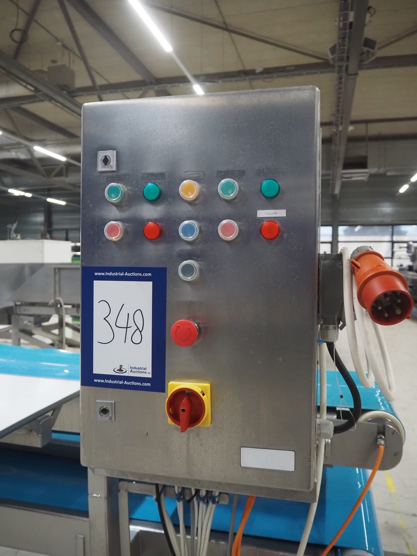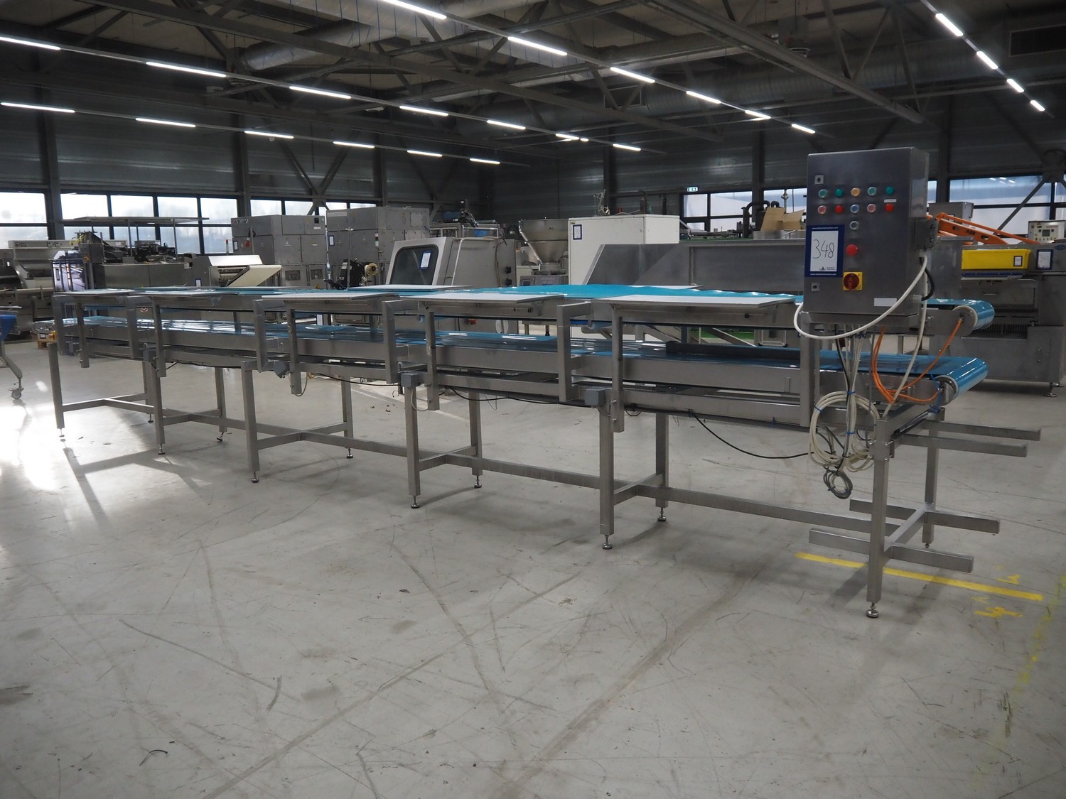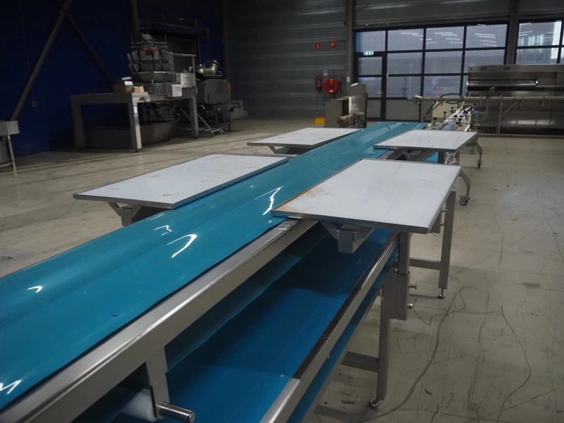 Sorting belt, s/s frame, plastic belts, belt width: 345 mm and 570 mm, total dimensions: 7800 mm x 1100 mm x 1820 mm.