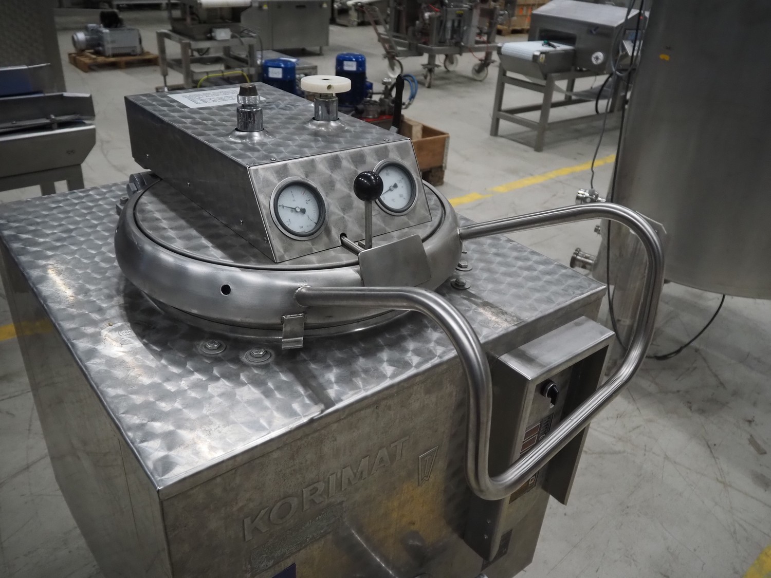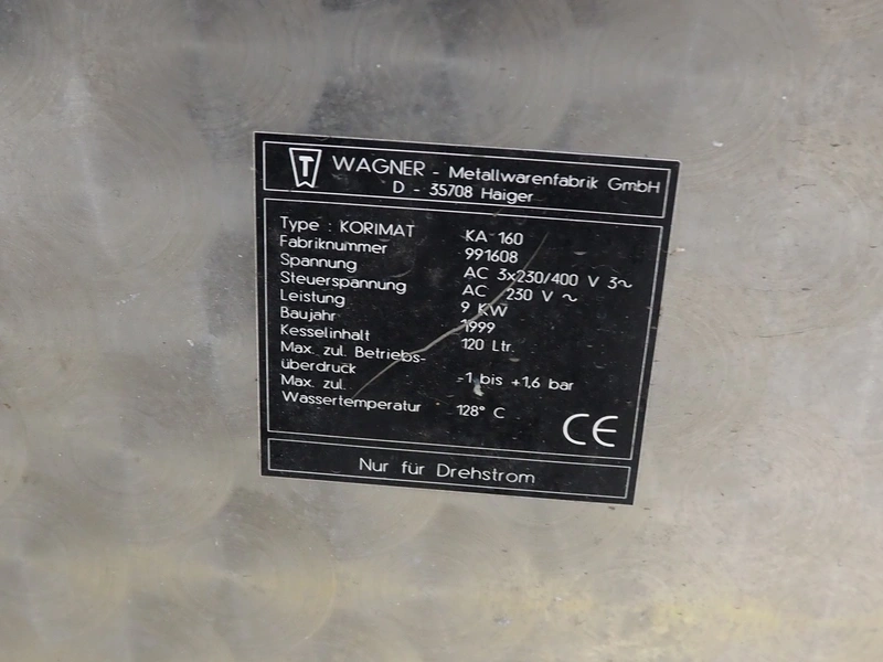 Korimat autoclave, type: KA160, factory number: 991608, year of construction: 1999, 230/400 V, 3 Ph, 9 kW, volume: 120 liter, dimensions: 1150 mm x 800 mm x 1250 mm.