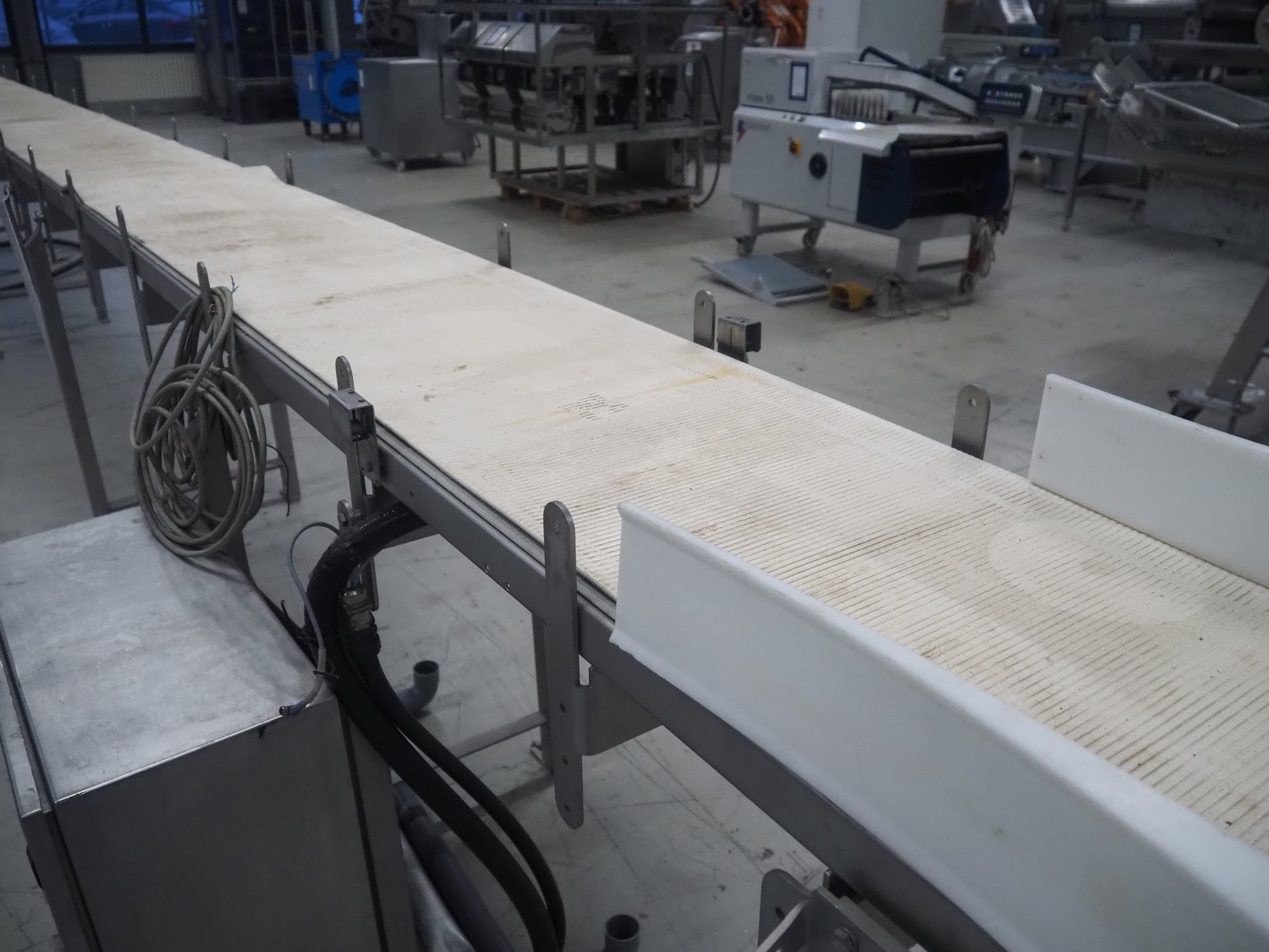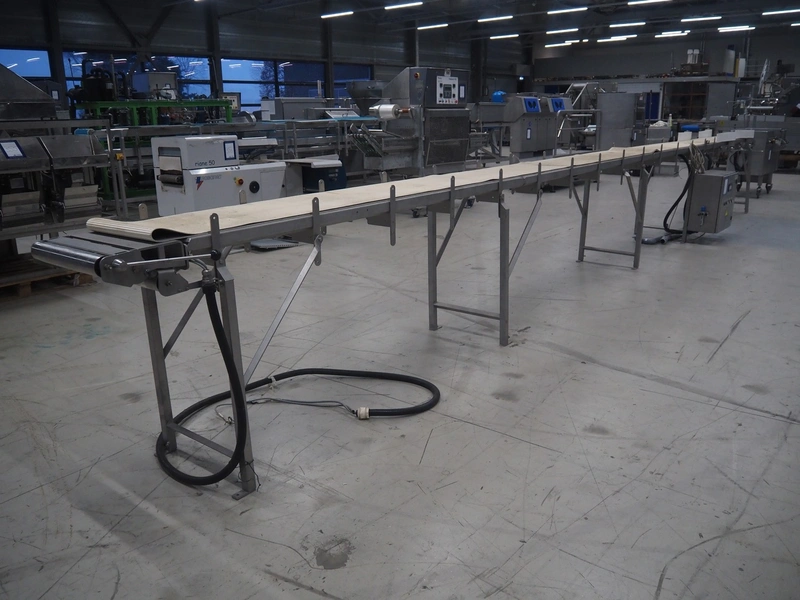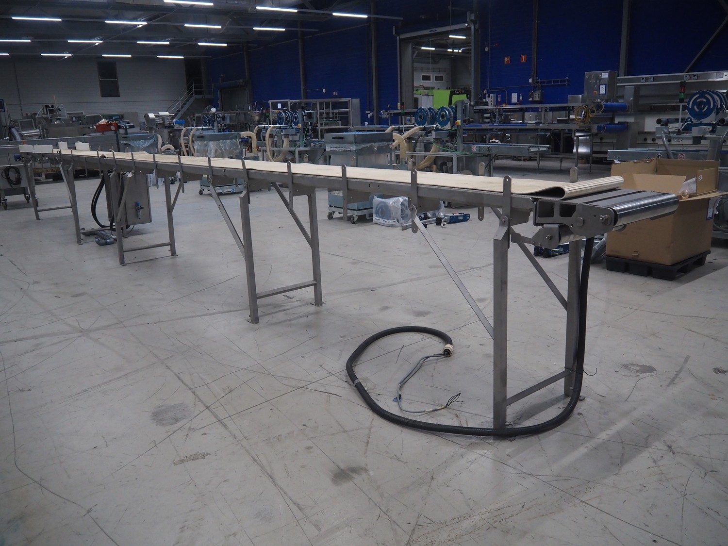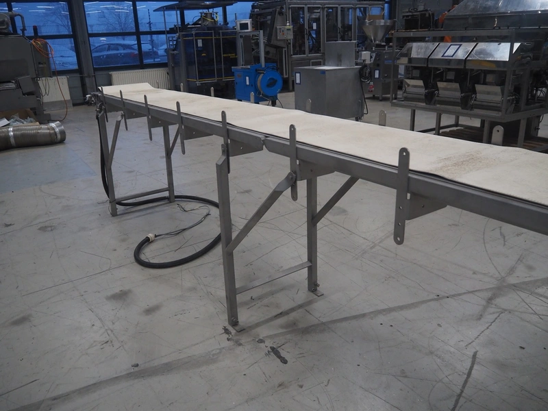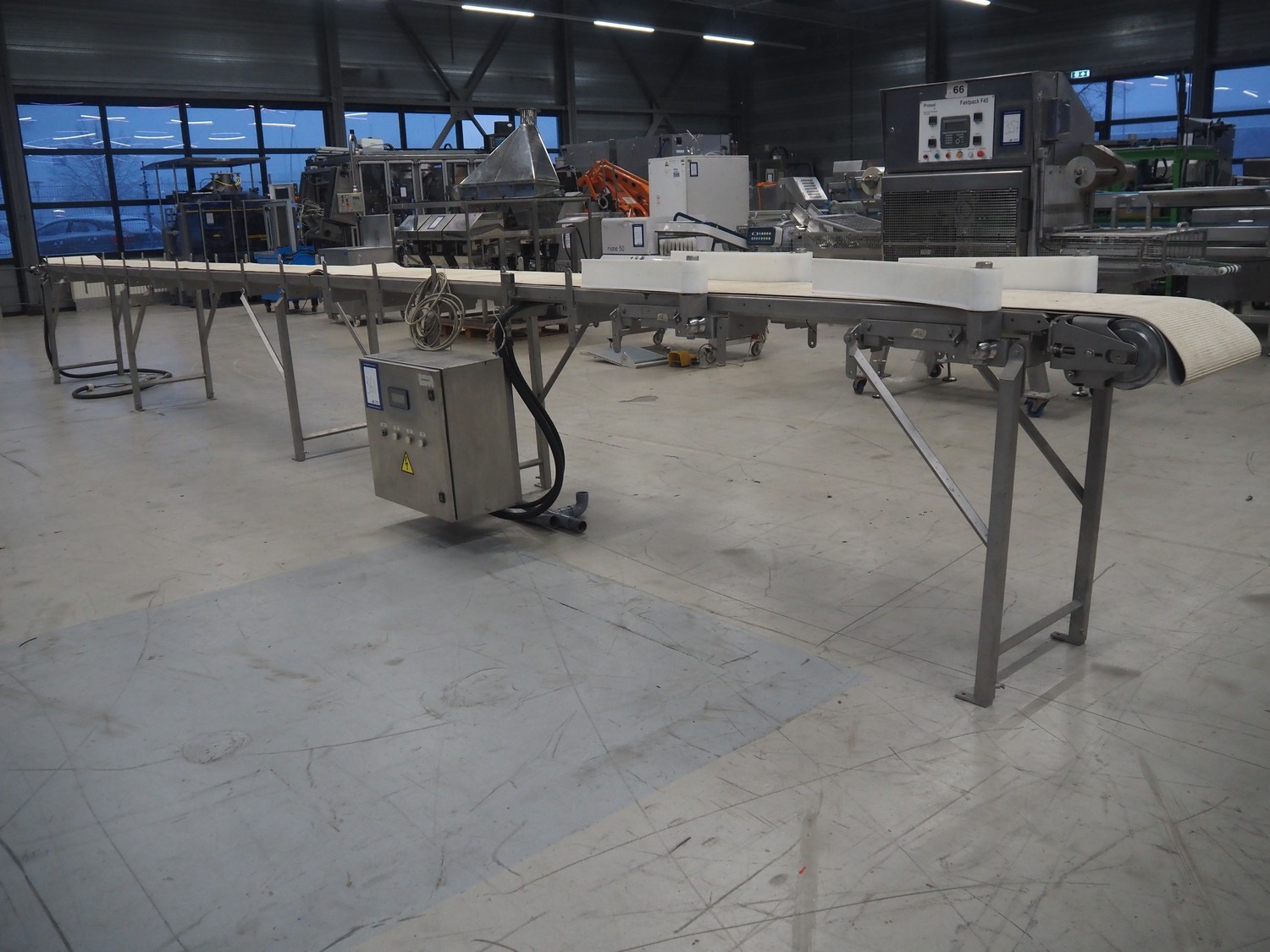 Sorting belt, s/s frame, plastic belt, belt width: 420 mm, 4 rejecters, total dimensions: 9500 mm x 1000 mm x 1150 mm.