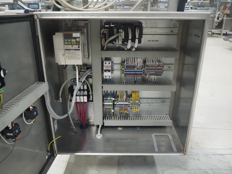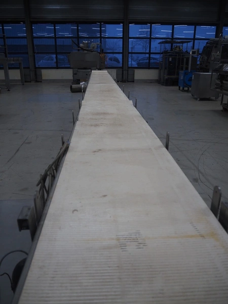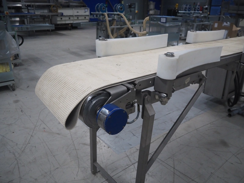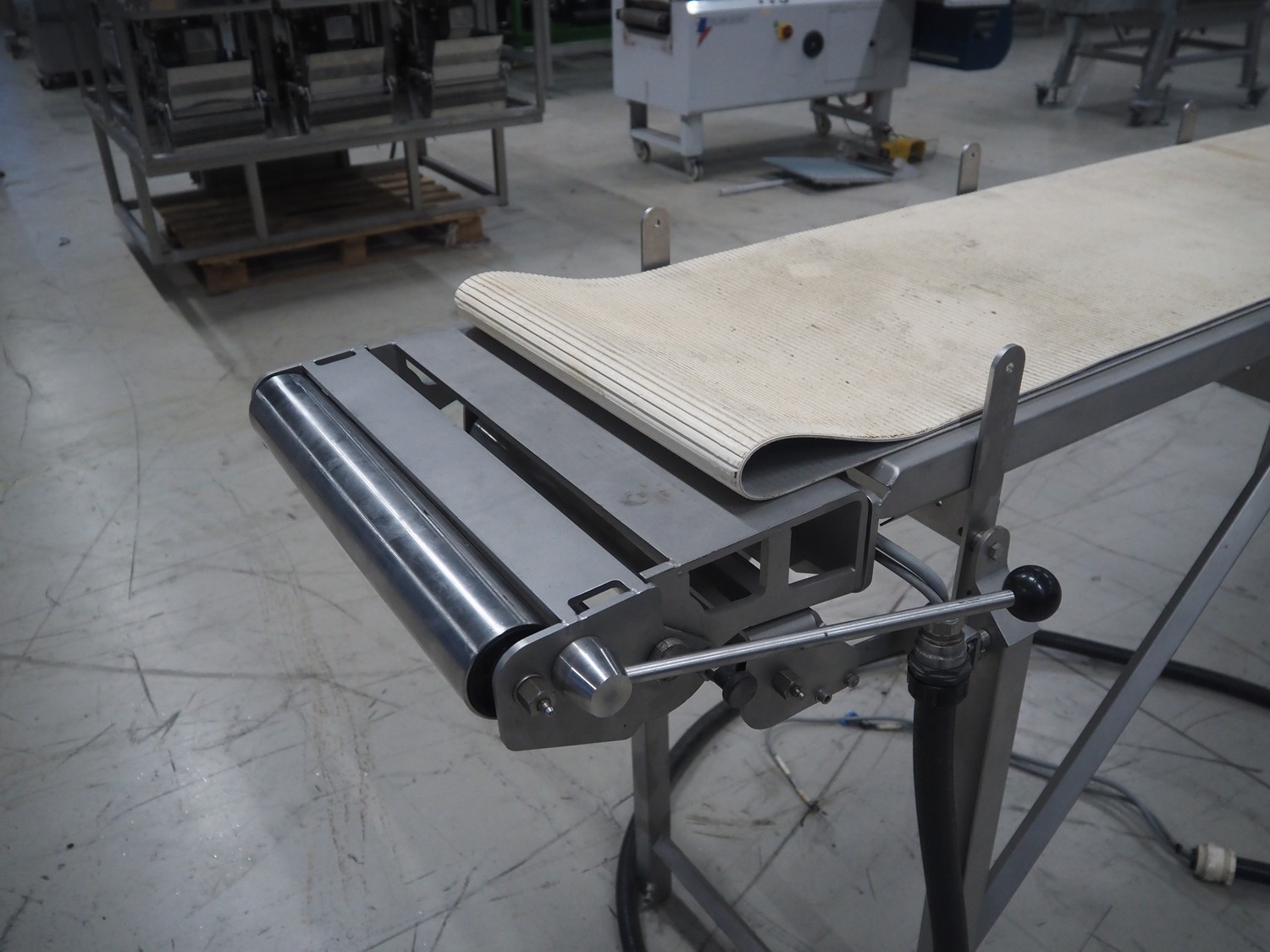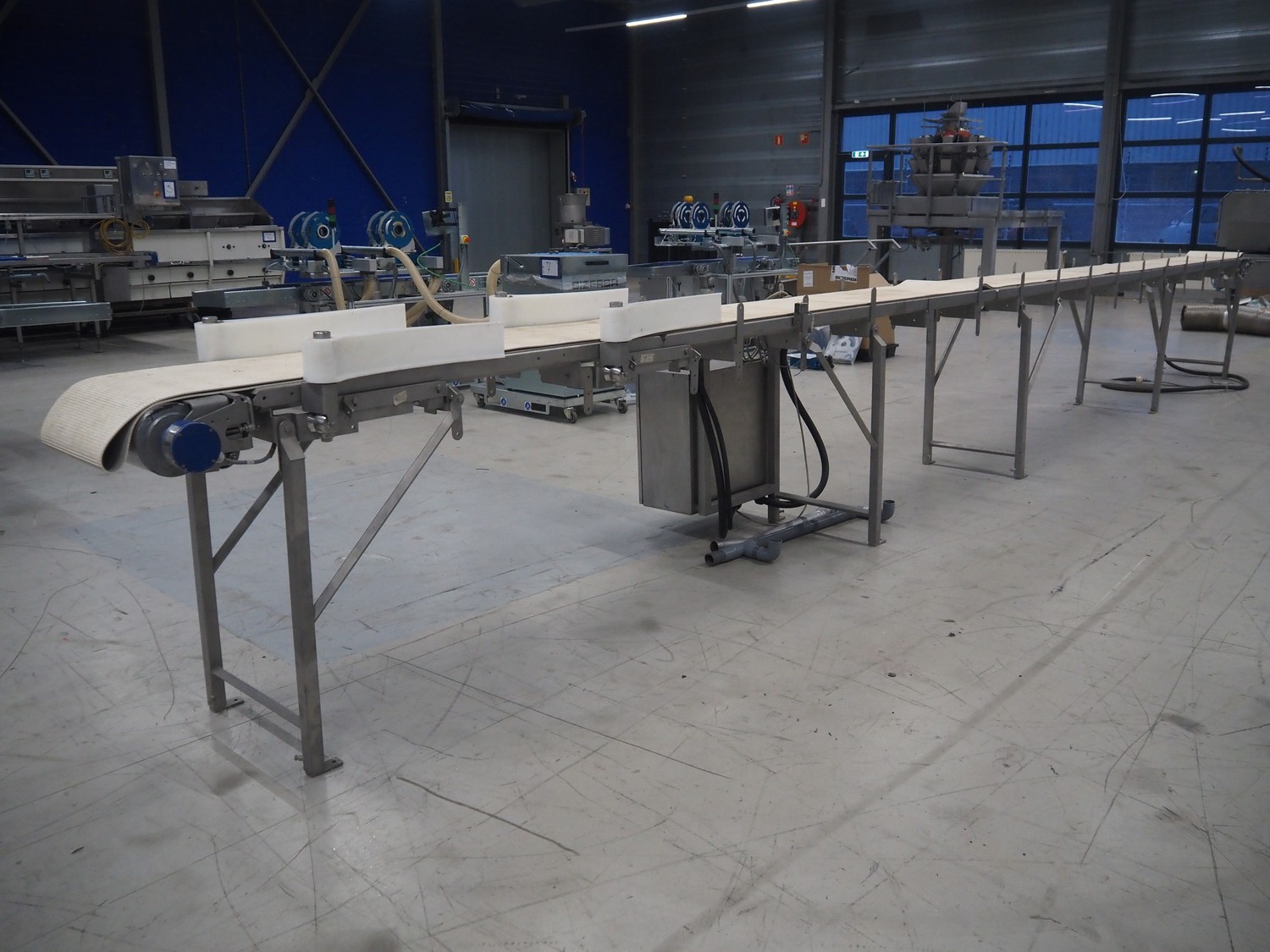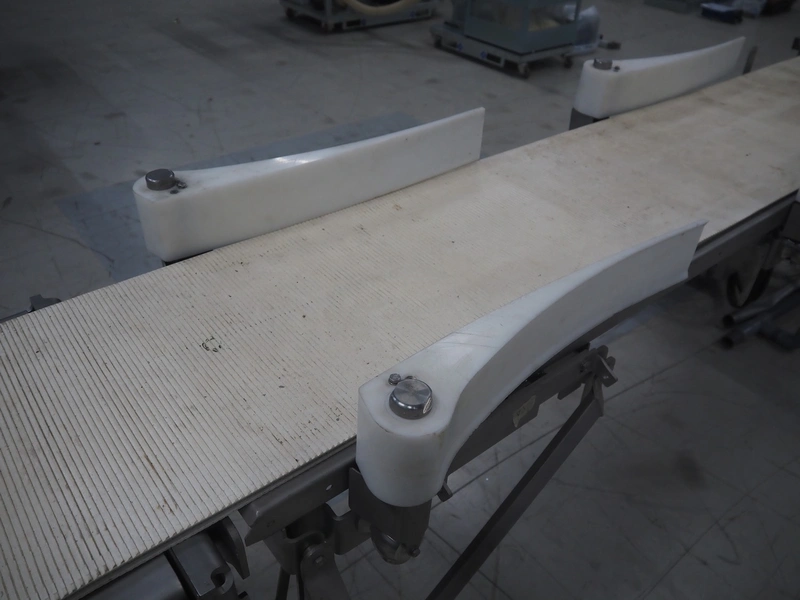 Sorting belt, s/s frame, plastic belt, belt width: 420 mm, 4 rejecters, total dimensions: 9500 mm x 1000 mm x 1150 mm.