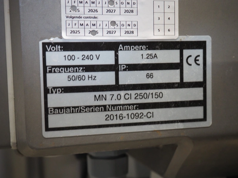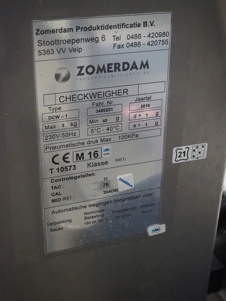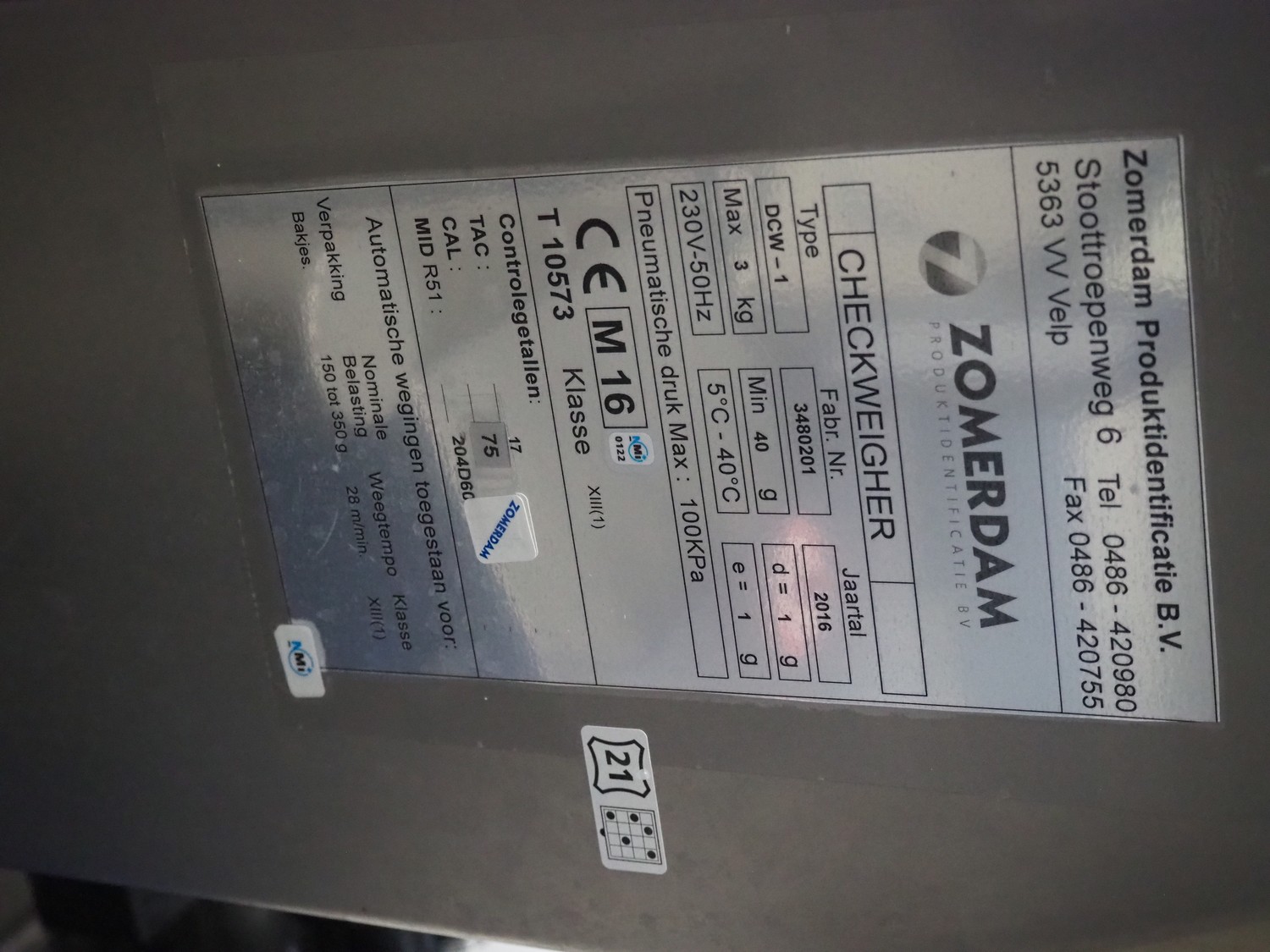 Zomerdam Produktidentificatie B.V. checkweigher and metal detector with rejector, type checkweigher: DCW-1, fabrication number: 3480201, year of construction: 2016, 230 V, 50 Hz, weighing range: 40g-3kg, temperature range: 5°C-40°C, plastic belt, belt width: 200 mm, type metal detector: MN 7.0 CI 250/150, serial number: 1092-CI, year of construction: 2016, clearance: 250 mm x 105 mm, total dimensions: 3000 mm x 1030 mm x 1500 mm.