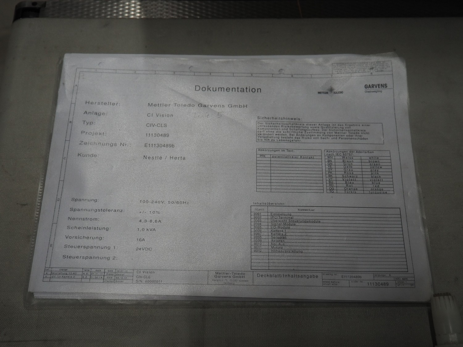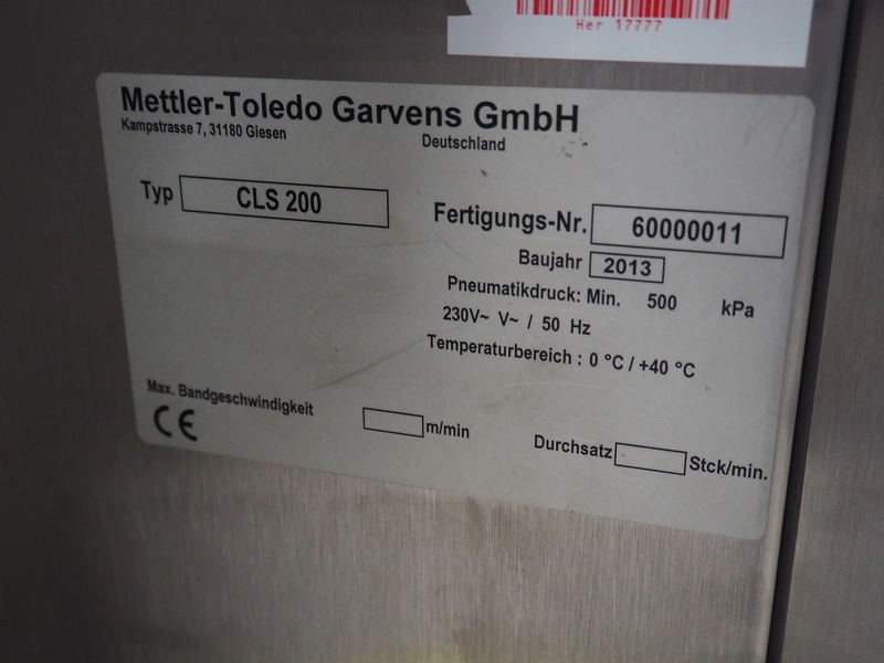 Mettler-Toledo Garvens GmbH checkweigher, type: CLS 200, number: 60000011, year of construction: 2013, 230 V, 50 Hz, plastic belt, belt width: 300 mm, clearance: 300 mm x 35 mm, total dimensions: 1800 mm x 1200 mm x 1700 mm.