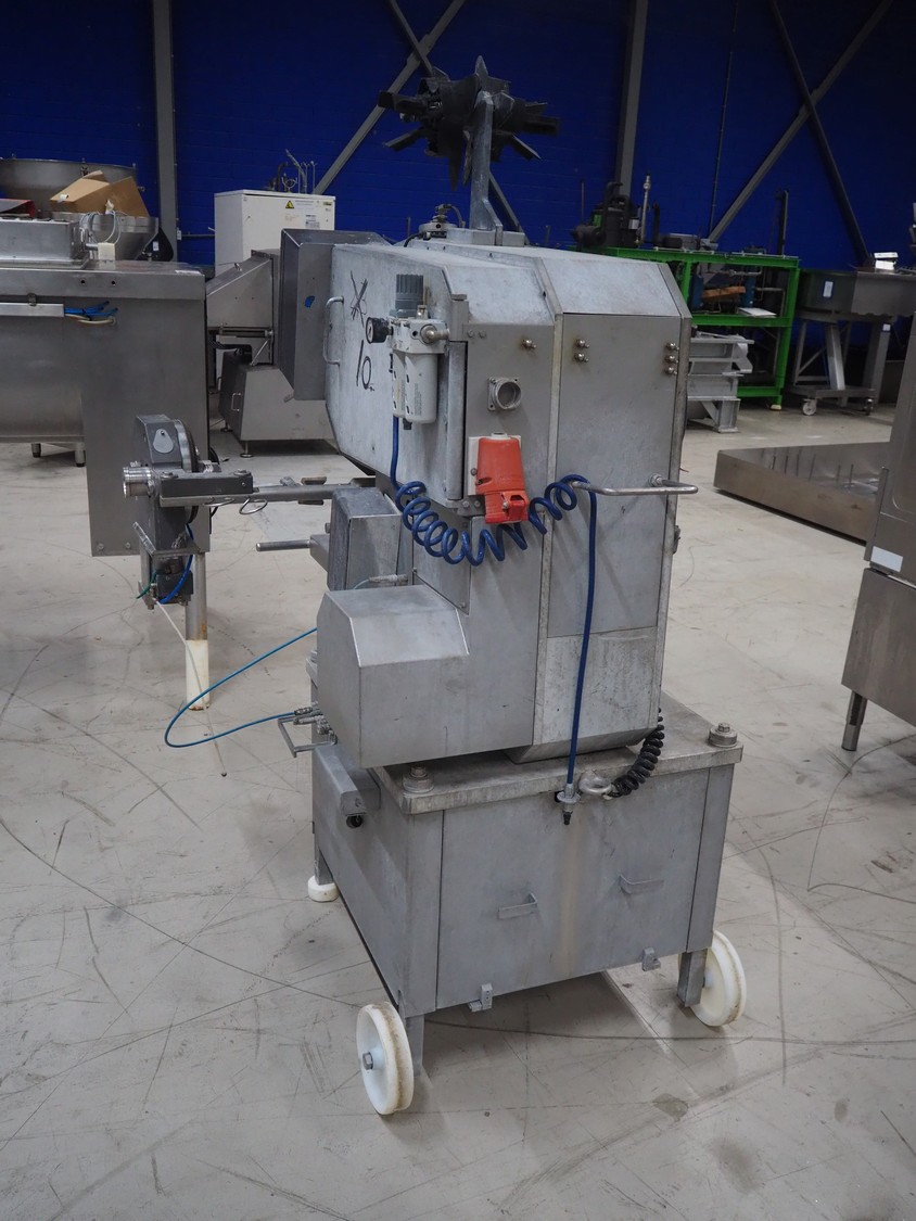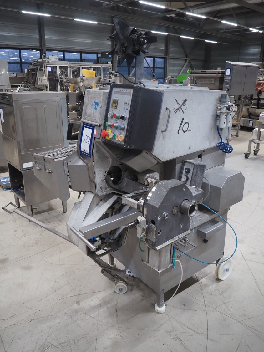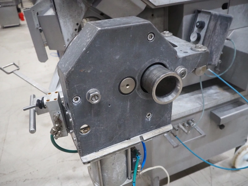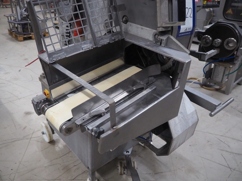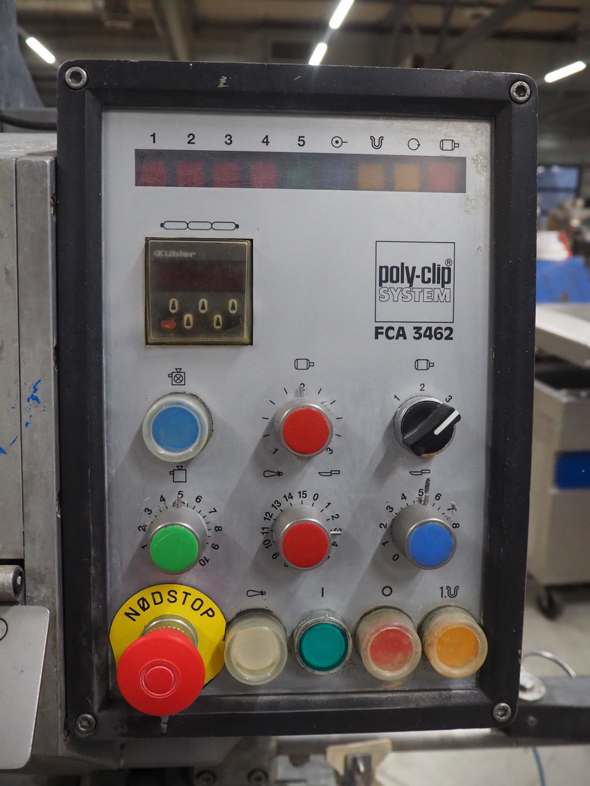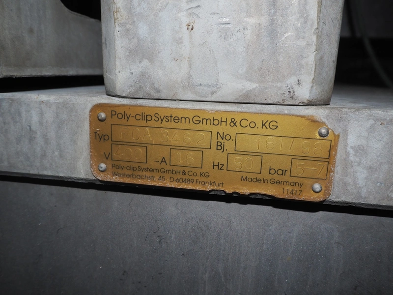 Poly-clip System GmbH & Co. KG mobile automatic double clipper, type: FCA 3462, number: 161, year of construction: 1998, 400 V, 50 Hz, 16 A, plastic belt, belt width: 120 mm, total dimensions: 1450 mm x 1450 mm x 2000 mm.