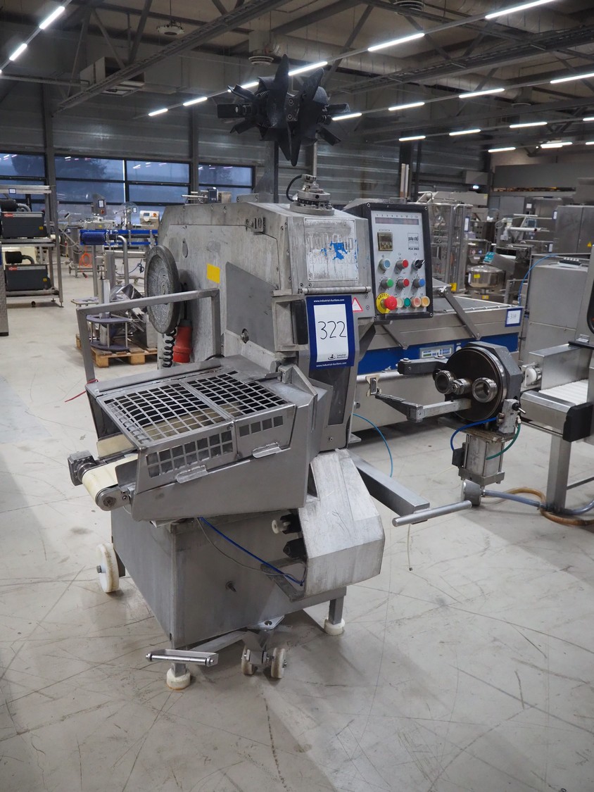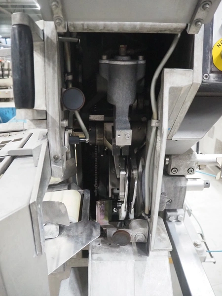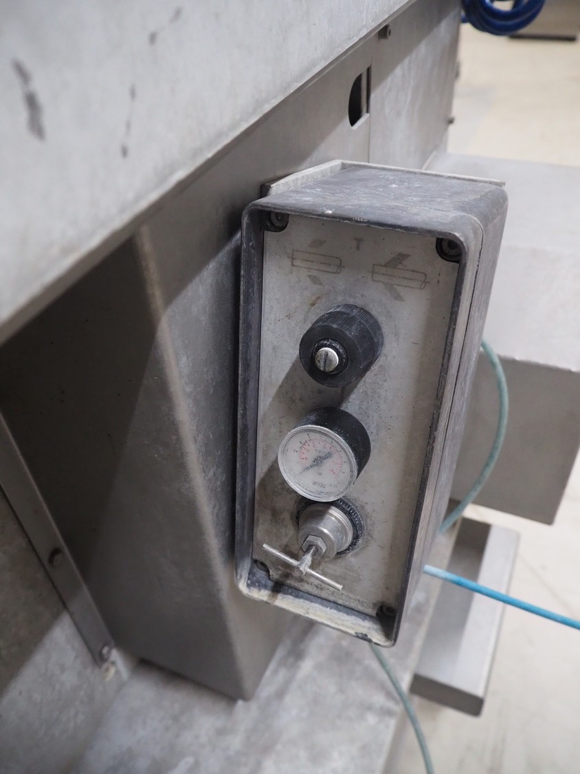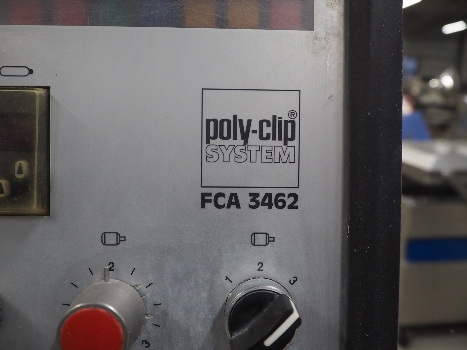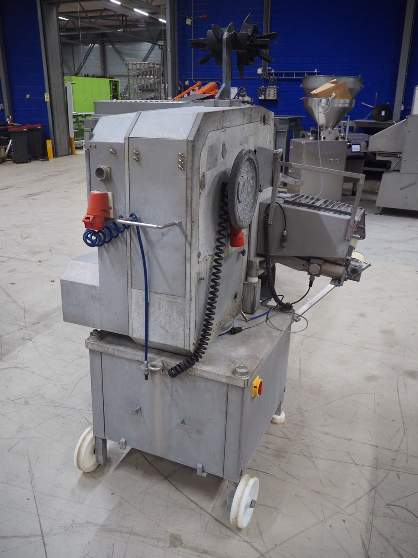 Poly-clip System GmbH & Co. KG mobile automatic double clipper, type: FCA 3462, number: 161, year of construction: 1998, 400 V, 50 Hz, 16 A, plastic belt, belt width: 120 mm, total dimensions: 1450 mm x 1450 mm x 2000 mm.