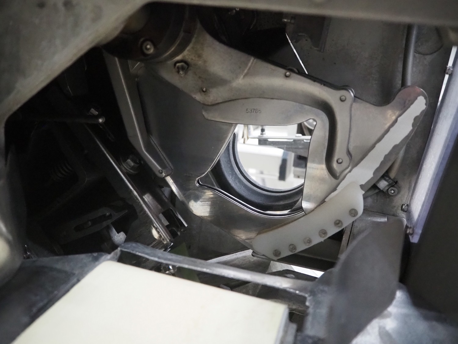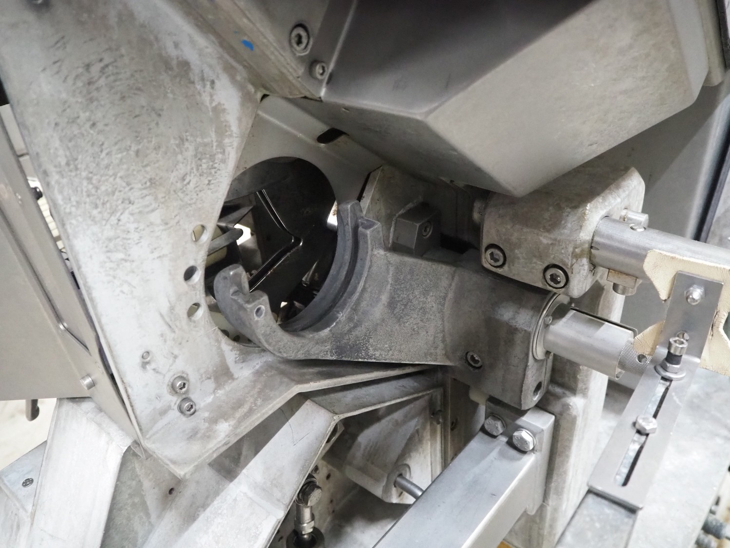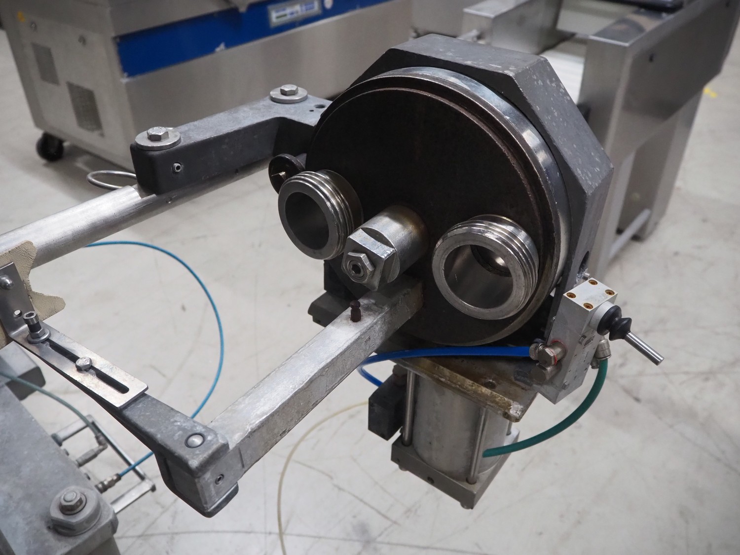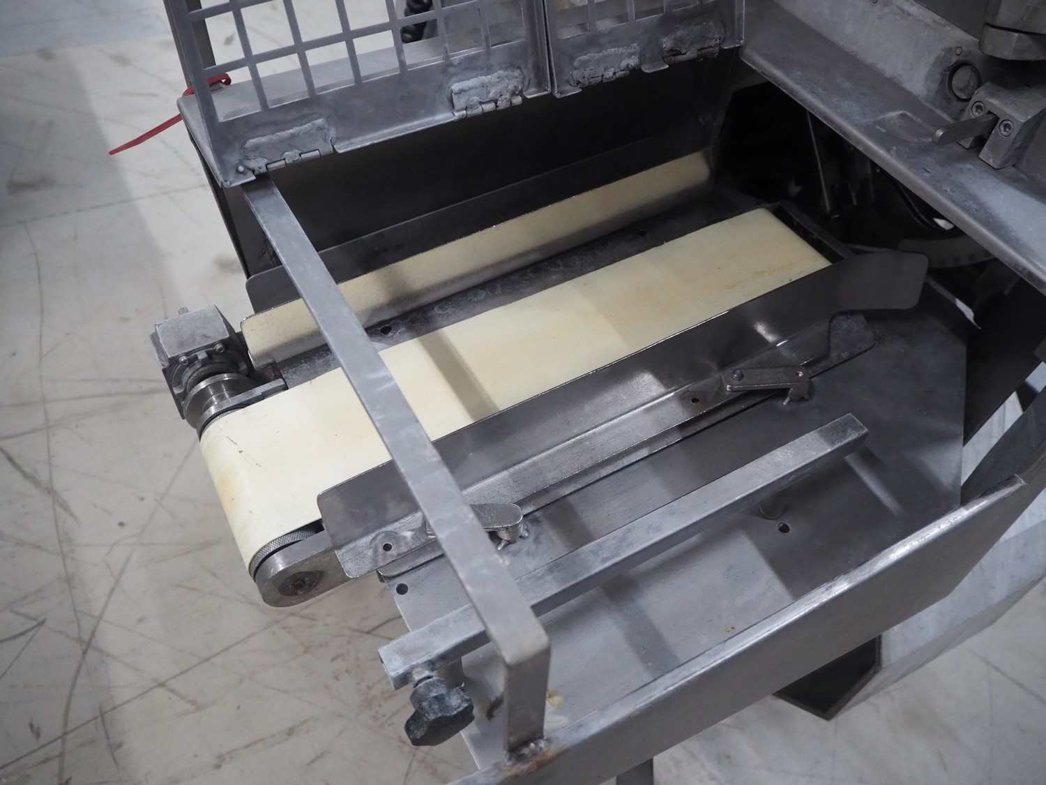 Poly-clip System GmbH & Co. KG mobile automatic double clipper, type: FCA 3462, number: 161, year of construction: 1998, 400 V, 50 Hz, 16 A, plastic belt, belt width: 120 mm, total dimensions: 1450 mm x 1450 mm x 2000 mm.