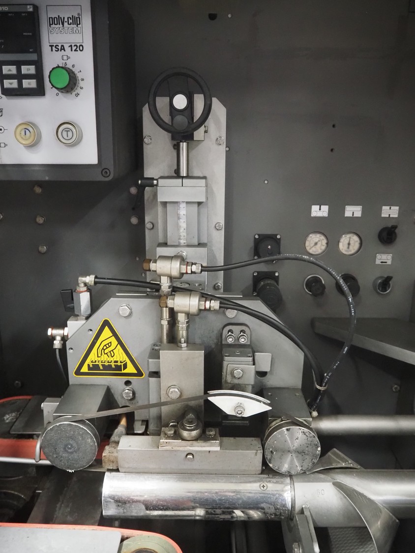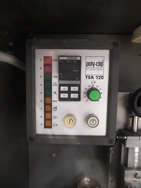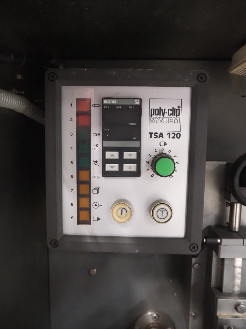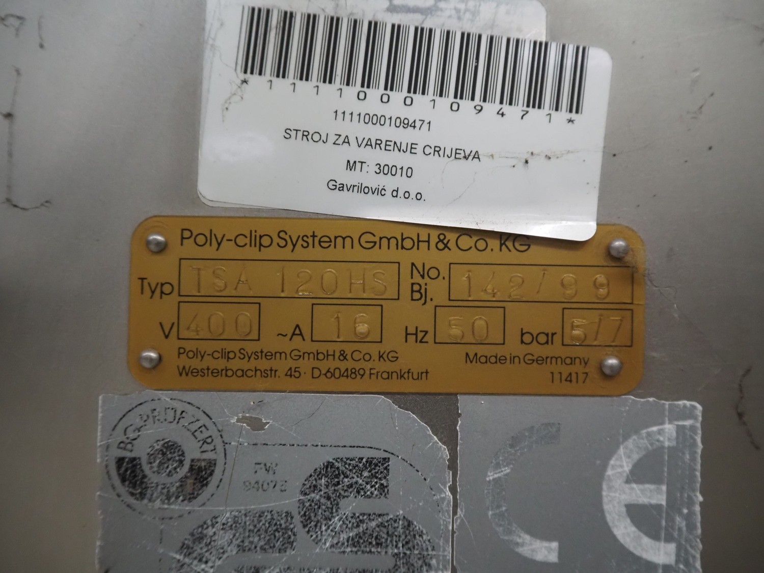 Poly-clip System GmbH & Co. KG automatic clipping and sealing machine, type: TSA 120 HS, number: 142, year of construction: 1999, 400 V, 50 Hz, 16 A, air pressure: 5/7 bar, dimensions: 1400 mm x 980 mm x 1660 mm.