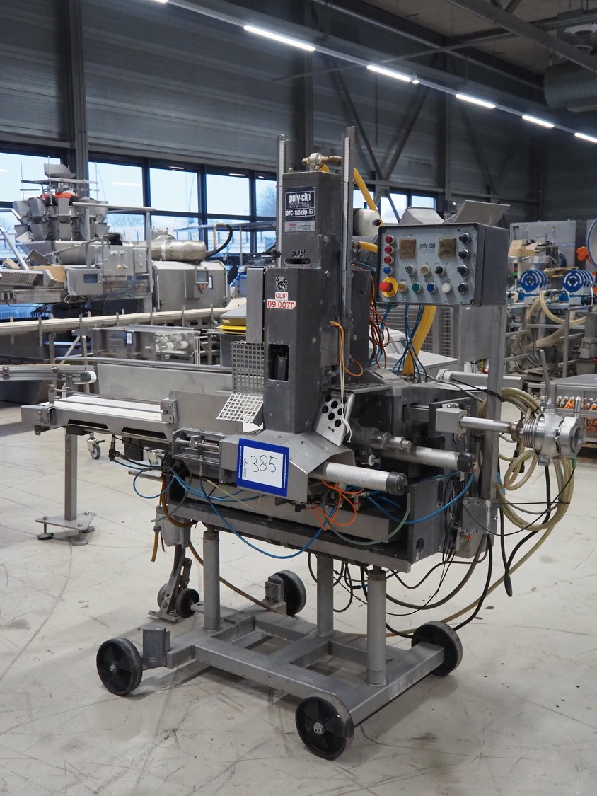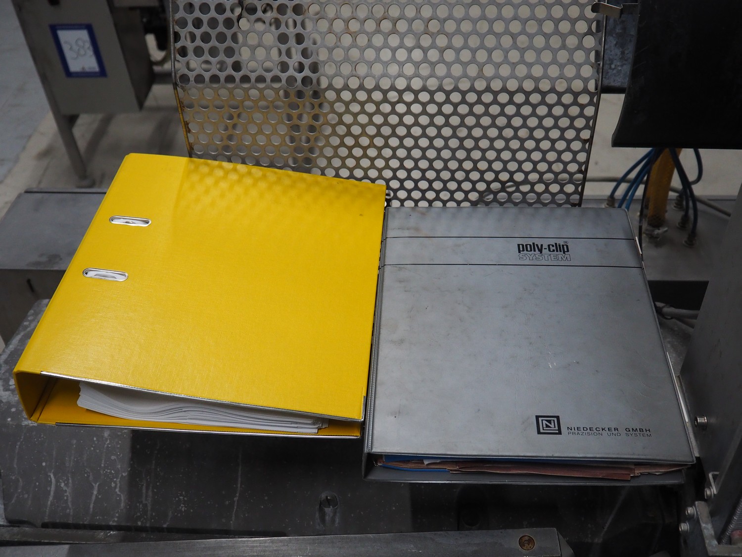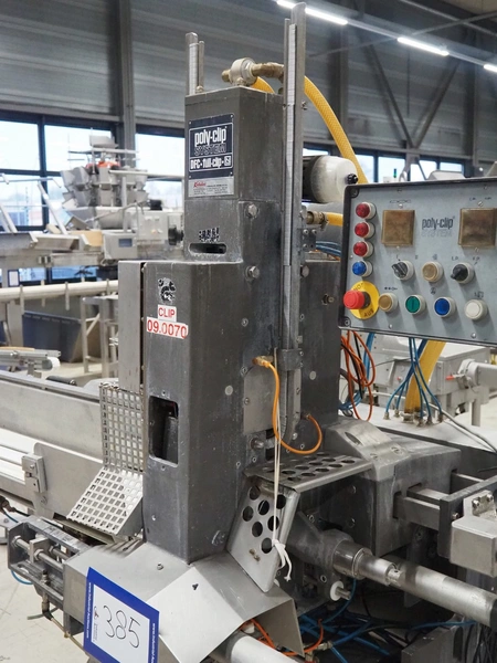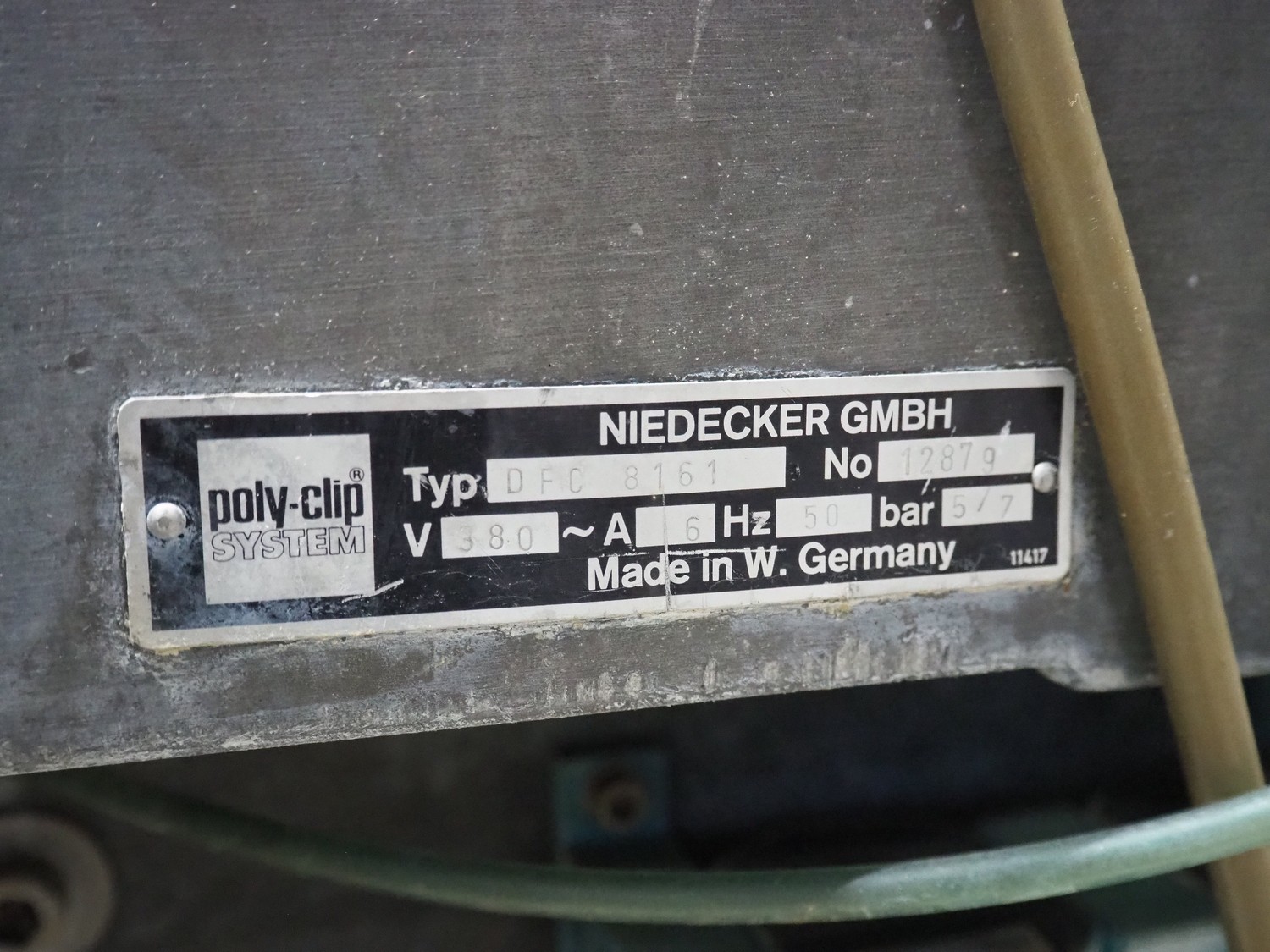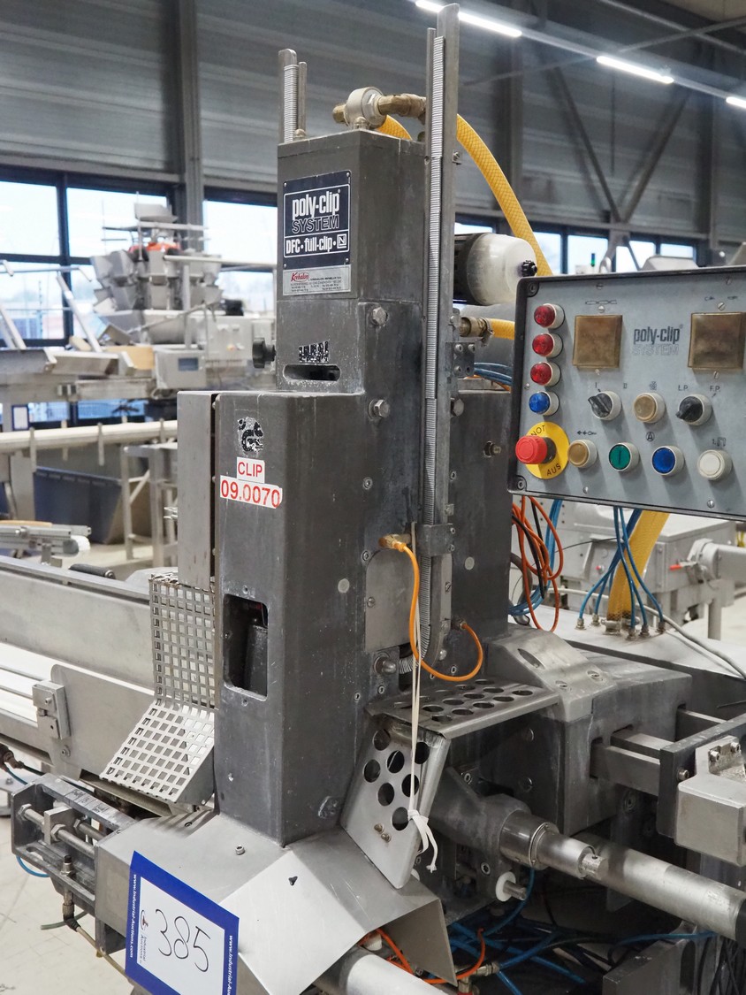 Poly-clip system GmbH & Co. KG mobile double automatic clipper, type: DFC 8161, number: 12879, 380 V, 1 Ph, 50 Hz, 5/7 bar, plastic belt, belt width: 185 mm, total dimensions: 2200 mm x 1100 mm x 1950 mm.