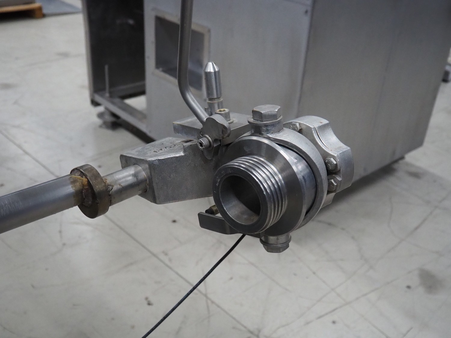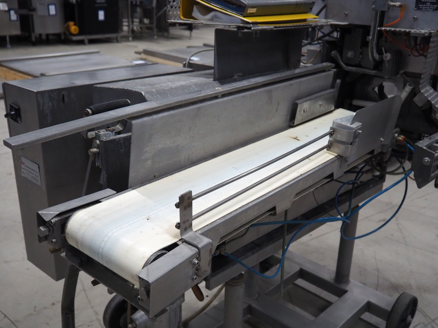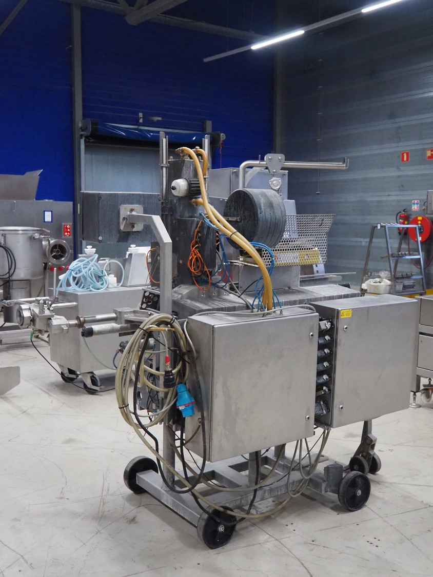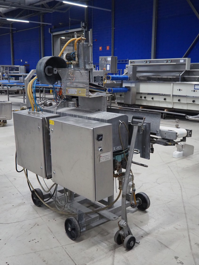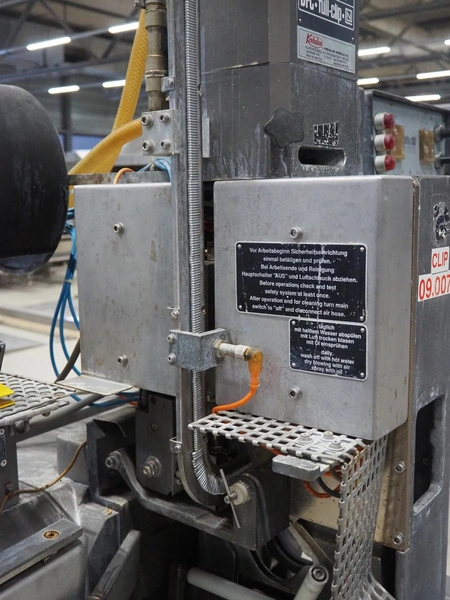 Poly-clip system GmbH & Co. KG mobile double automatic clipper, type: DFC 8161, number: 12879, 380 V, 1 Ph, 50 Hz, 5/7 bar, plastic belt, belt width: 185 mm, total dimensions: 2200 mm x 1100 mm x 1950 mm.