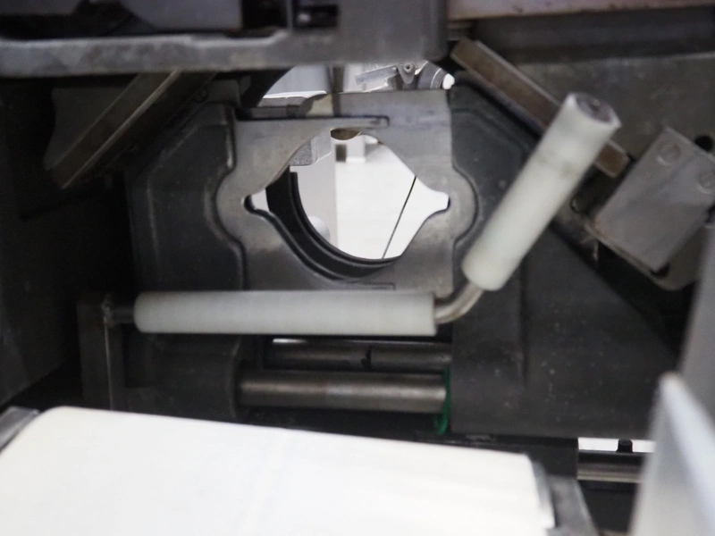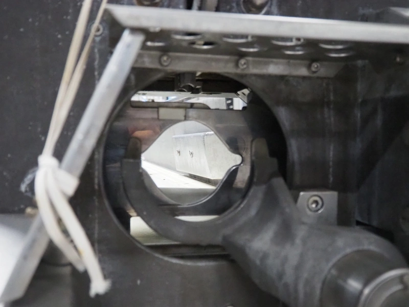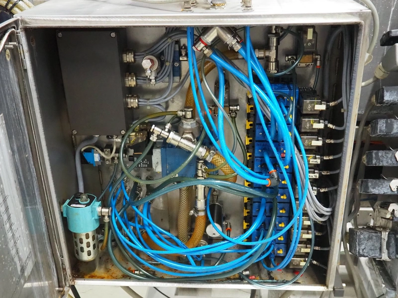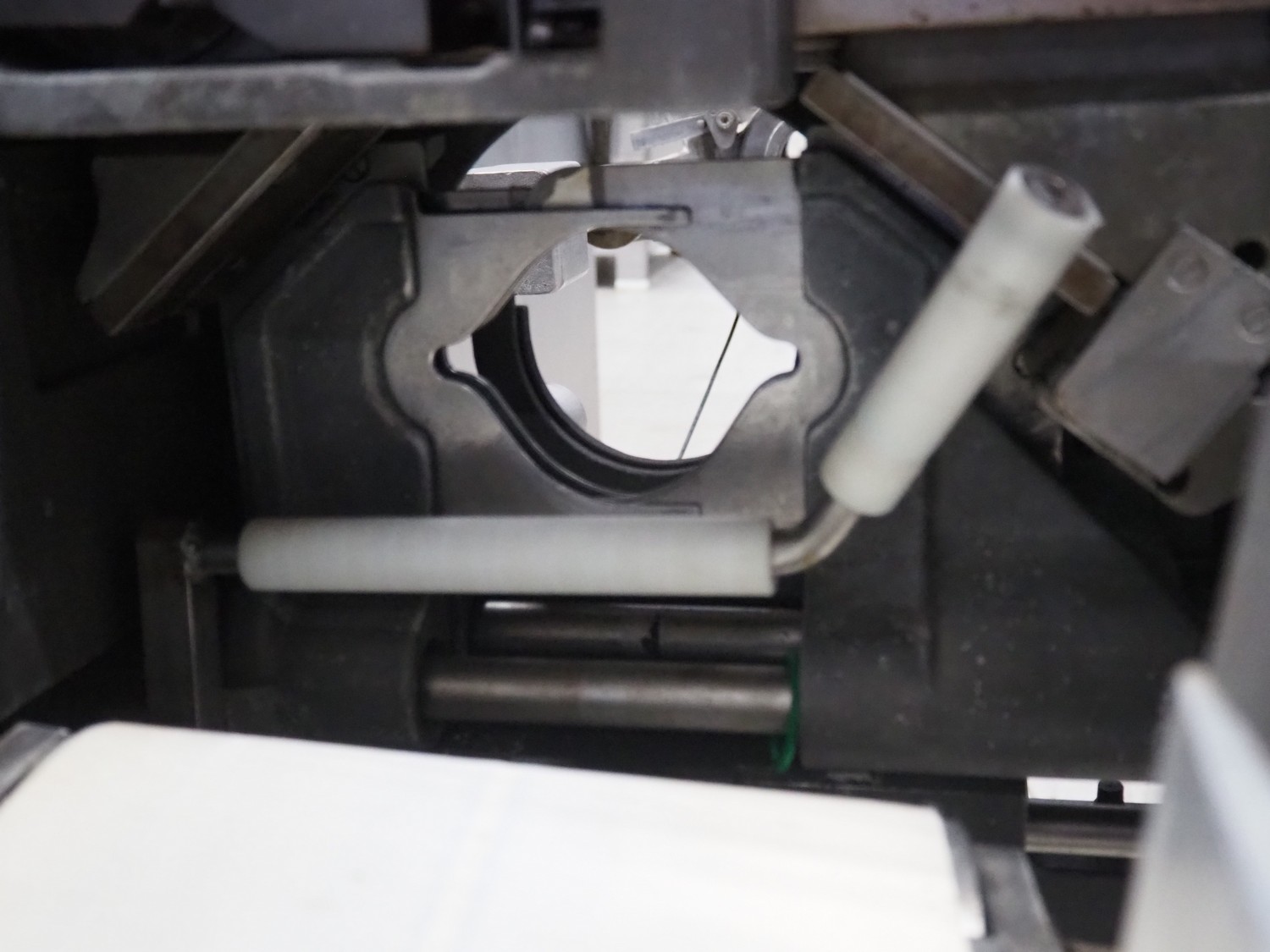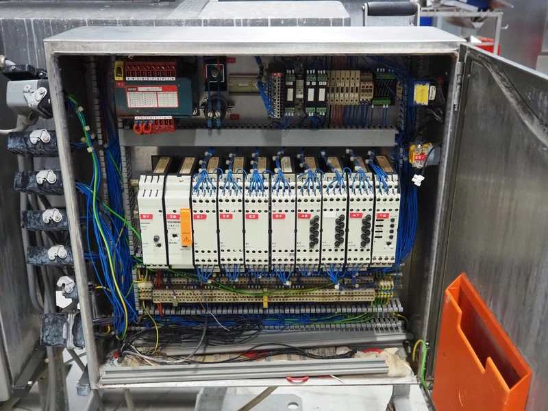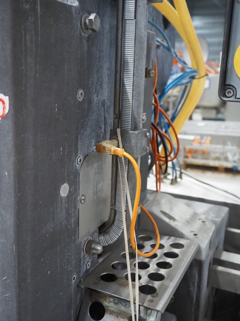 Poly-clip system GmbH & Co. KG mobile double automatic clipper, type: DFC 8161, number: 12879, 380 V, 1 Ph, 50 Hz, 5/7 bar, plastic belt, belt width: 185 mm, total dimensions: 2200 mm x 1100 mm x 1950 mm.