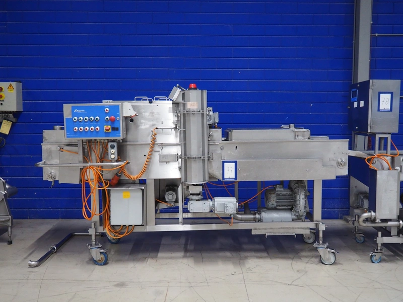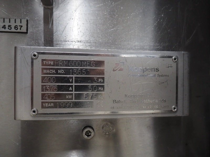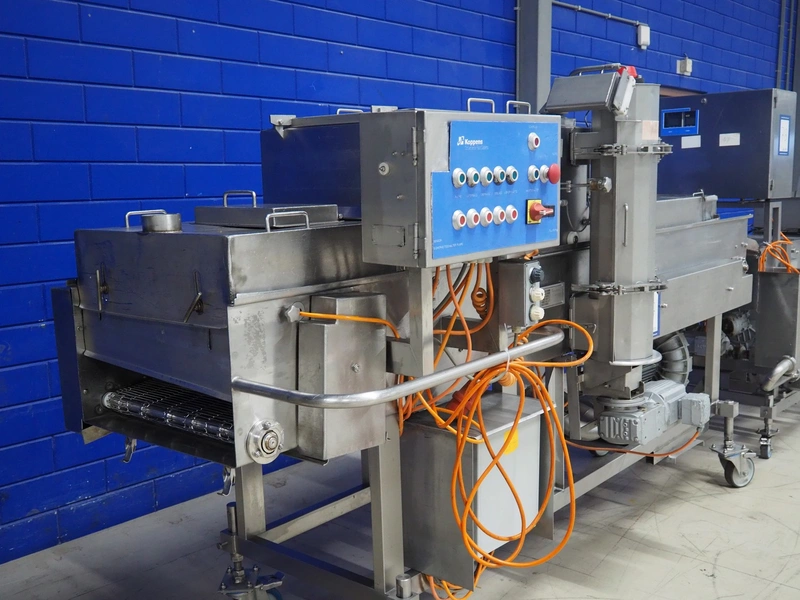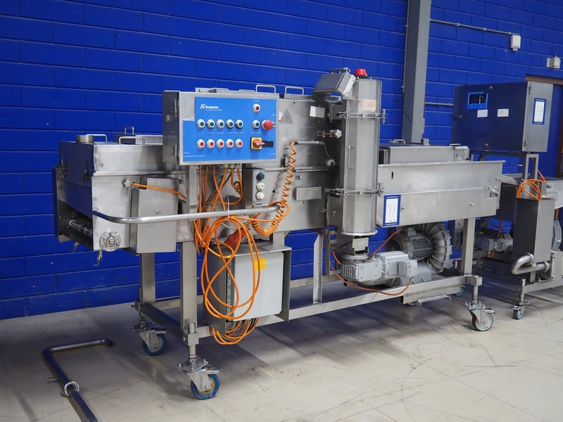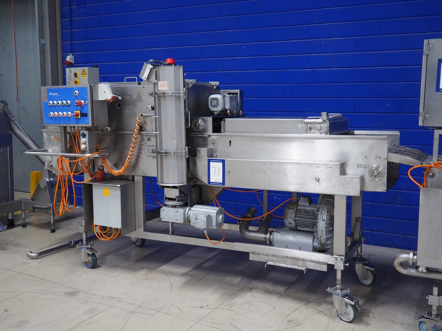 Koppens mobile pre-duster, type: PRM600MEG, machine number: 1365, year of construction: 1999, 400 V, 3 Ph, 50 Hz, 13.75 A, 4.05 kW, weight: 875 kg, s/s mesh belt, belt width: 600 mm, total dimensions: 3300 mm x 1100 mm x 1800 mm.