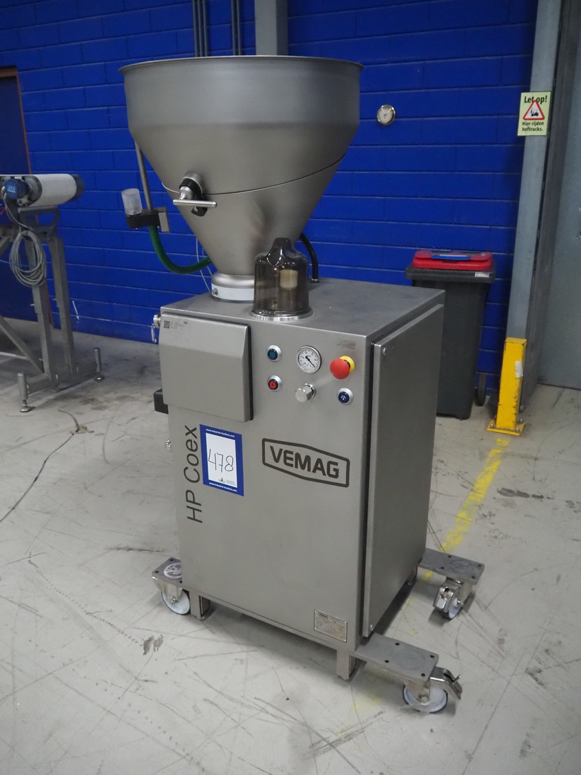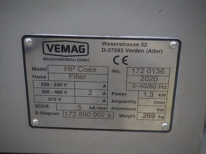 Vemag mobile co-extrusion machine, model: HP Coex, number: 172 0136, year of construction: 2020, 400-460 V, 3 Ph, 50/60 Hz, 2 A, 1.3 kW, 269 kg, Vemag vacuum pump, type: KC 0016 E 3Z0, serial number: CZM120160352, year of construction: 2020, capacity: 19 m³ per hour, dimensions: 1200 mm x 700 mm x 1750 mm.