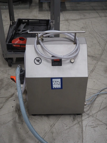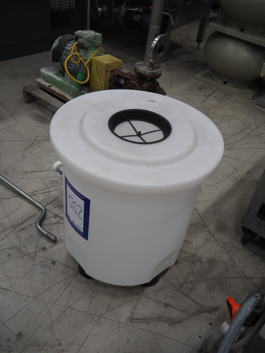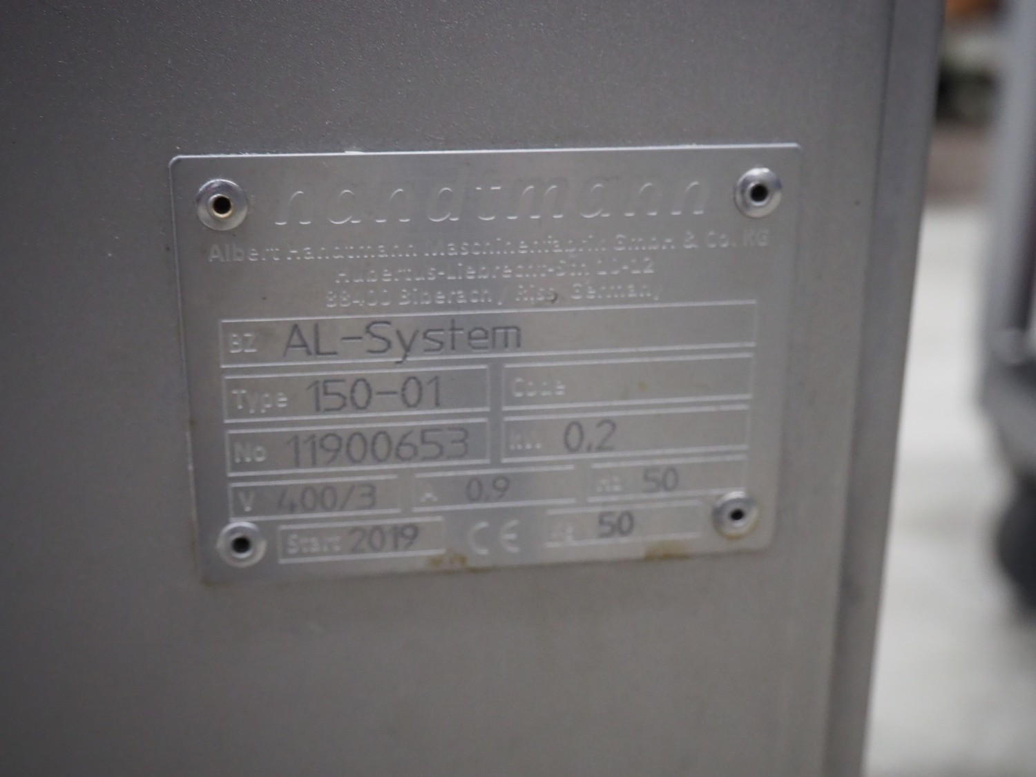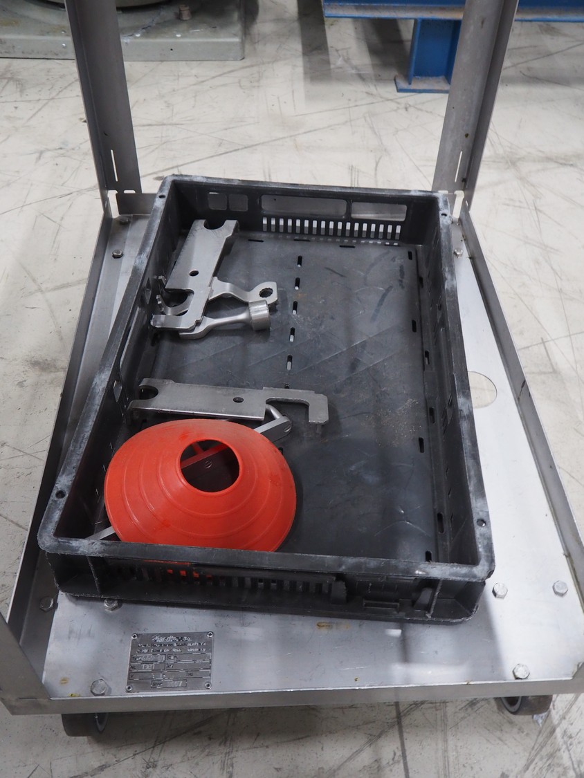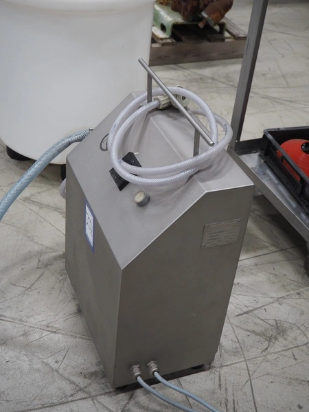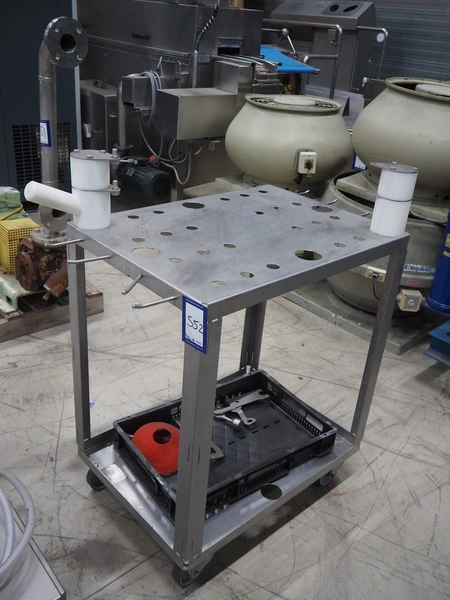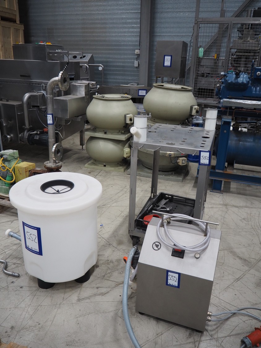 Handtmann coextrusion machine on s/s trolley, type: 150-01, number: 11900653, year of construction: 2019, 400 V, 3 Ph, 50 Hz, 0.9 A, 0.2 kW, dimensions: 950 mm x 700 mm x 1180 mm. With plastic tub, dimensions: Ø 570 mm x 630 mm.