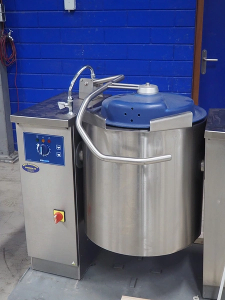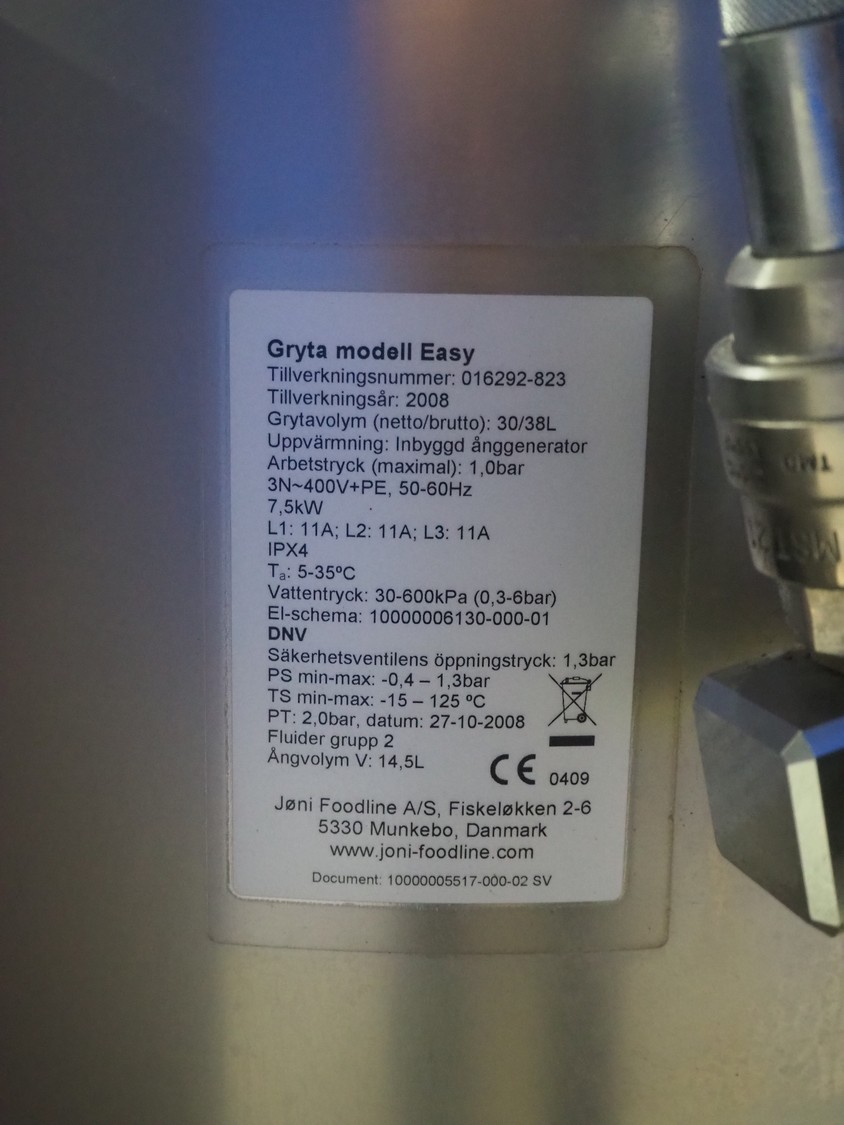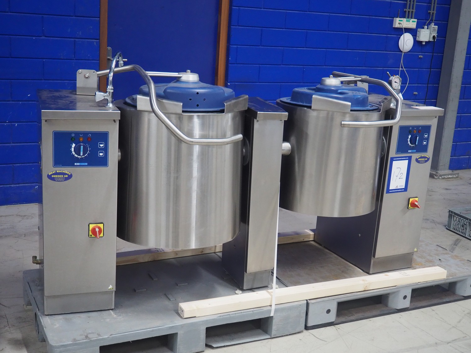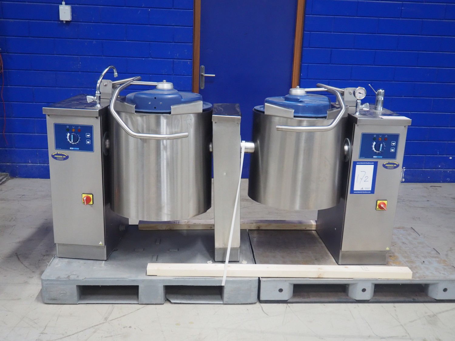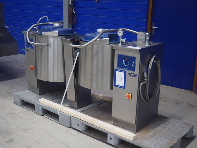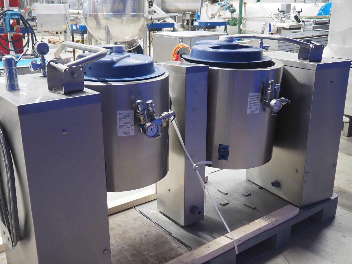 Jøni Foodline A/S double cooking vessel, model: Easy, serial number: 016292-822 and 016292-823, year of construction: 2008, 400 V, 3 Ph, 50 Hz, 15 kW volume: 50 liter and 30 liter, dimensions: 2100 mm x 850 mm x 1050 mm.