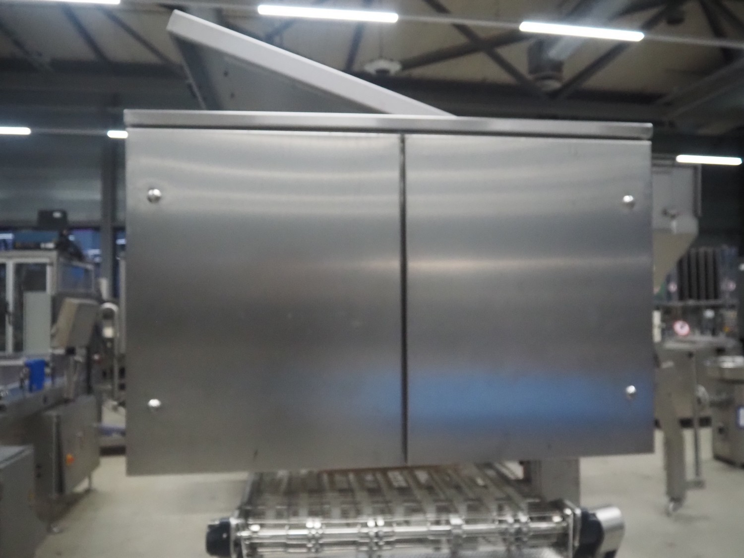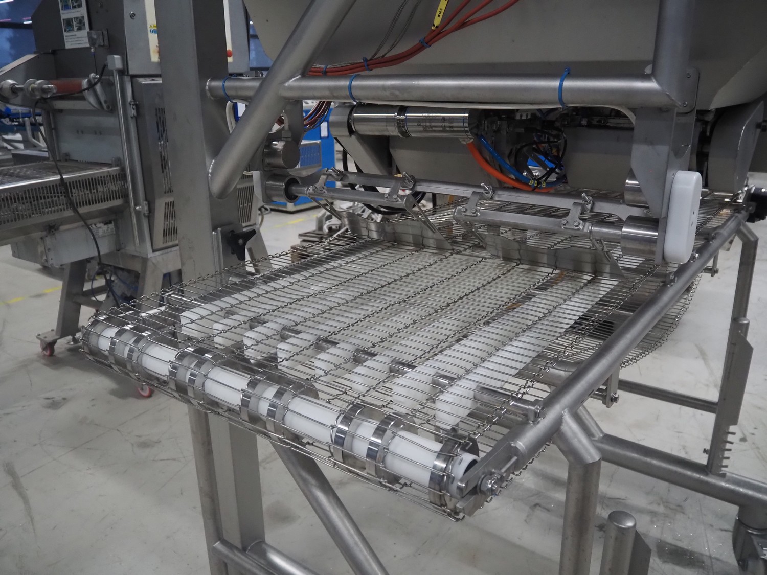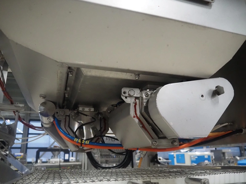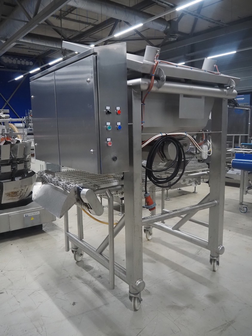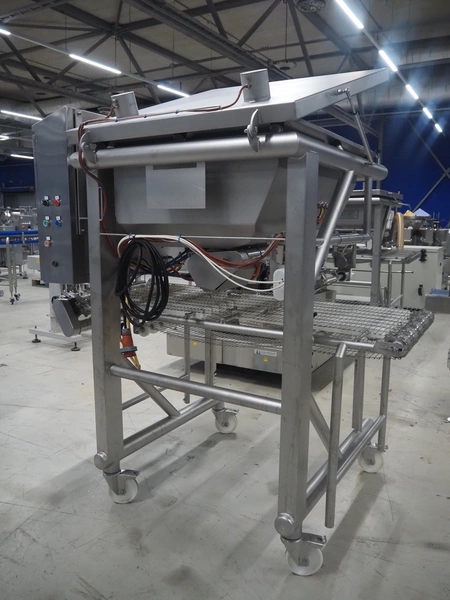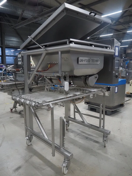 UNI-FOOD TECHNIC mobile depositor, s/s frame, s/s mesh belt, belt width: 710 mm, total dimensions: 1900 mm x 1300 mm x 2040 mm.