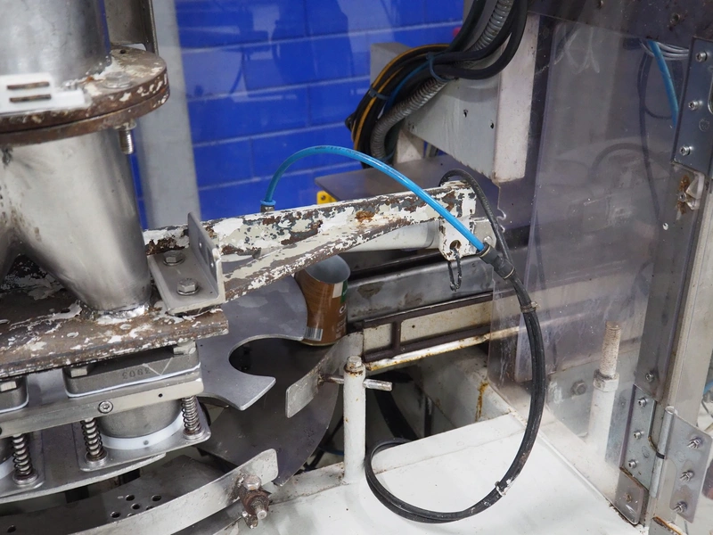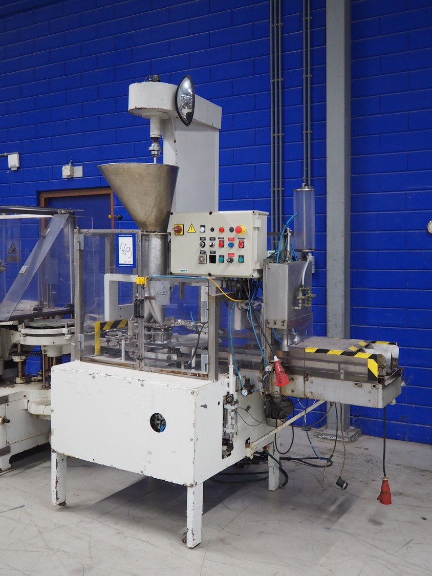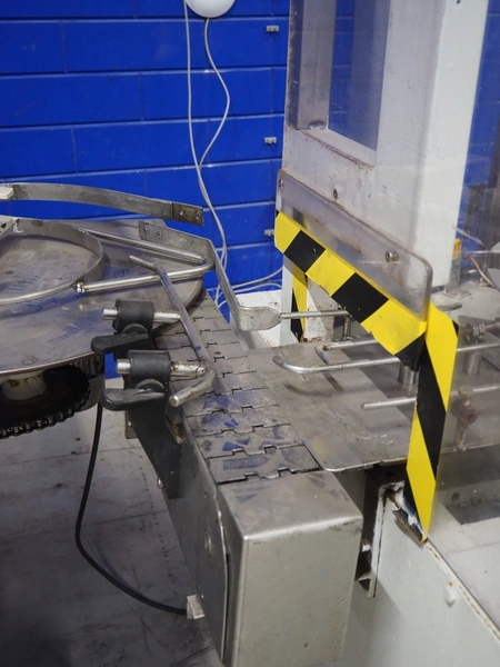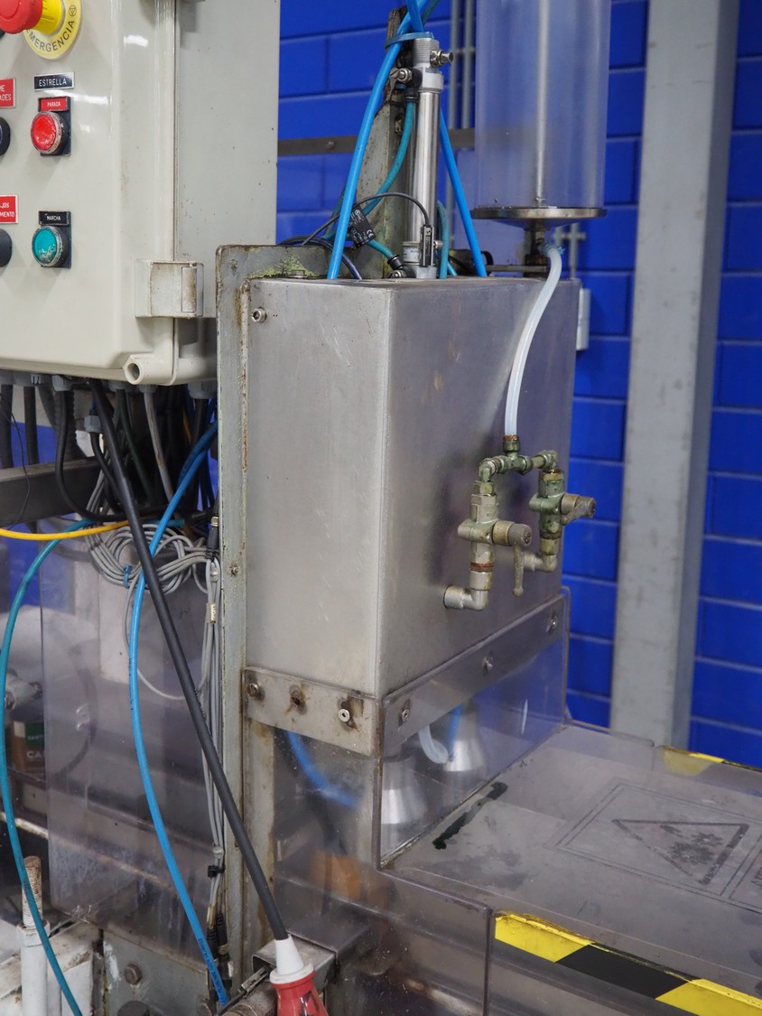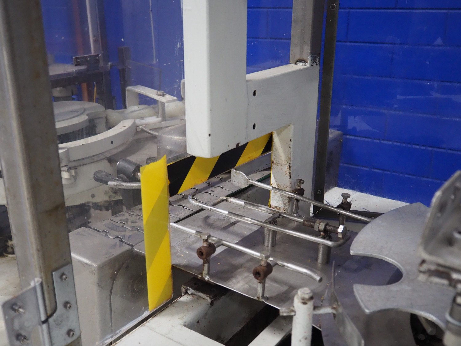 Can filling machine, double lane infeed belt, belt width: (2x) 80 mm, 8 stations, diameter cans: 70 mm, s/s outfeed belt, belt width: 100 mm, total dimensions: 2150 mm x 1100 mm x 1840 mm.