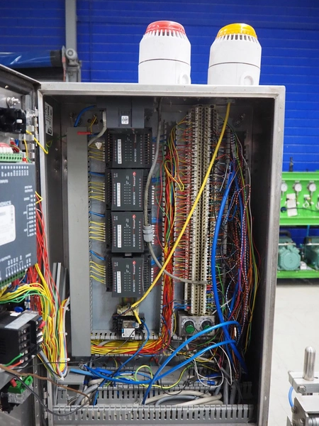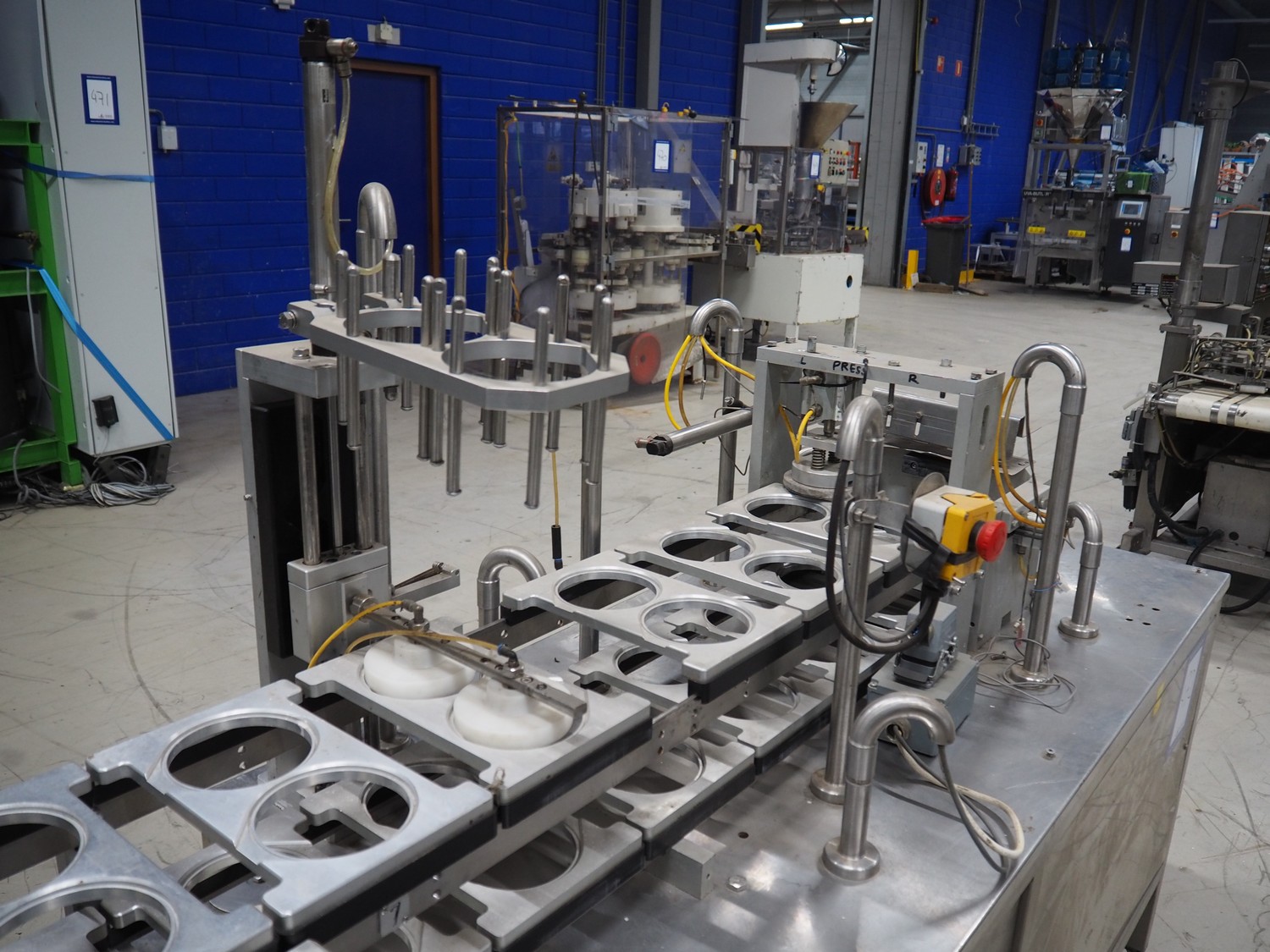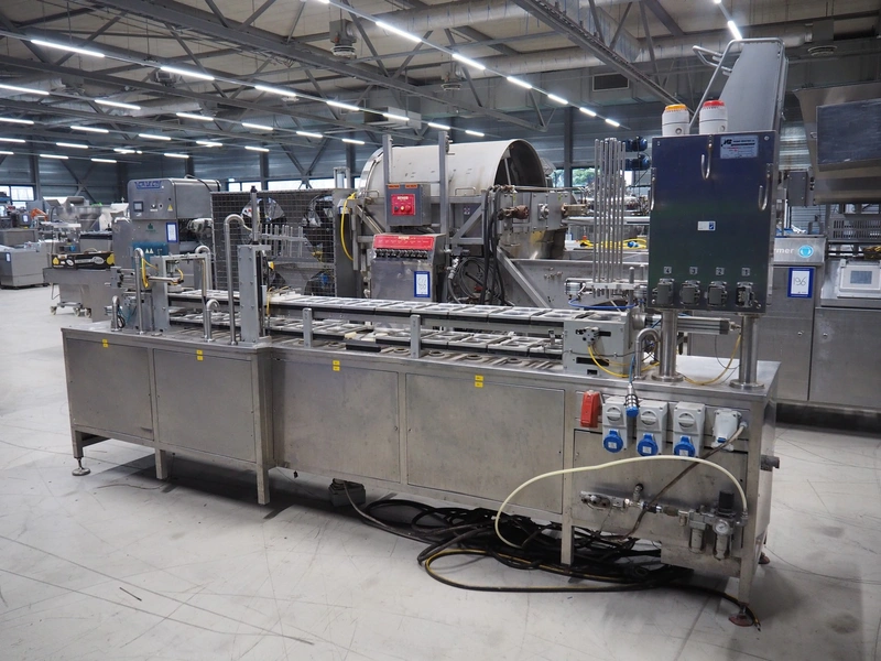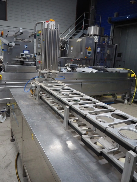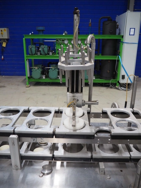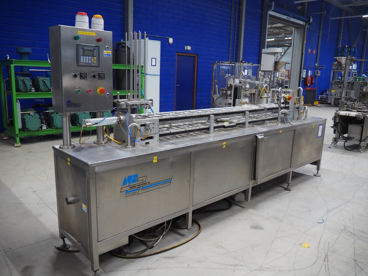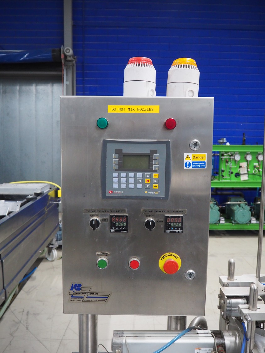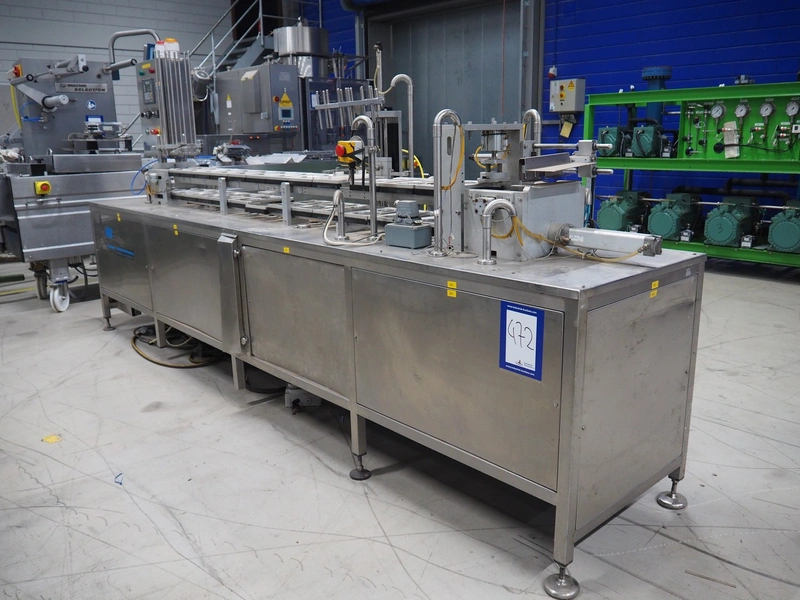 Nesbad Industries Ltd filling line consisting of: 2 denesters, model: MORAN II, number: 00171.12.02, 380 V, 50 Hz, 7400 W, Ø cups: (2x) 110 mm, total dimensions: 3690 mm x 710 mm x 1870 mm. Including pallet with parts, dimensions pallet: 1200 mm x 800 mm x 1180 mm.