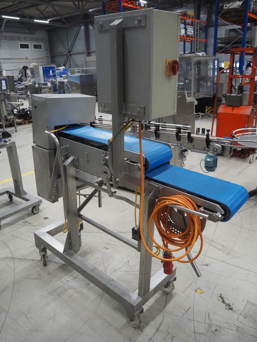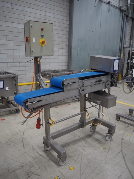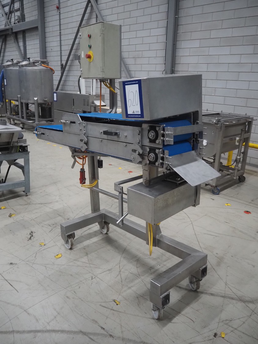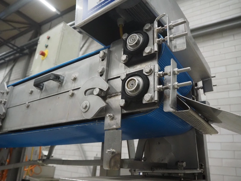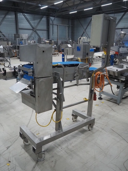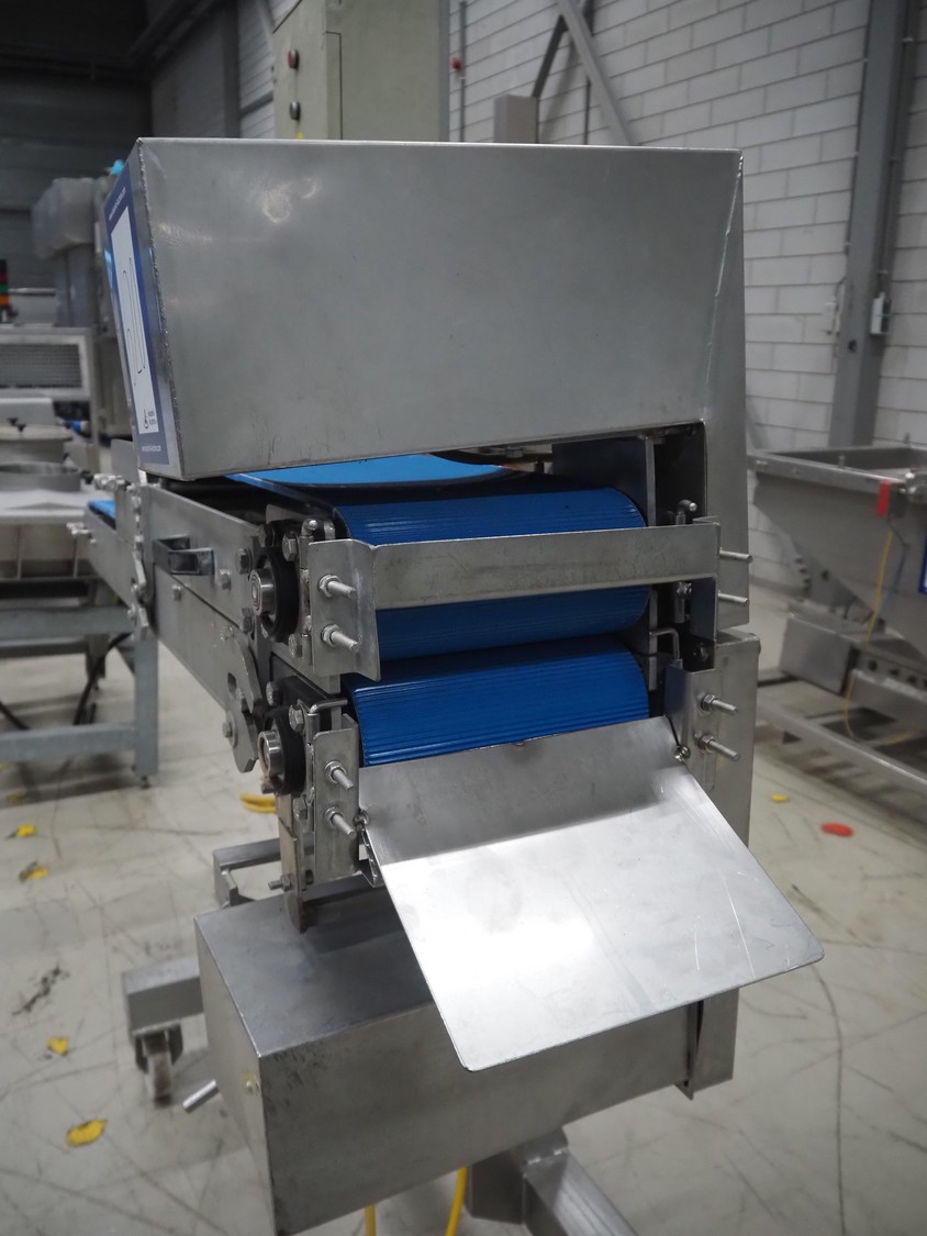 Mobile flattener, plastic belts, belt width: 250 mm, total dimensions: 1800 mm x 650 mm x 1910 mm.
