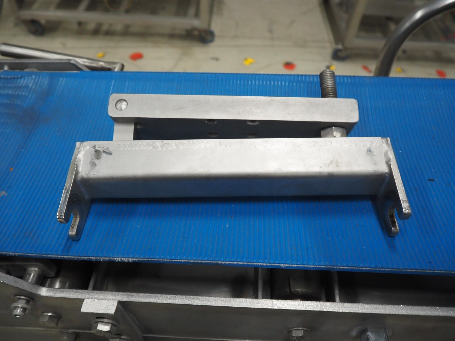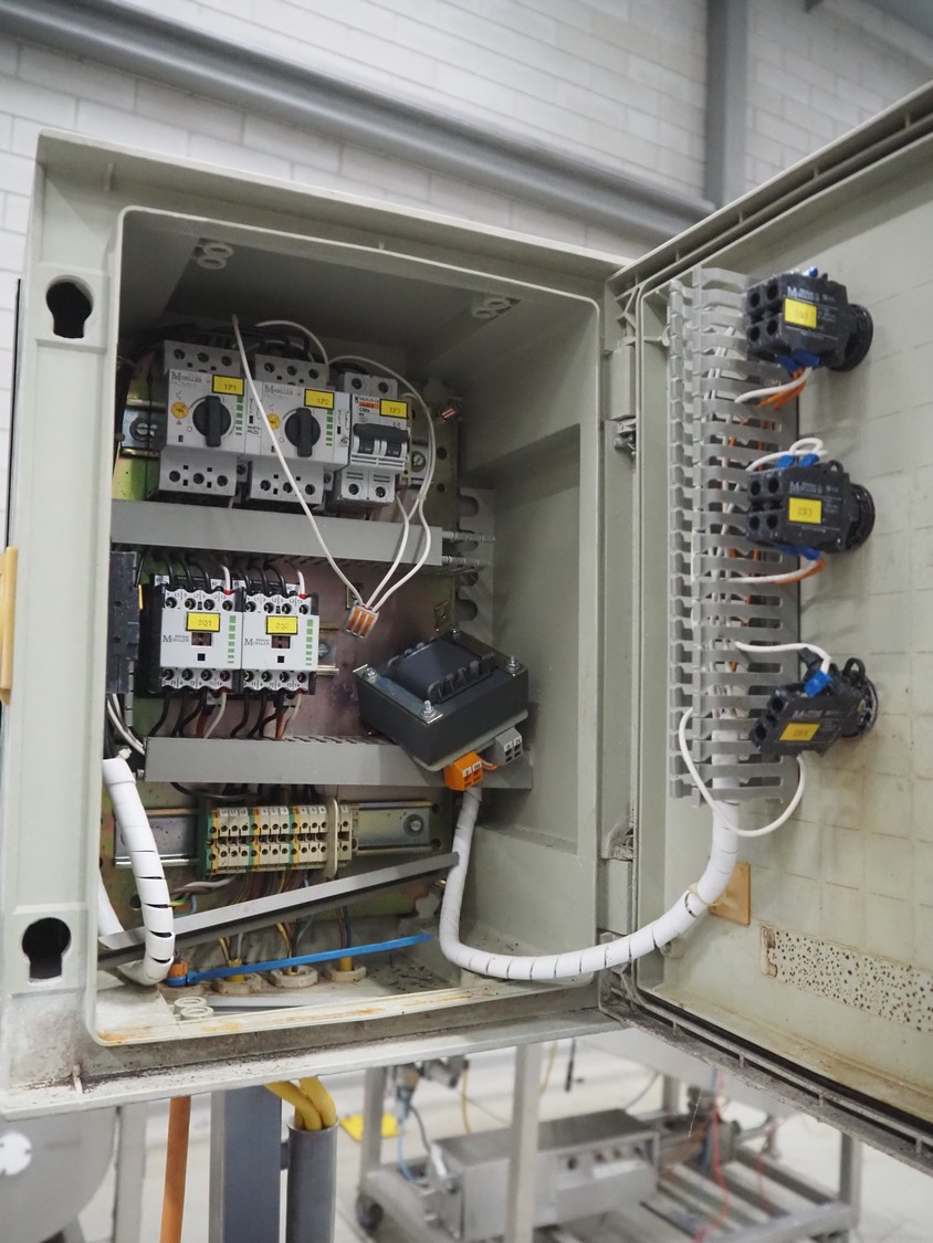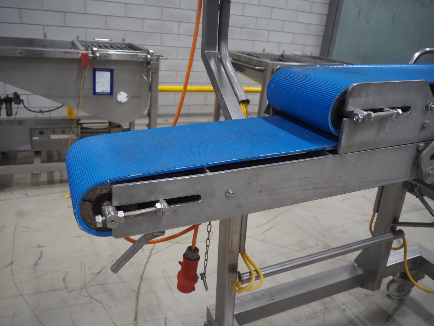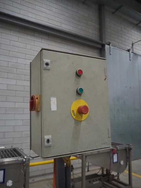 Mobile flattener, plastic belts, belt width: 250 mm, total dimensions: 1800 mm x 650 mm x 1910 mm.