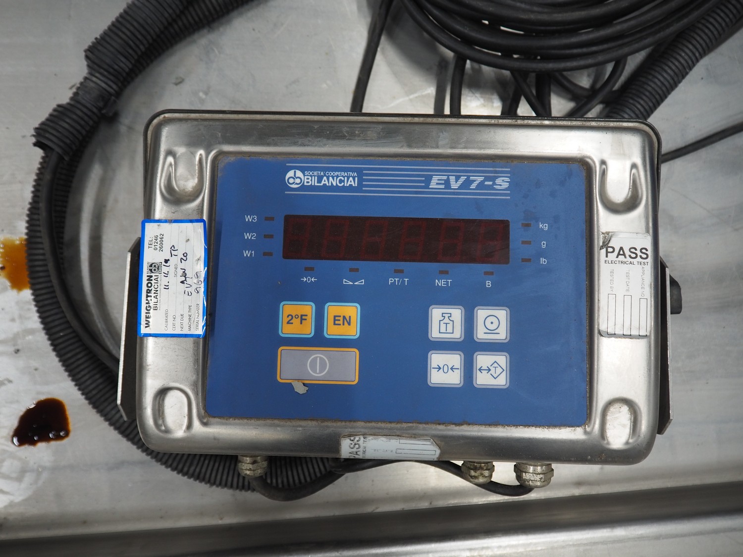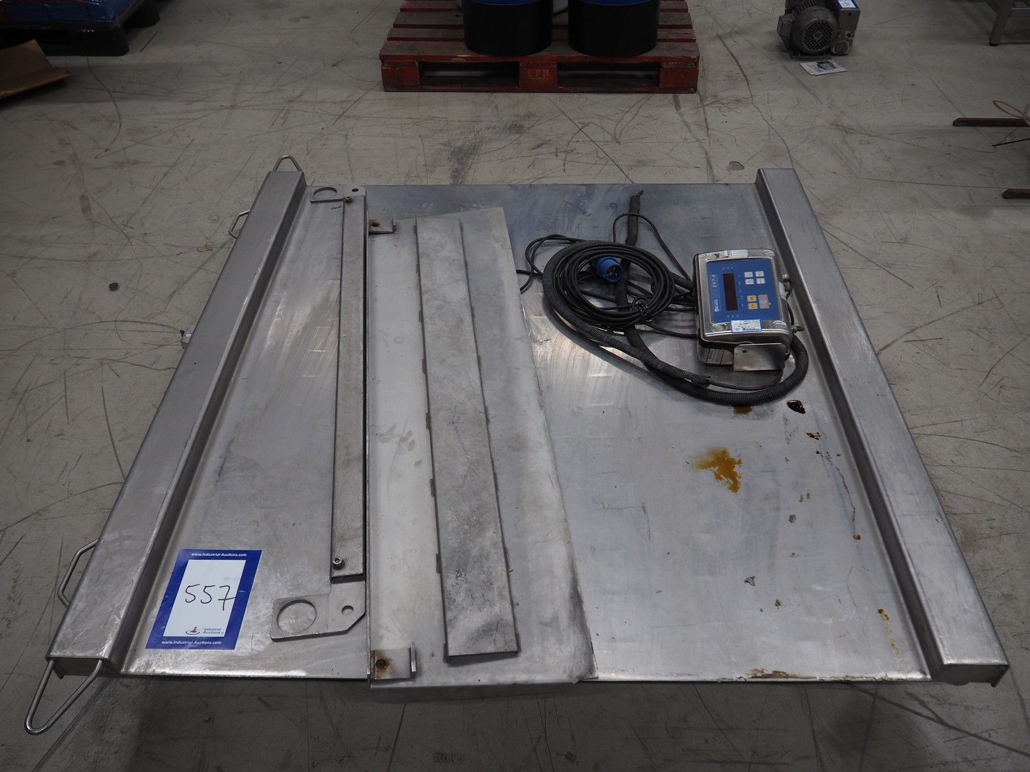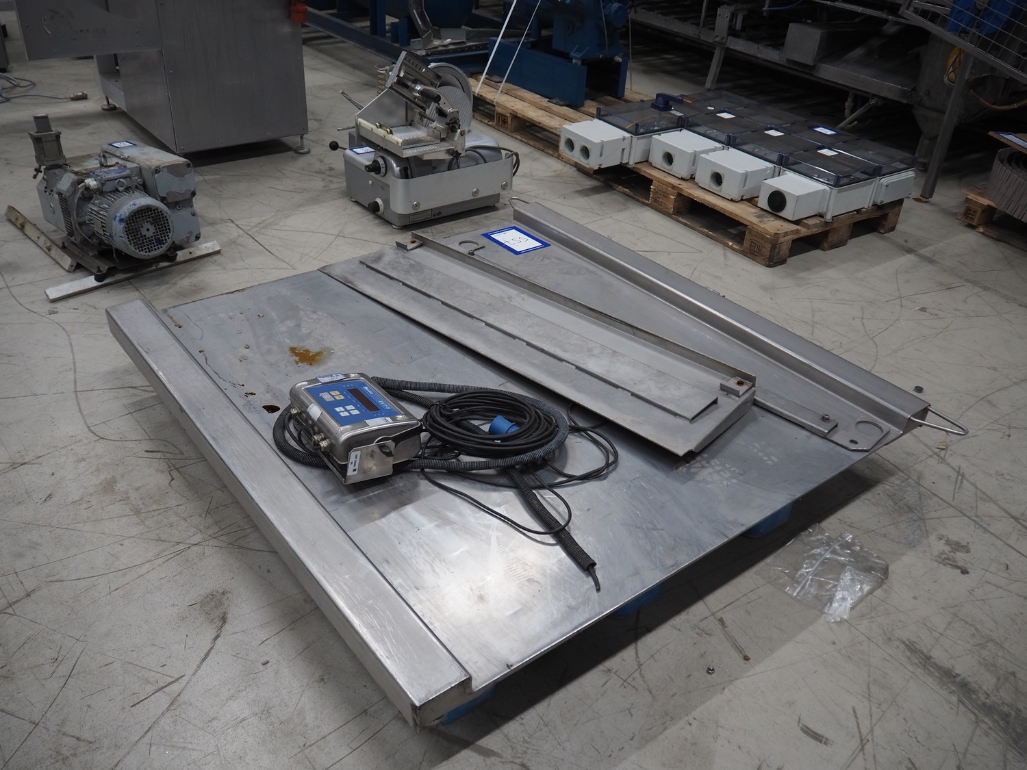 S/s floor weighing scale with Bilanciai indicator, serial number: 281969, dimensions scale: 1250 mm x 1500 mm, total dimensions: 1600 mm x 1750 mm x 100 mm.