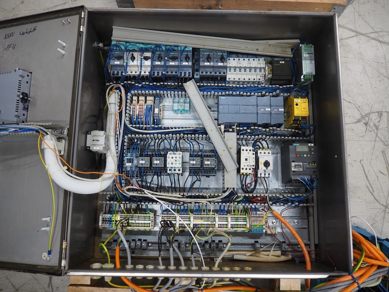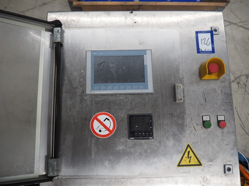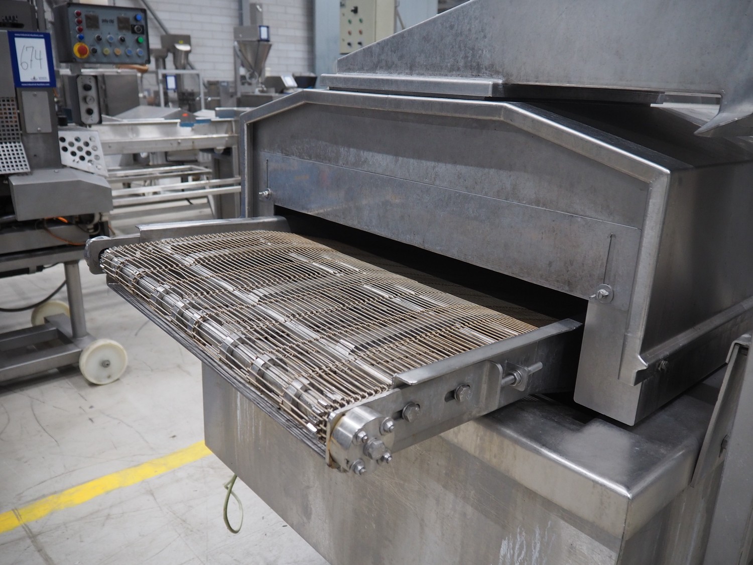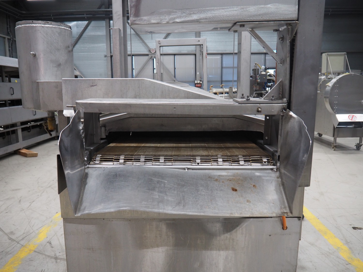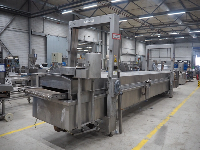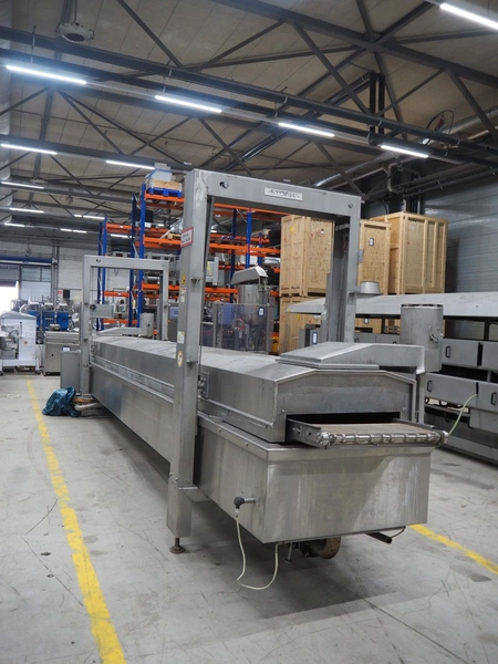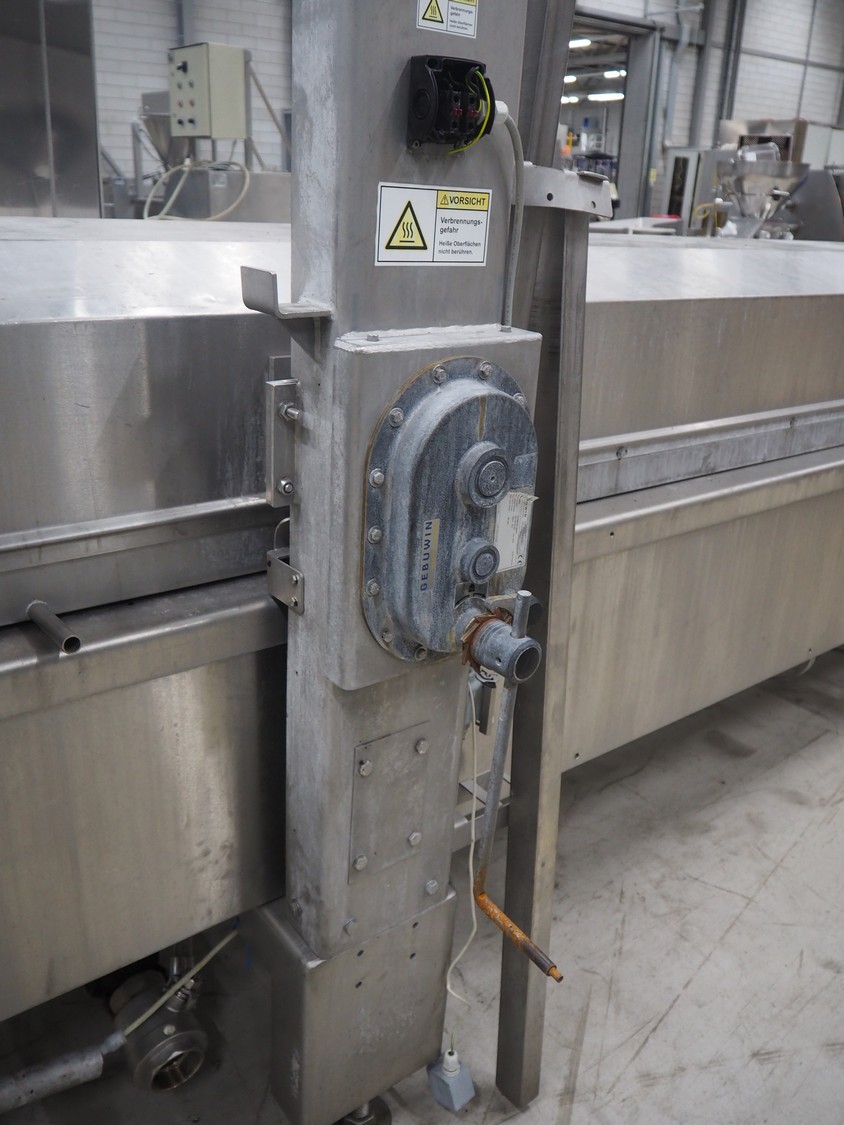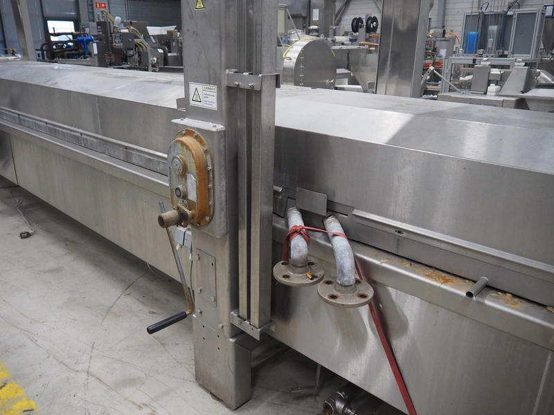 Stork belt fryer, type: TBM 630/5000, serial number: 4T210506, s/s mesh belt, belt width: 630 mm, thermal oil, volume: 1200 liter, total dimensions: 8600 mm x 1700 mm x 2400 mm.