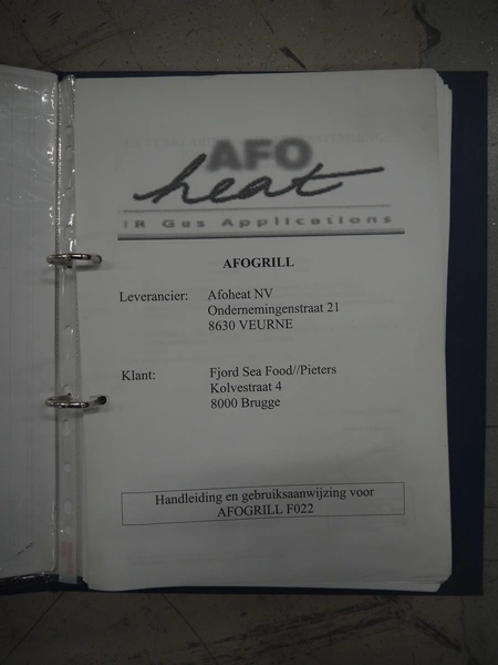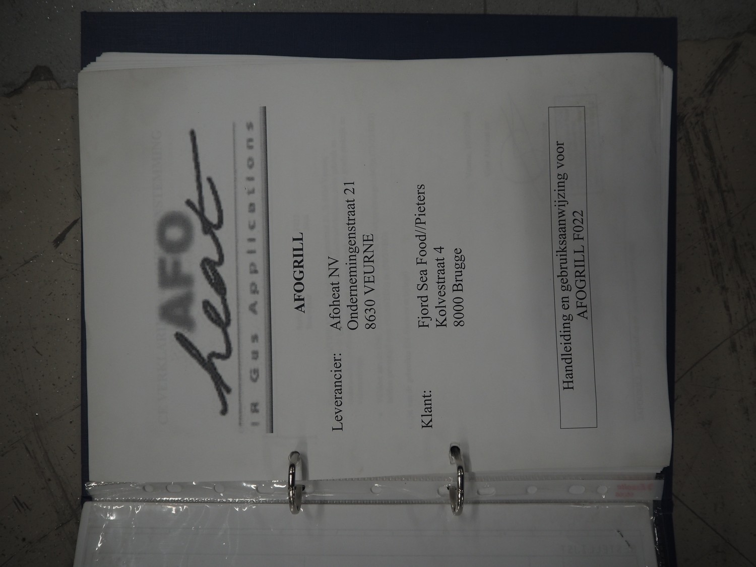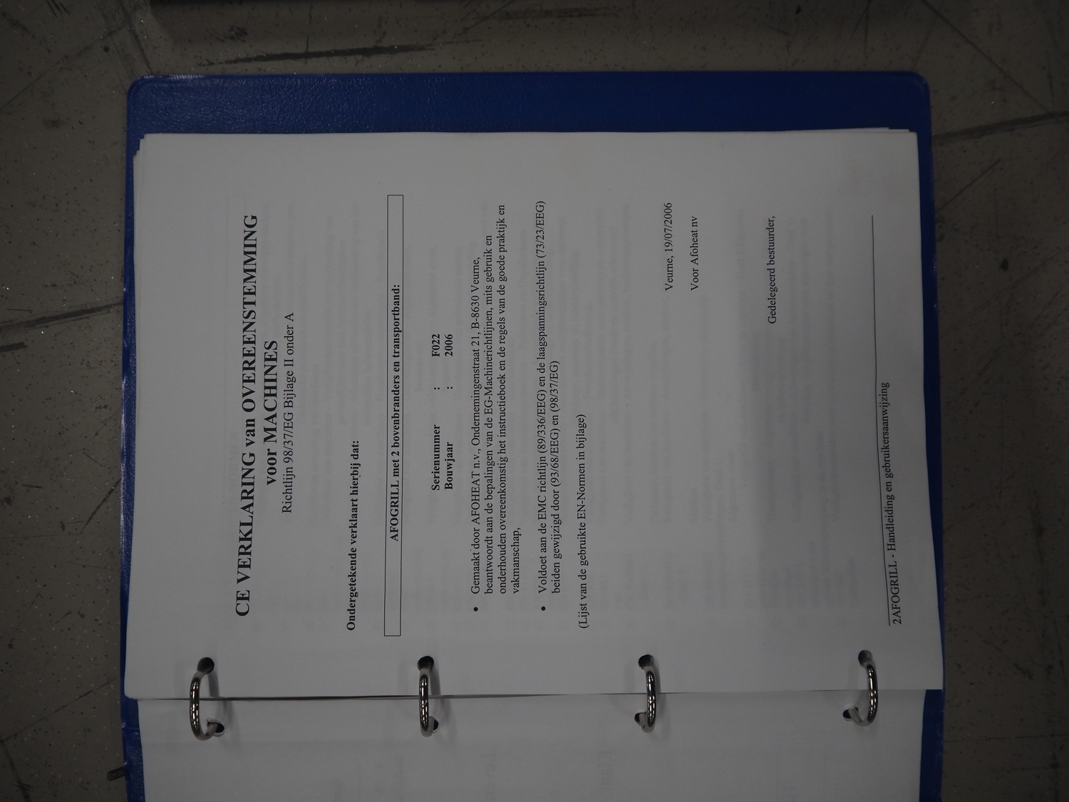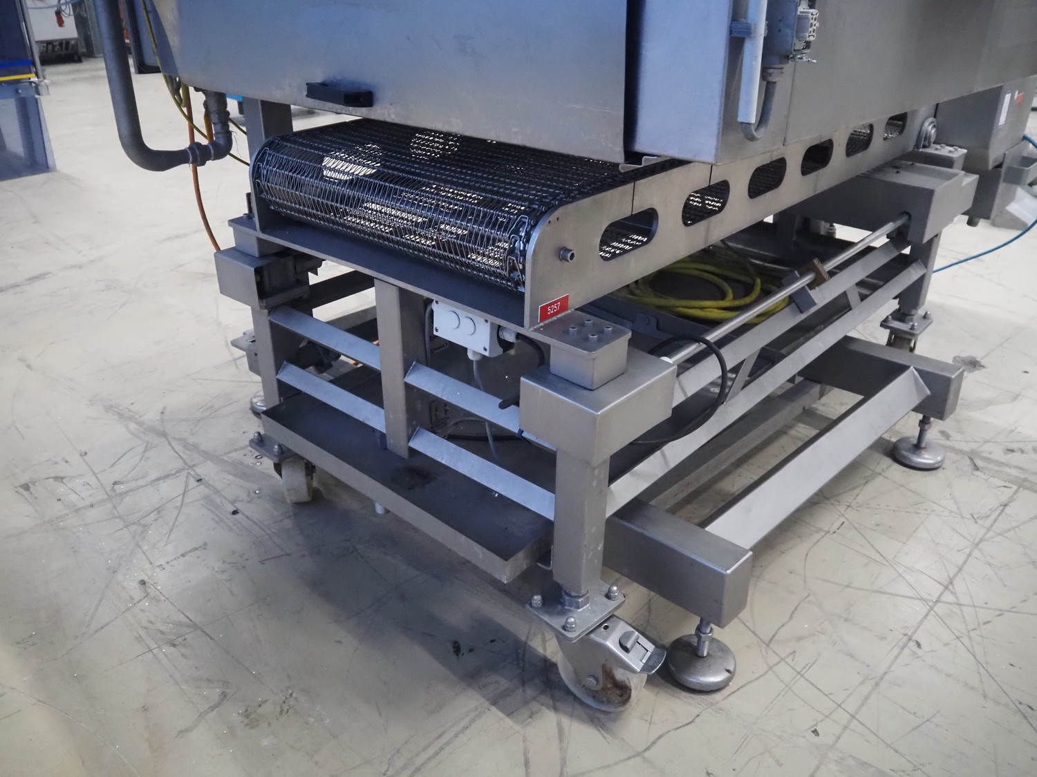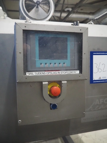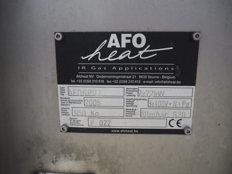 AFO Heat grill, type: AFOGRILL, serial number: F 022, year of construction: 2006, 400 V, 3 Ph, (2x) 72 kW, weight: 950 kg, s/s mesh belt, belt width: 630 mm, clearance: 700 mm x 220 mm, total dimensions: 2350 mm x 1800 mm x 2210 mm.