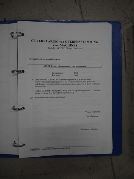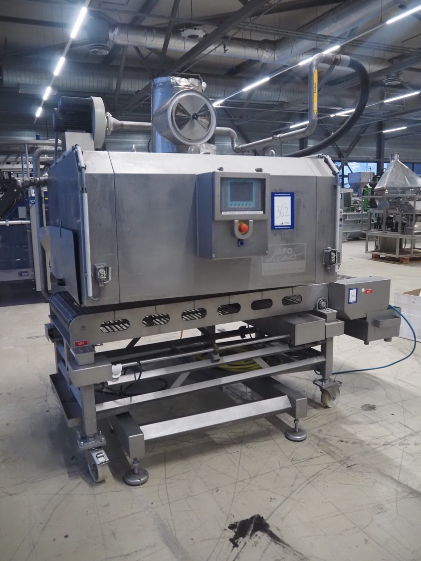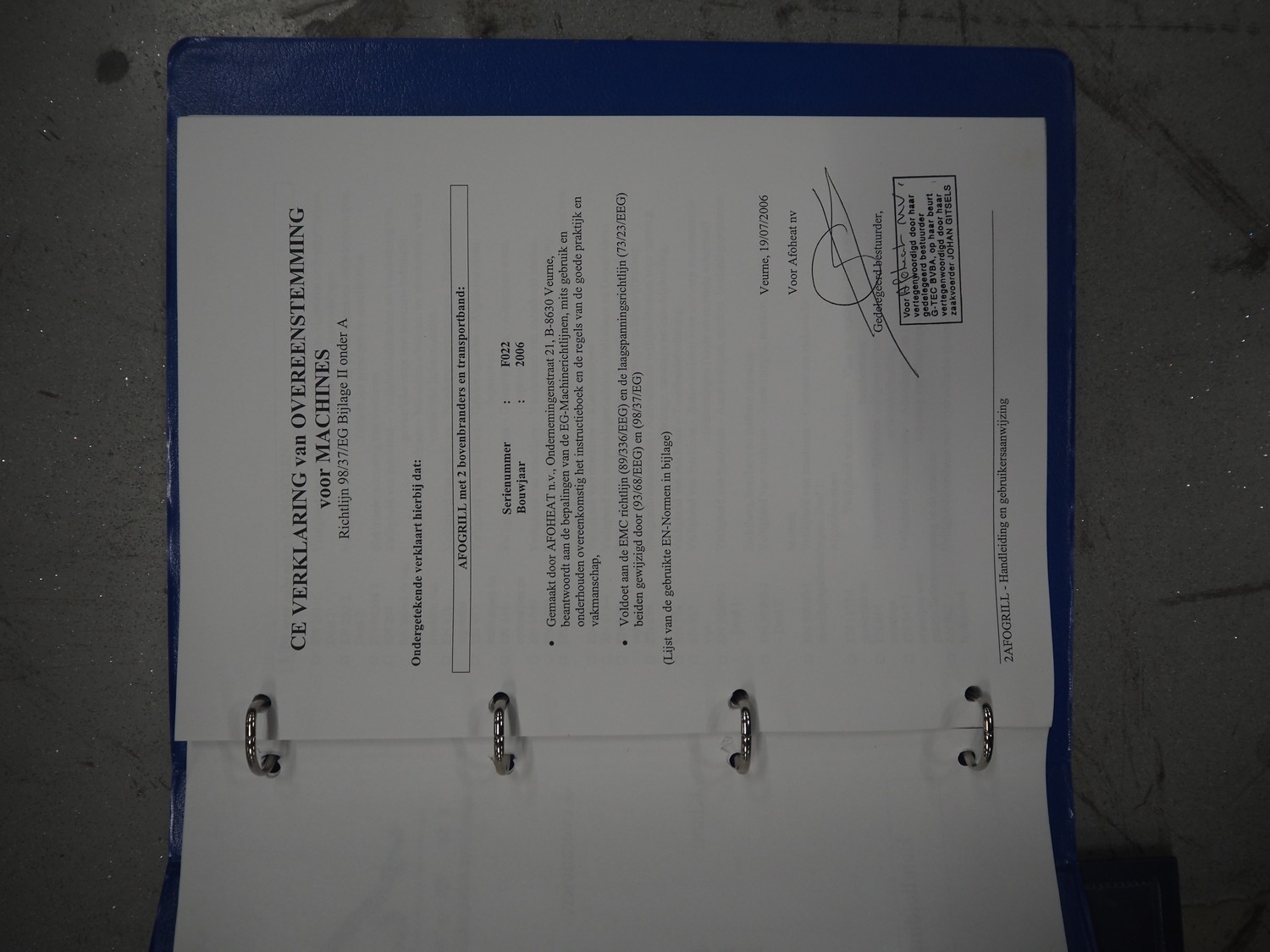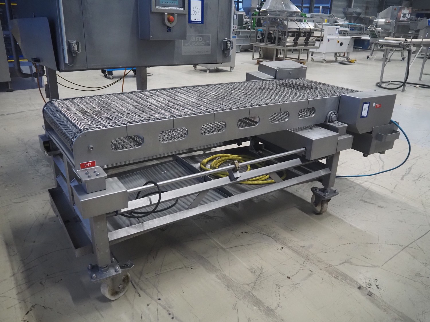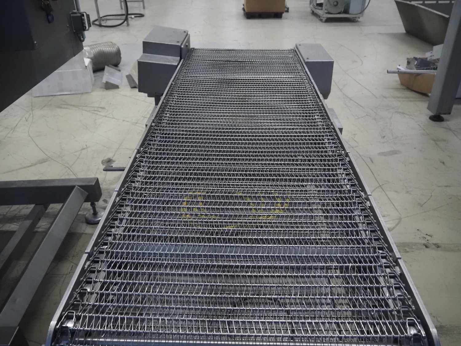 AFO Heat grill, type: AFOGRILL, serial number: F 022, year of construction: 2006, 400 V, 3 Ph, (2x) 72 kW, weight: 950 kg, s/s mesh belt, belt width: 630 mm, clearance: 700 mm x 220 mm, total dimensions: 2350 mm x 1800 mm x 2210 mm.