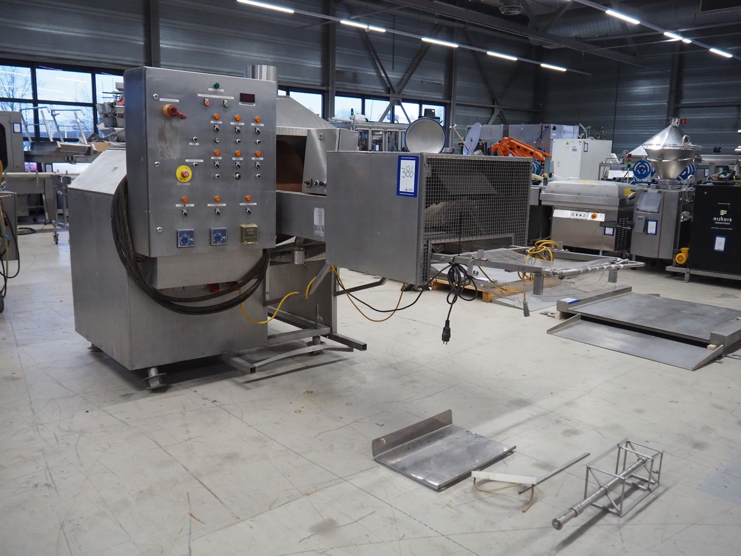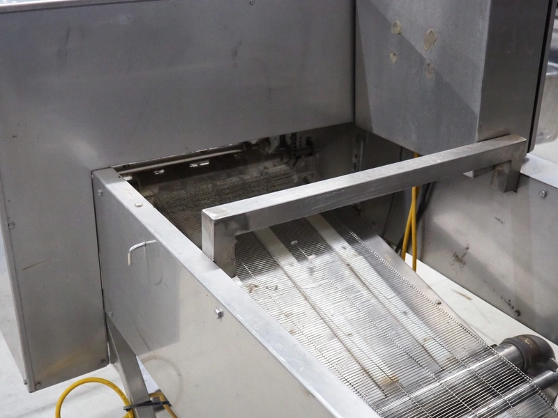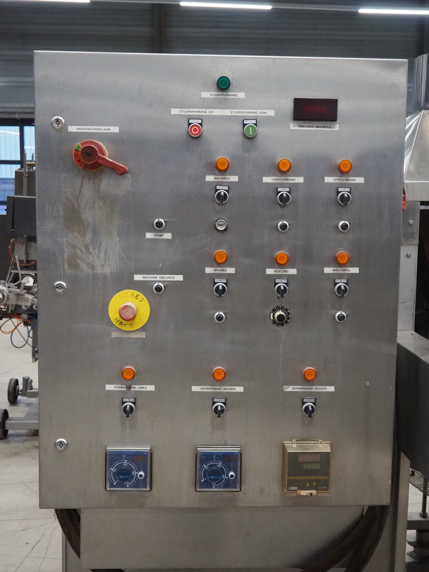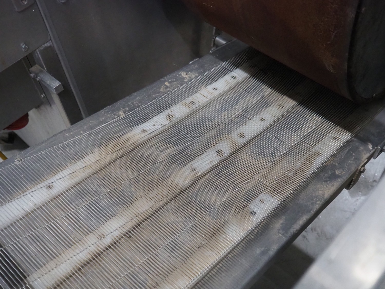 S.A. Balpe blintz machine, s/s mesh belt, belt width: 300 mm, diameter roller: 800 mm, total dimensions: 3500 mm x 1800 mm x 2300 mm. With additional parts.