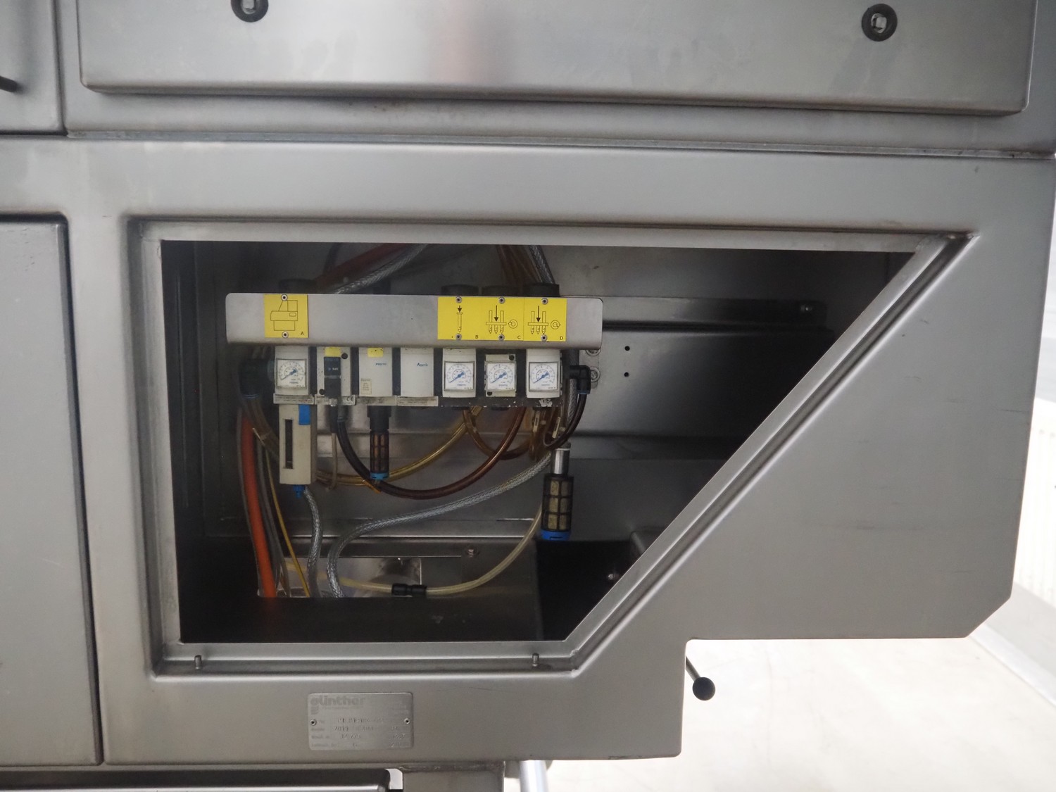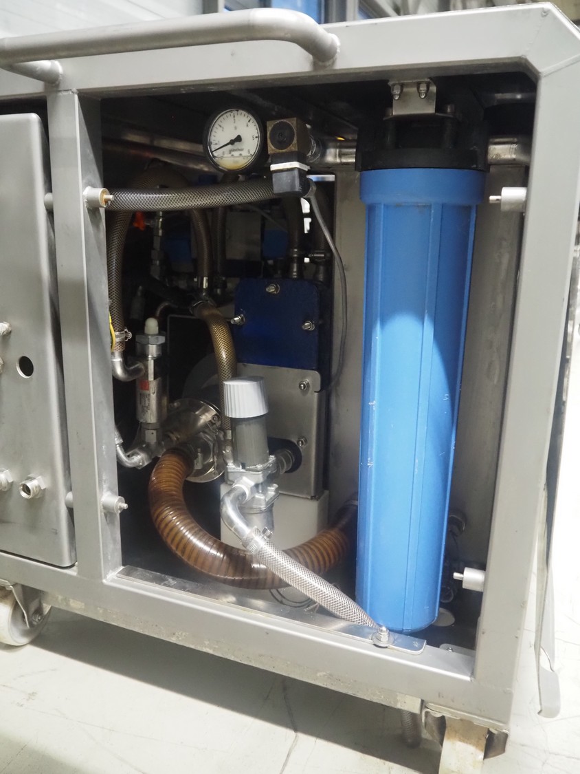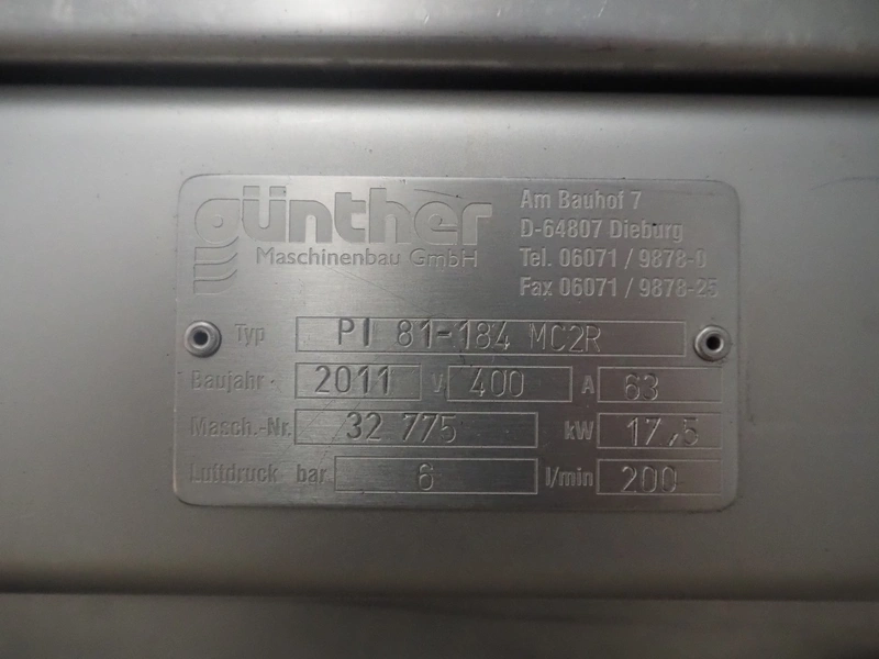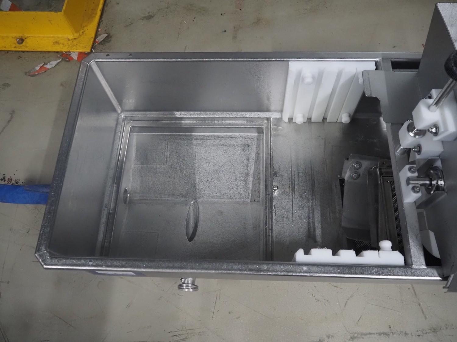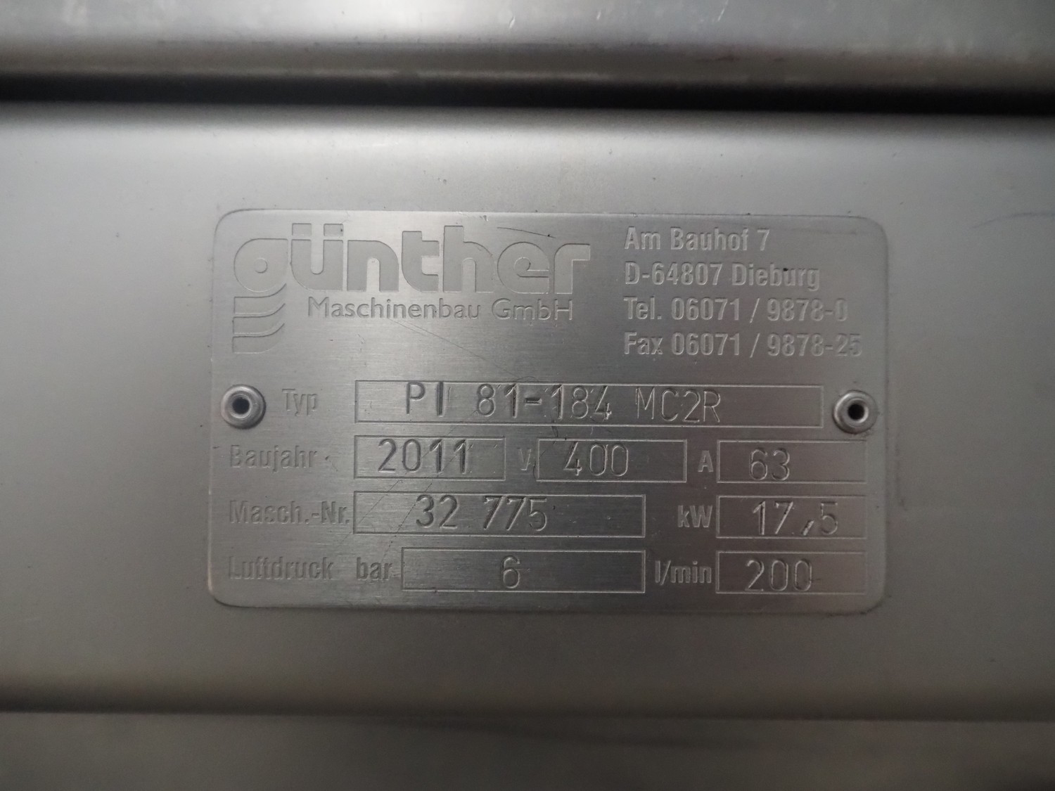 Günther Maschinenbau GmbH injector with filter tub and pump, type: PI81-184 MC2R, machine number: 32 775, year of construction: 2011, 400 V, 63 A, 17.5 kW, plastic mesh belt, belt width: 450 mm, total dimensions: 2320 mm x 1300 mm x 2500 mm, dimensions filter tub: 1900 mm x 600 mm x 900 mm, dimensions pump: 1850 mm x 780 mm x 500 mm, dimensions filter system: 1100 mm x 740 mm x 760 mm.
