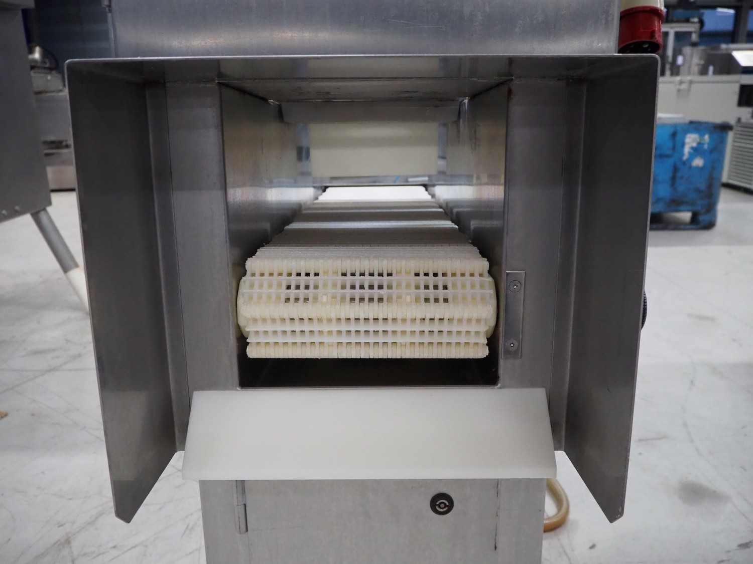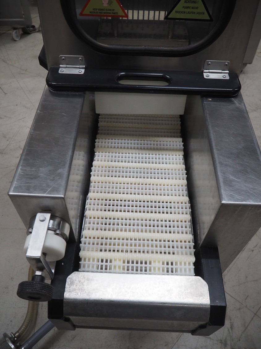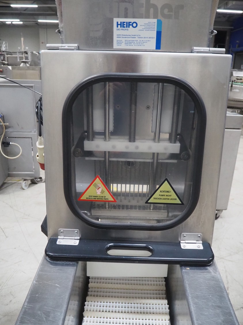 Günther injector, plastic mesh belt, belt width: 250 mm, 17 needles, clearance: 260 mm x 200 mm, total dimensions: 1300 mm x 470 mm x 1460 mm.