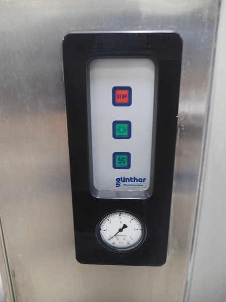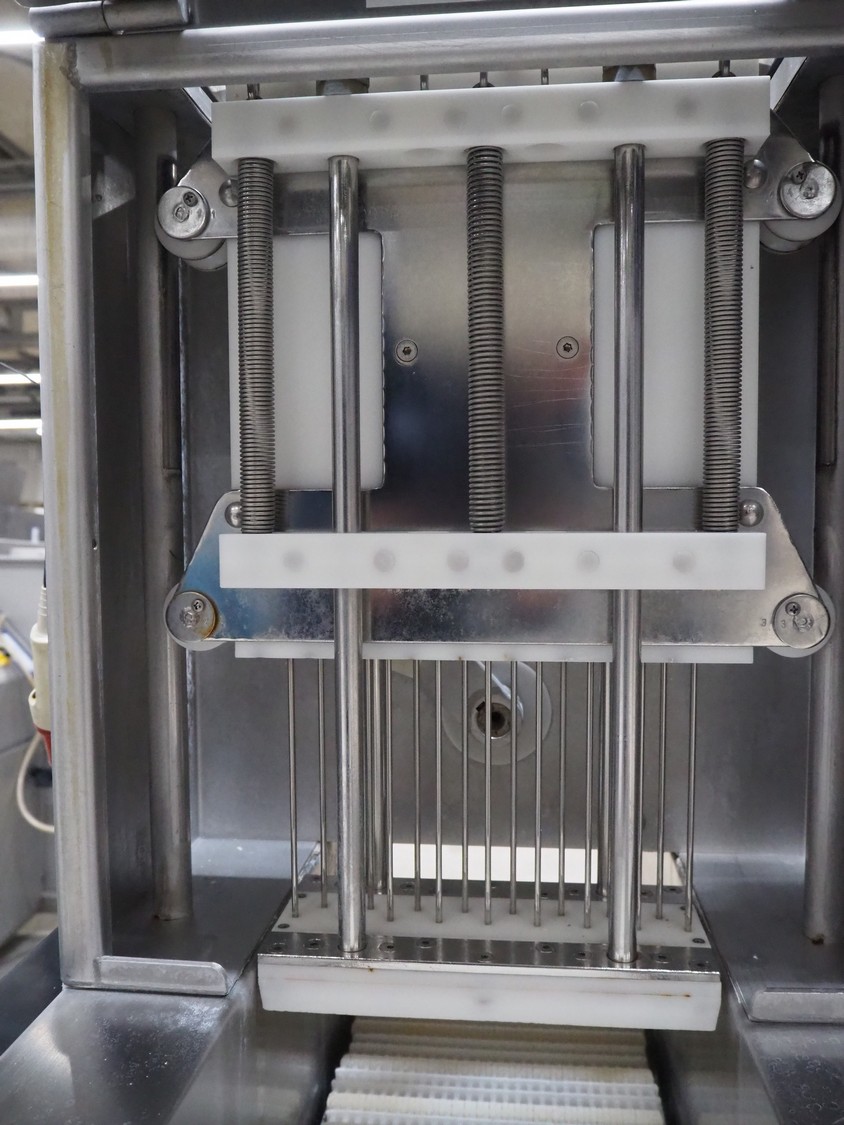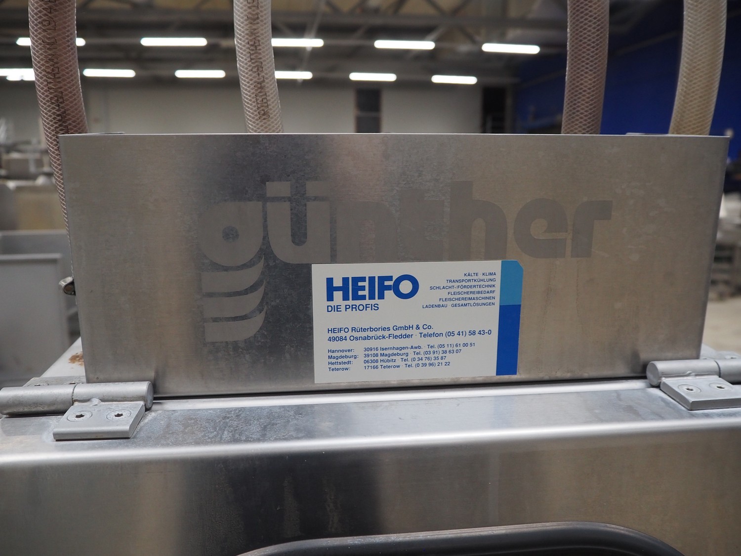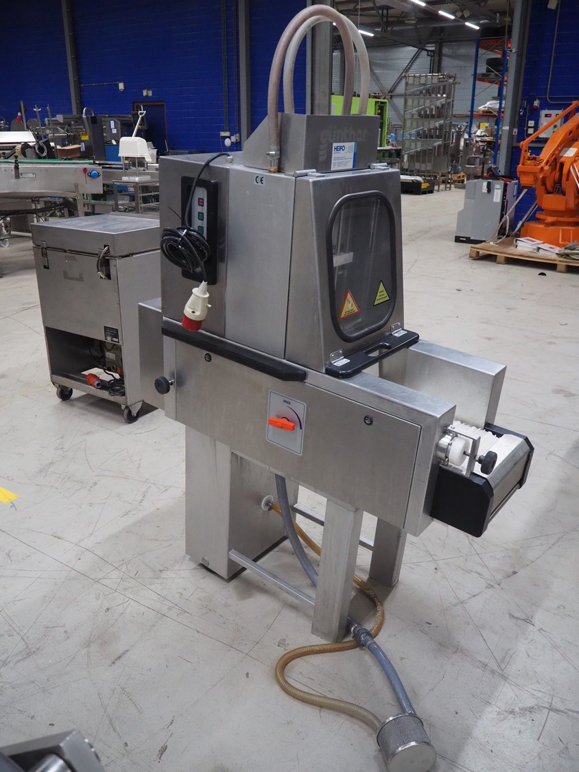 Günther injector, plastic mesh belt, belt width: 250 mm, 17 needles, clearance: 260 mm x 200 mm, total dimensions: 1300 mm x 470 mm x 1460 mm.