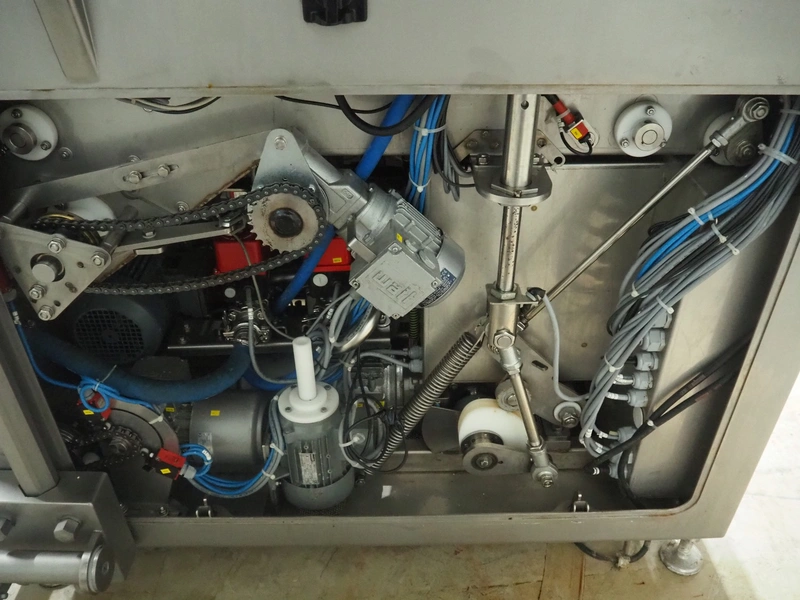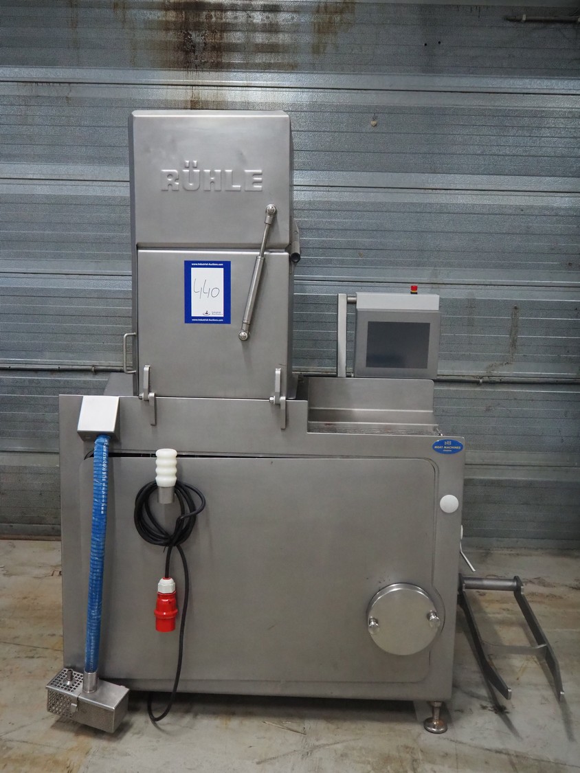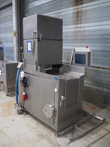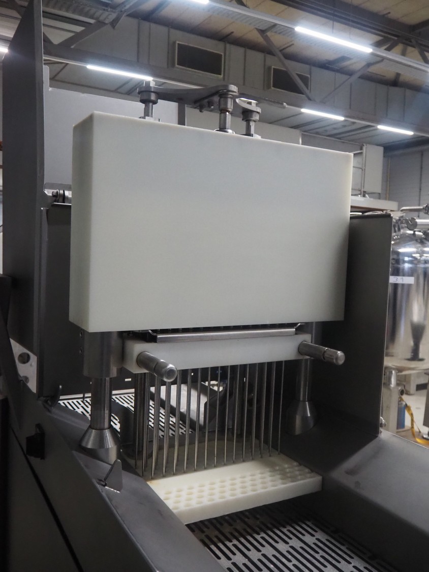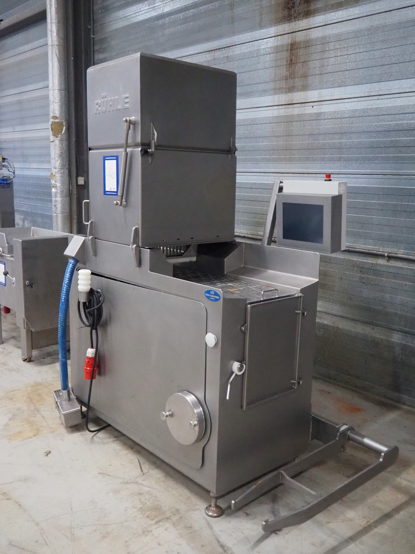 Rühle GmbH injector with lifter for crates, 56 needles, s/s walking beam, beam width: 340 mm, total dimensions: 1700 mm x 900 mm x 2000 mm.