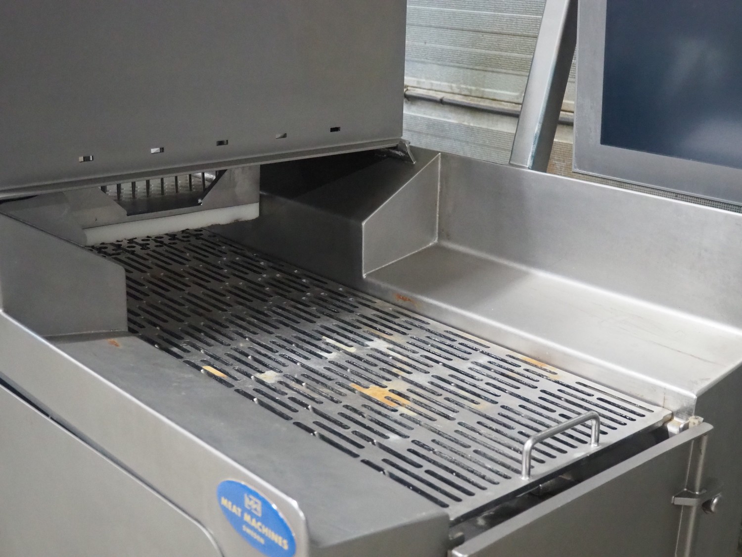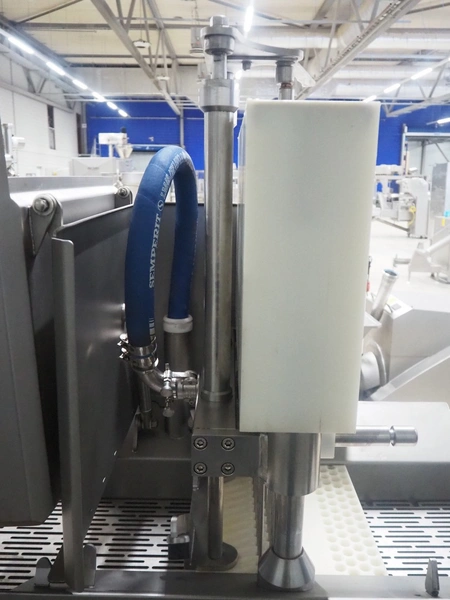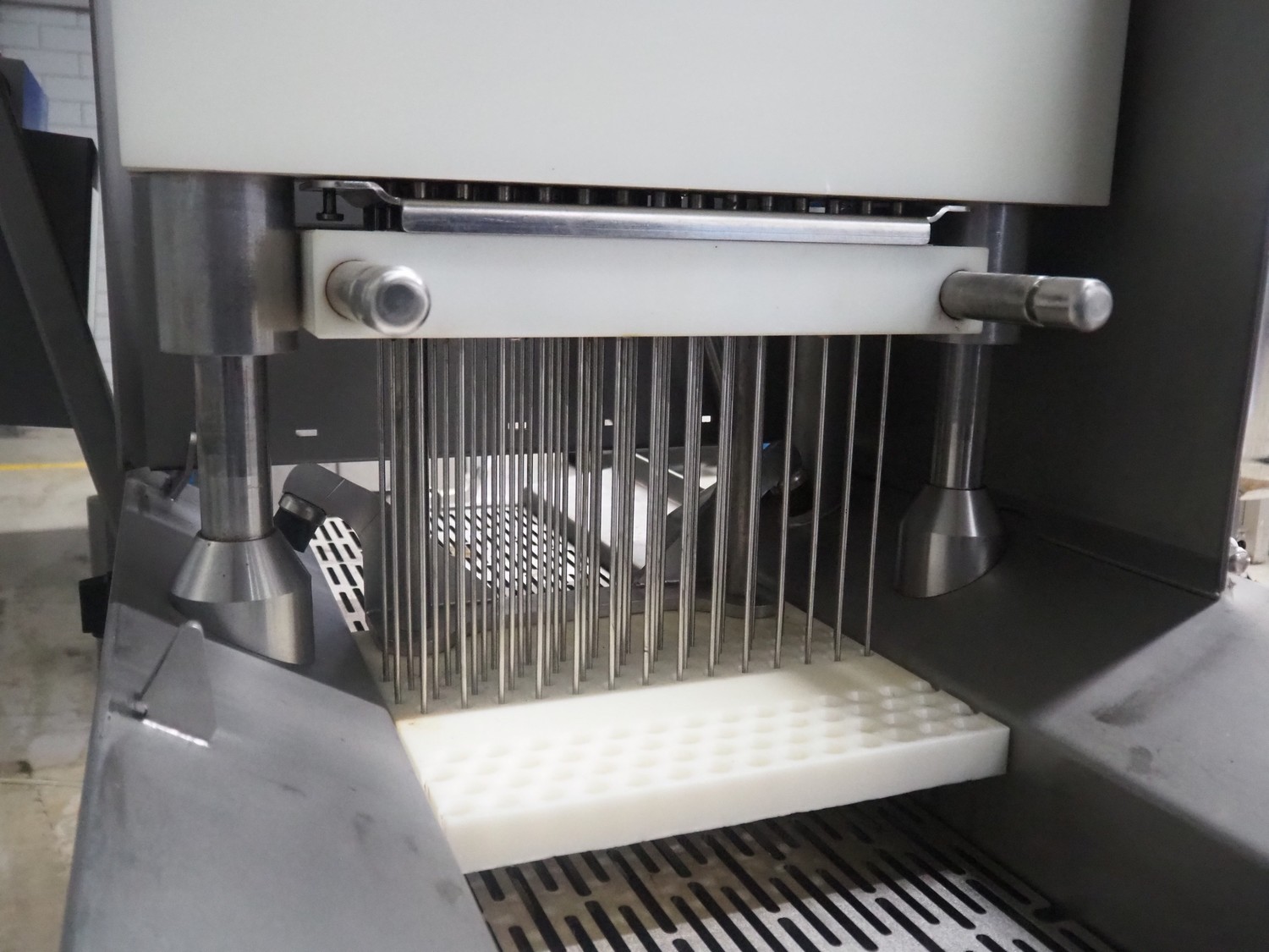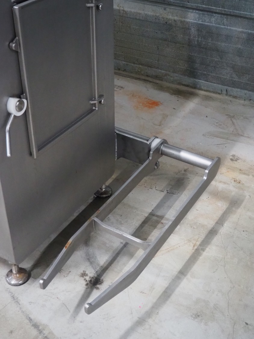 Rühle GmbH injector with lifter for crates, 56 needles, s/s walking beam, beam width: 340 mm, total dimensions: 1700 mm x 900 mm x 2000 mm.