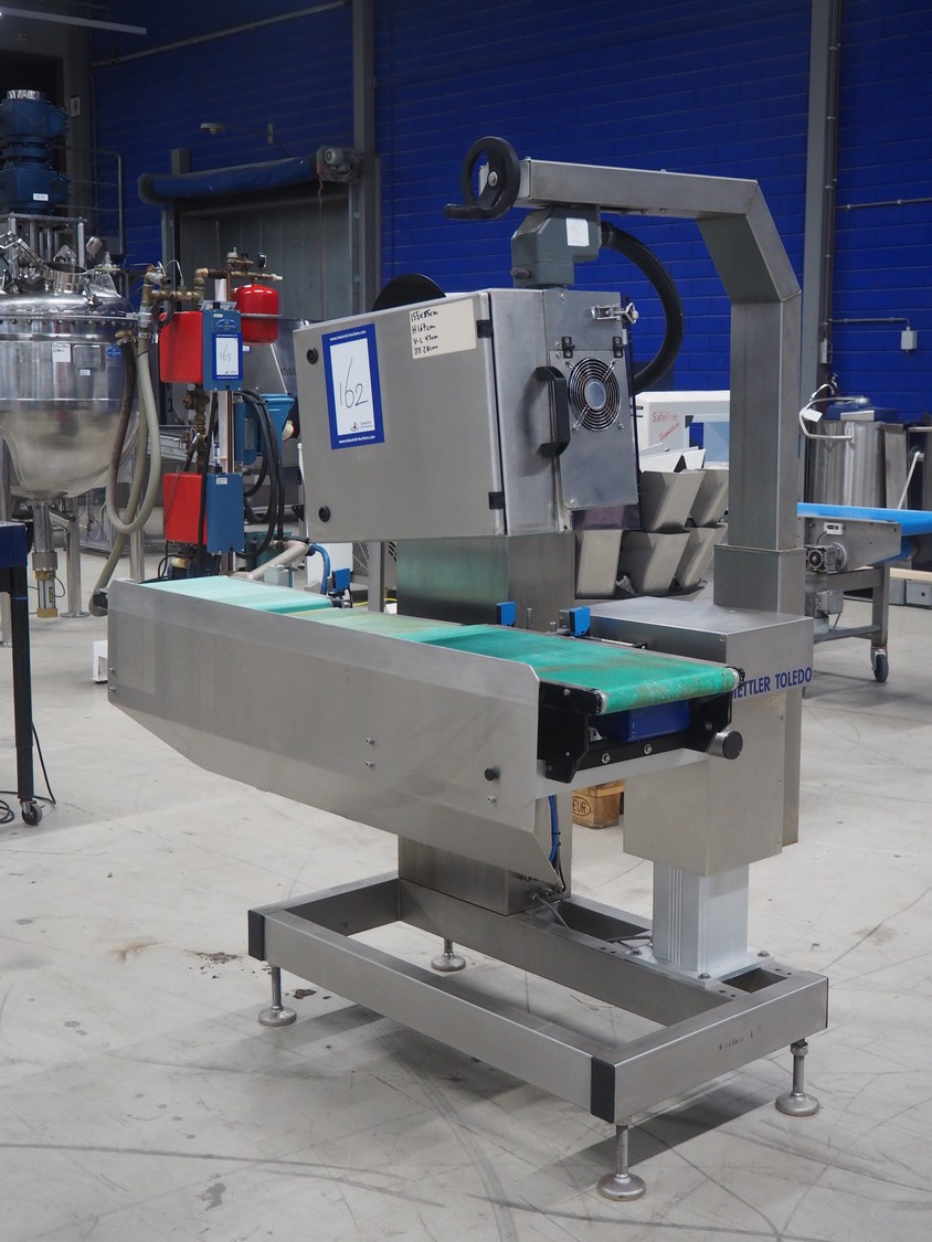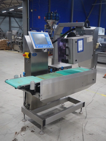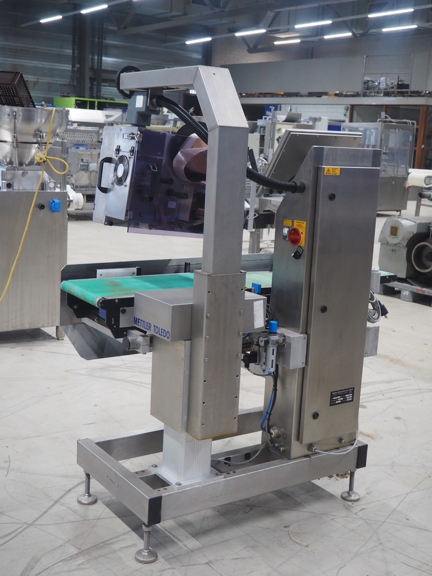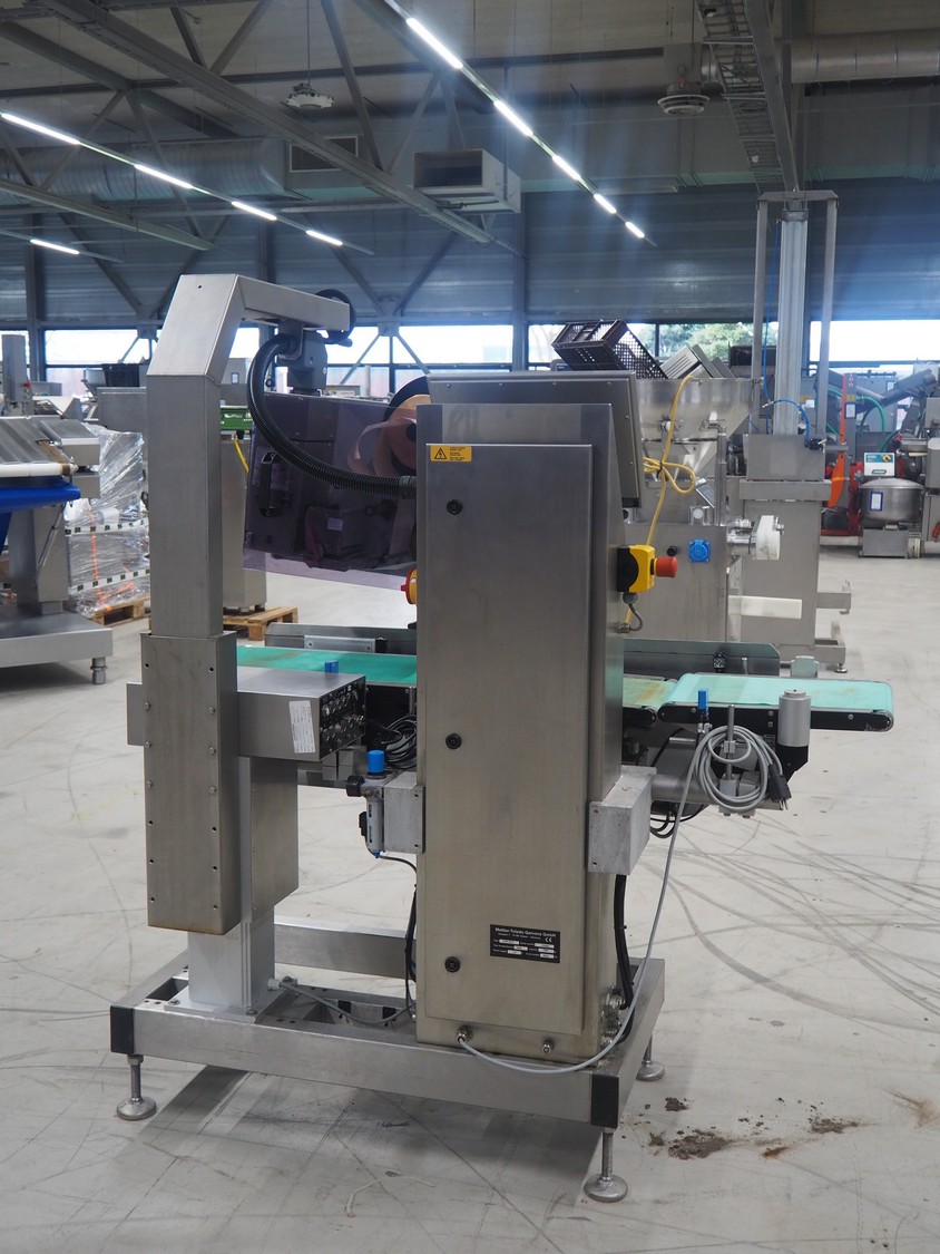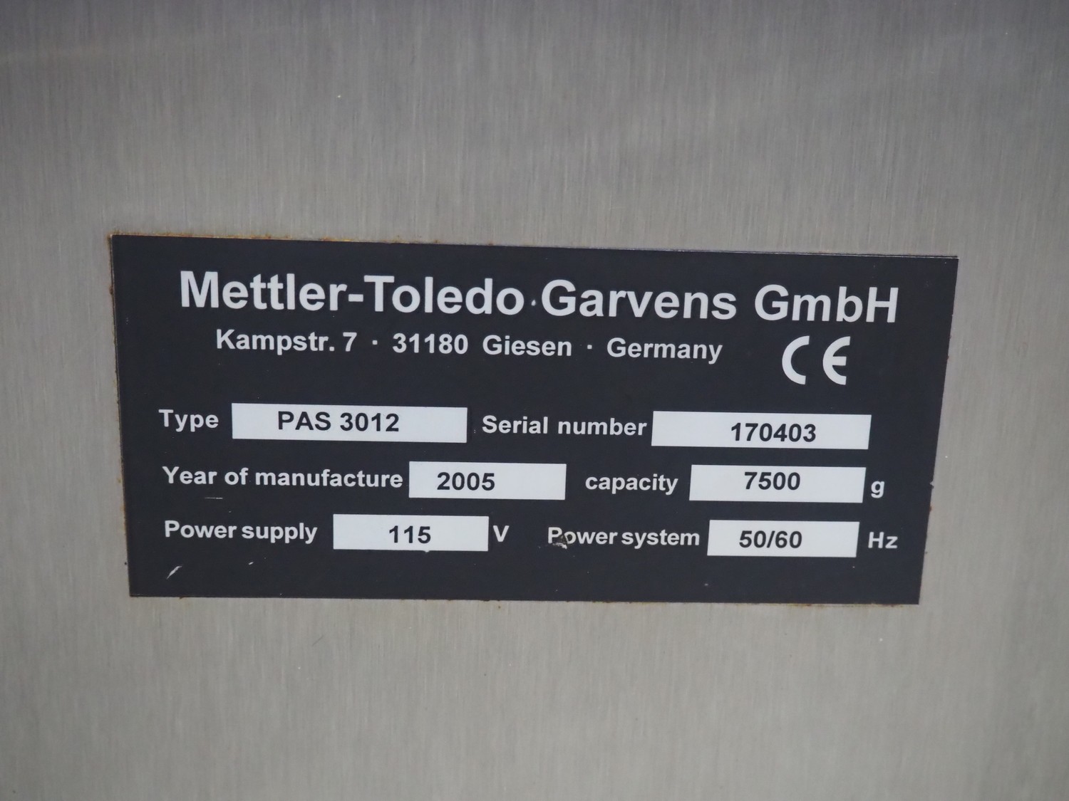 Mettler-Toledo Garvens GmbH weighing and labelling machine with top labeller, type: PAS 3012, serial number: 170403, year of construction: 2005, 115 V, 50/60 Hz, maximum weight: 7500 gram, plastic belt, belt width: 280 mm, 290 mm and 300 mm, total dimensions: 1560 mm x 850 mm x 1660 mm.